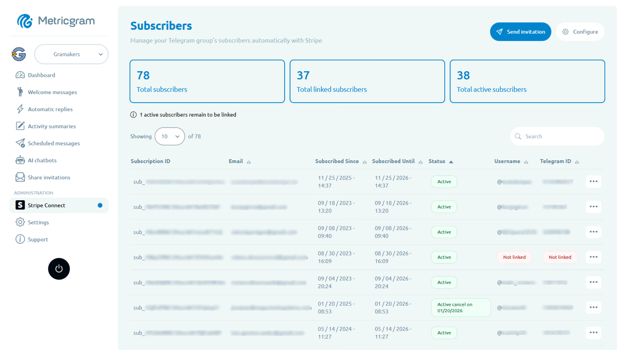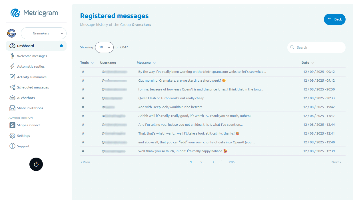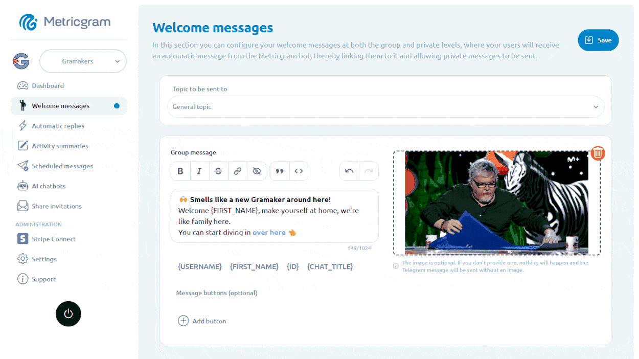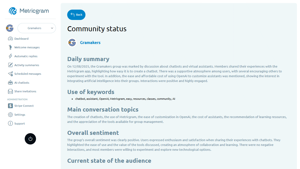 Save time managing your group or community on Telegram. Automate access to your group with Stripe, schedule messages, summaries, and automatic responses, analyze metrics and reports on everything that happens, add your own AI chatbot, and much more