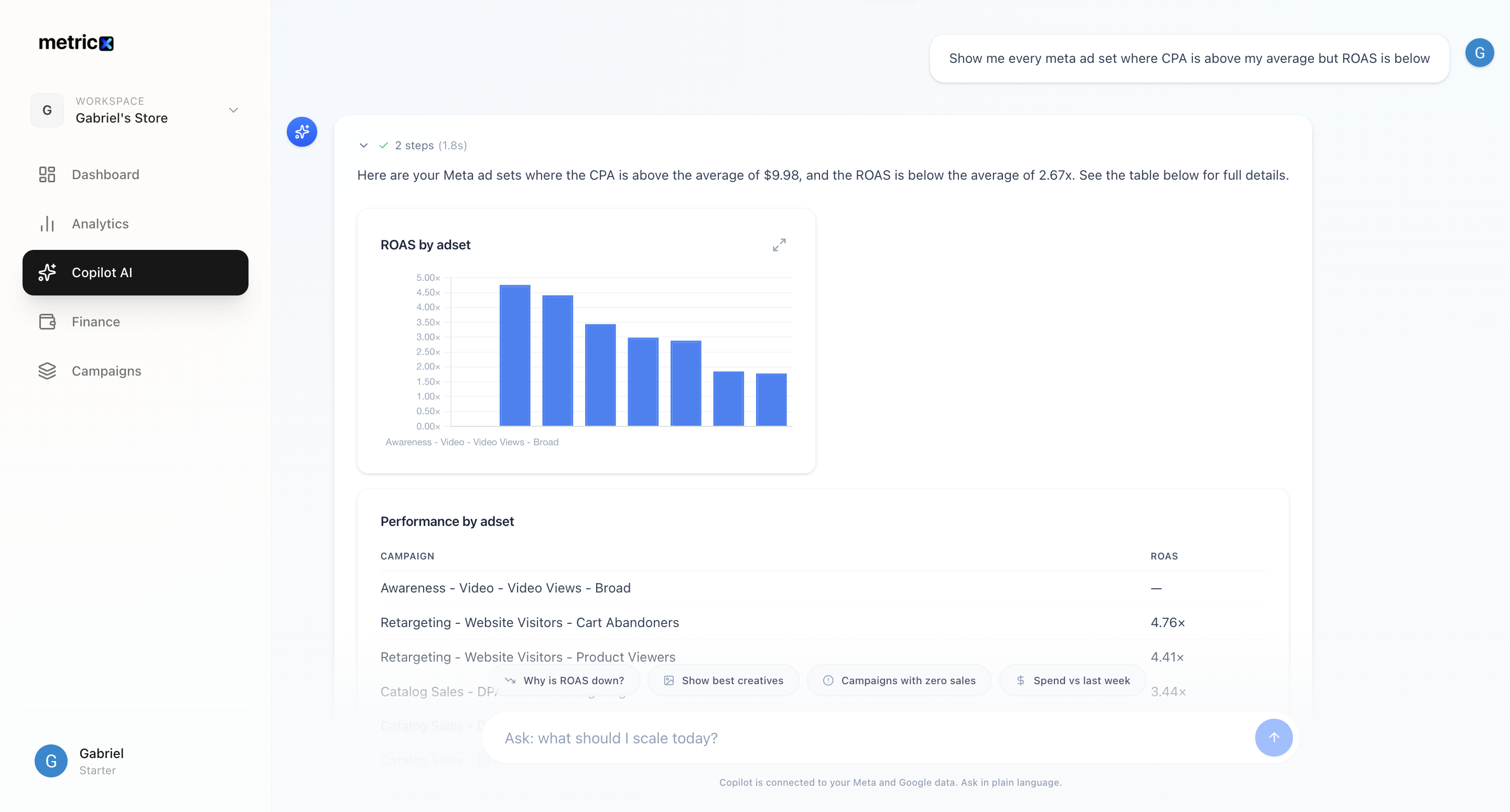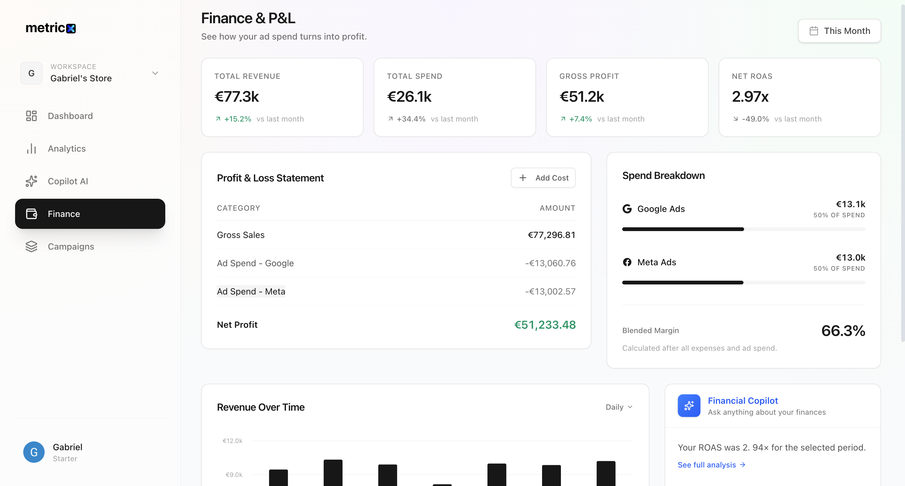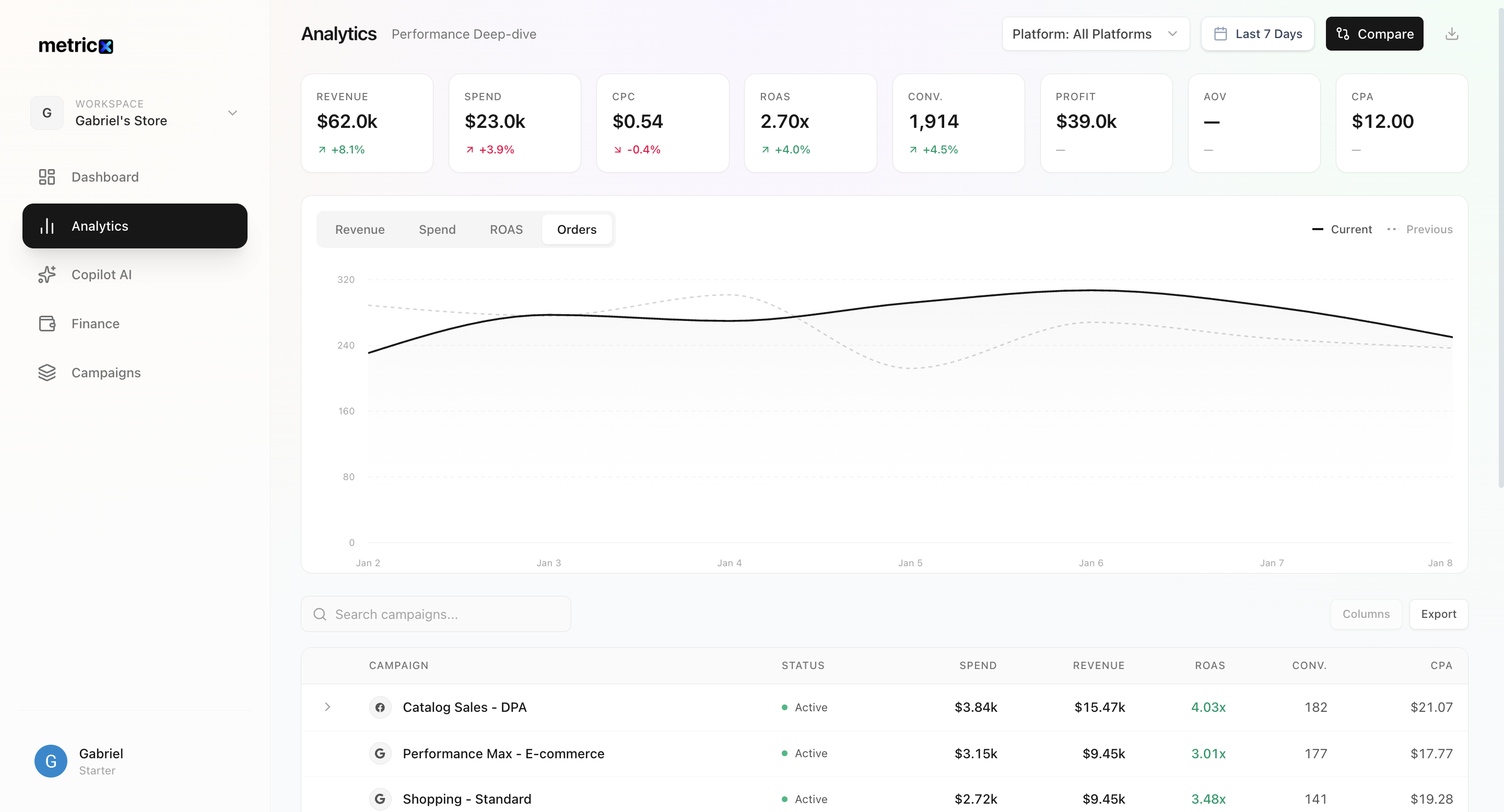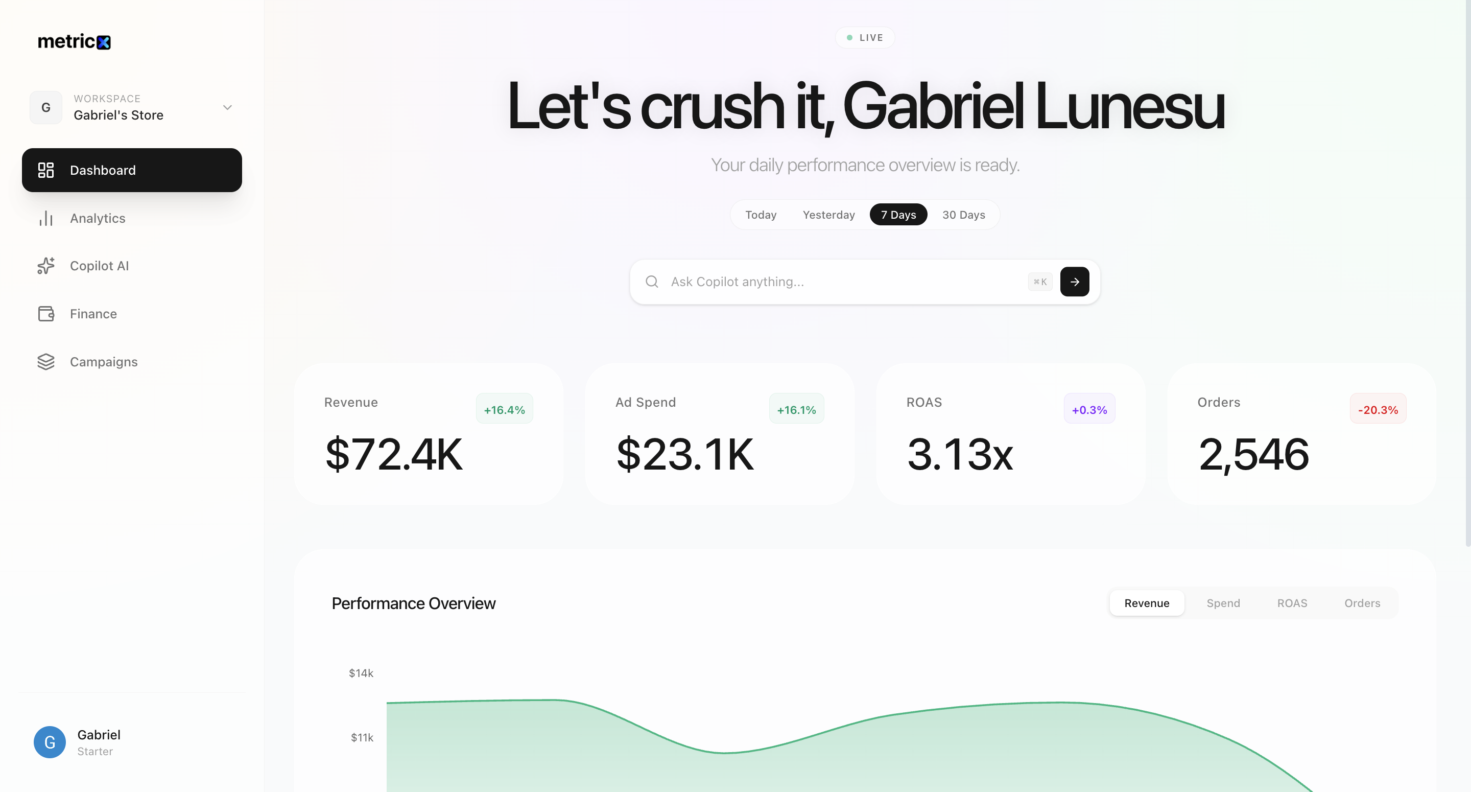 Get the most out of your advertising spend with metricx. Aggregate data from Meta Ads and Google Ads with AI-powered insights, real-time ROAS tracking, and unified analytics dashboard. Built for e-commerce.