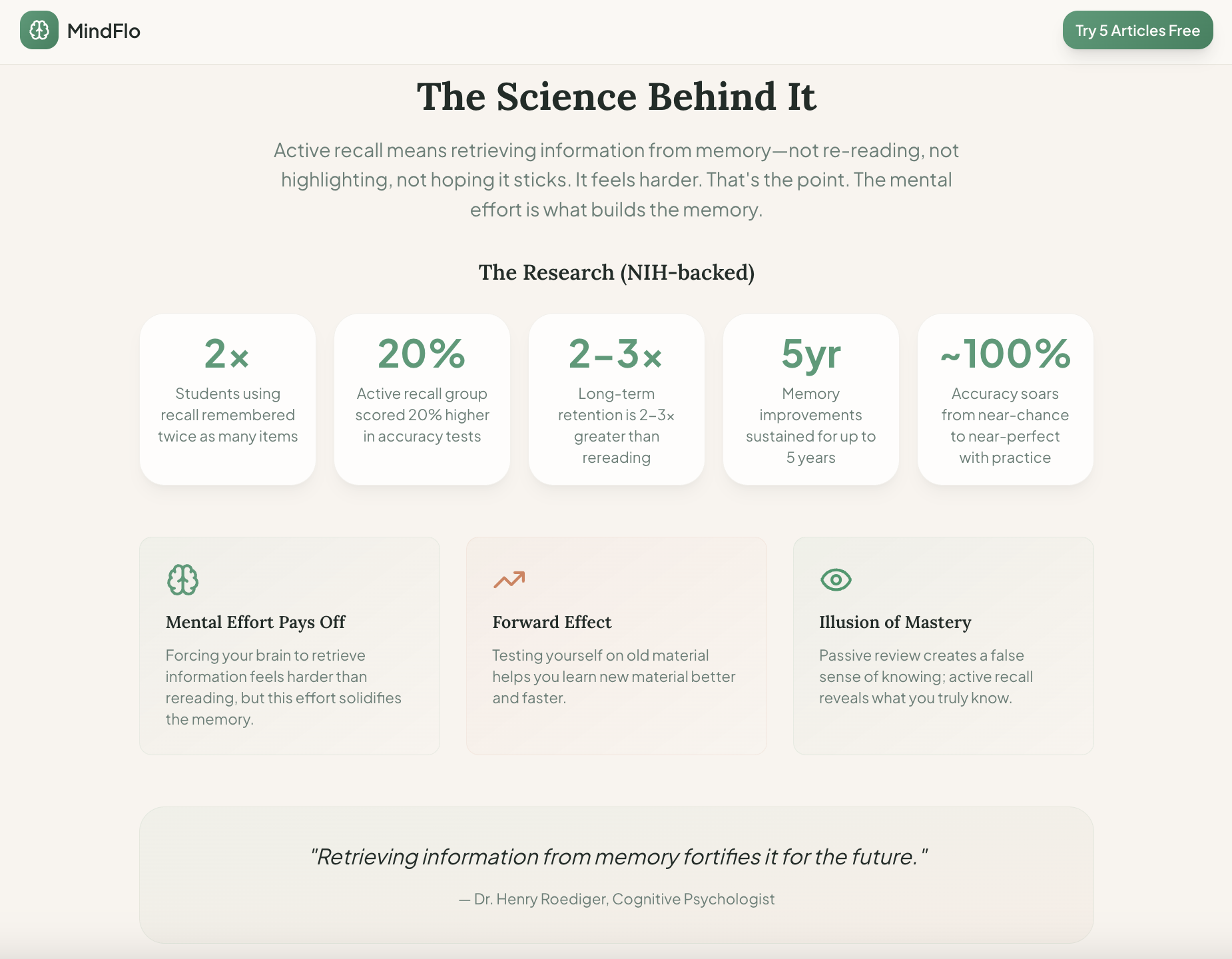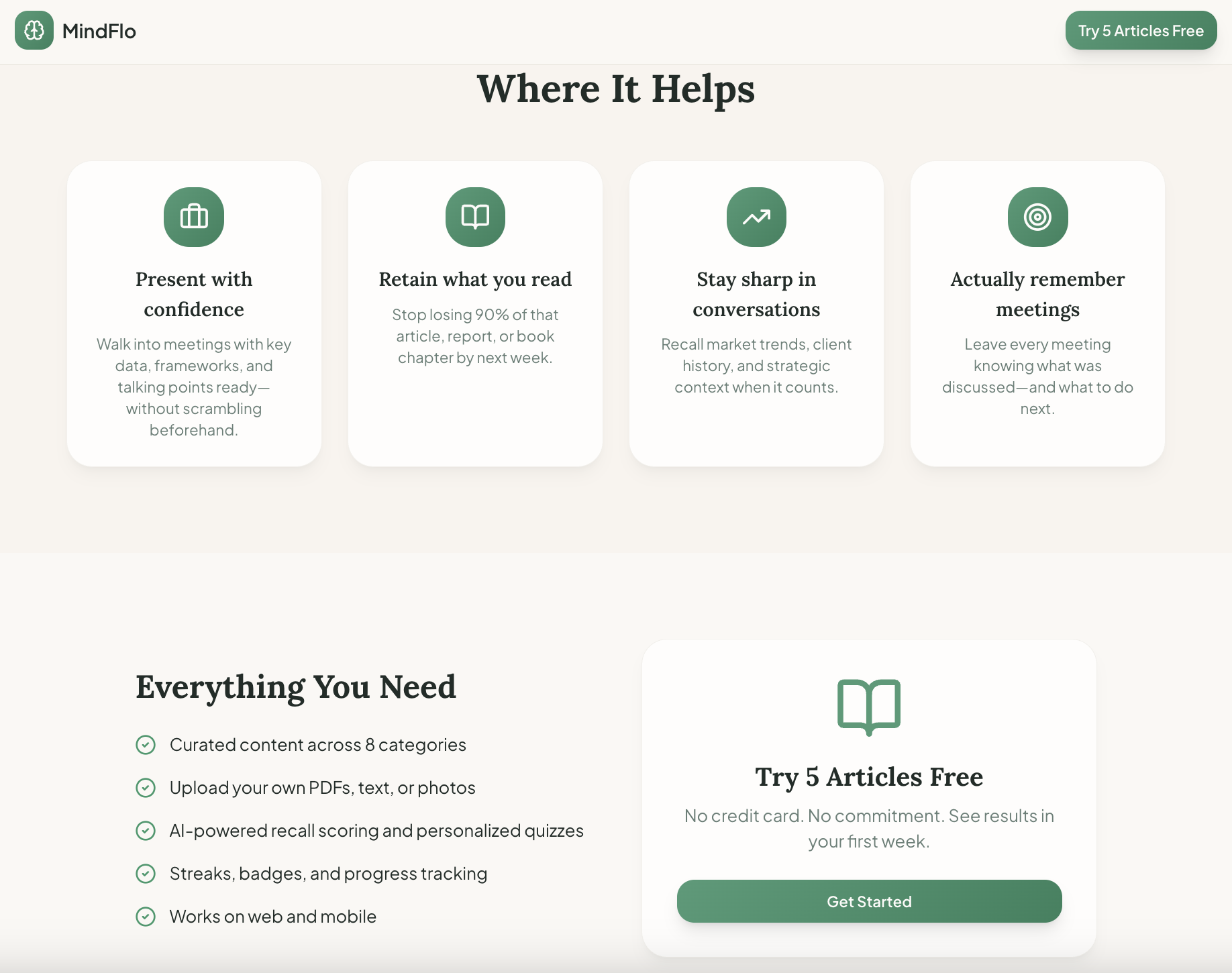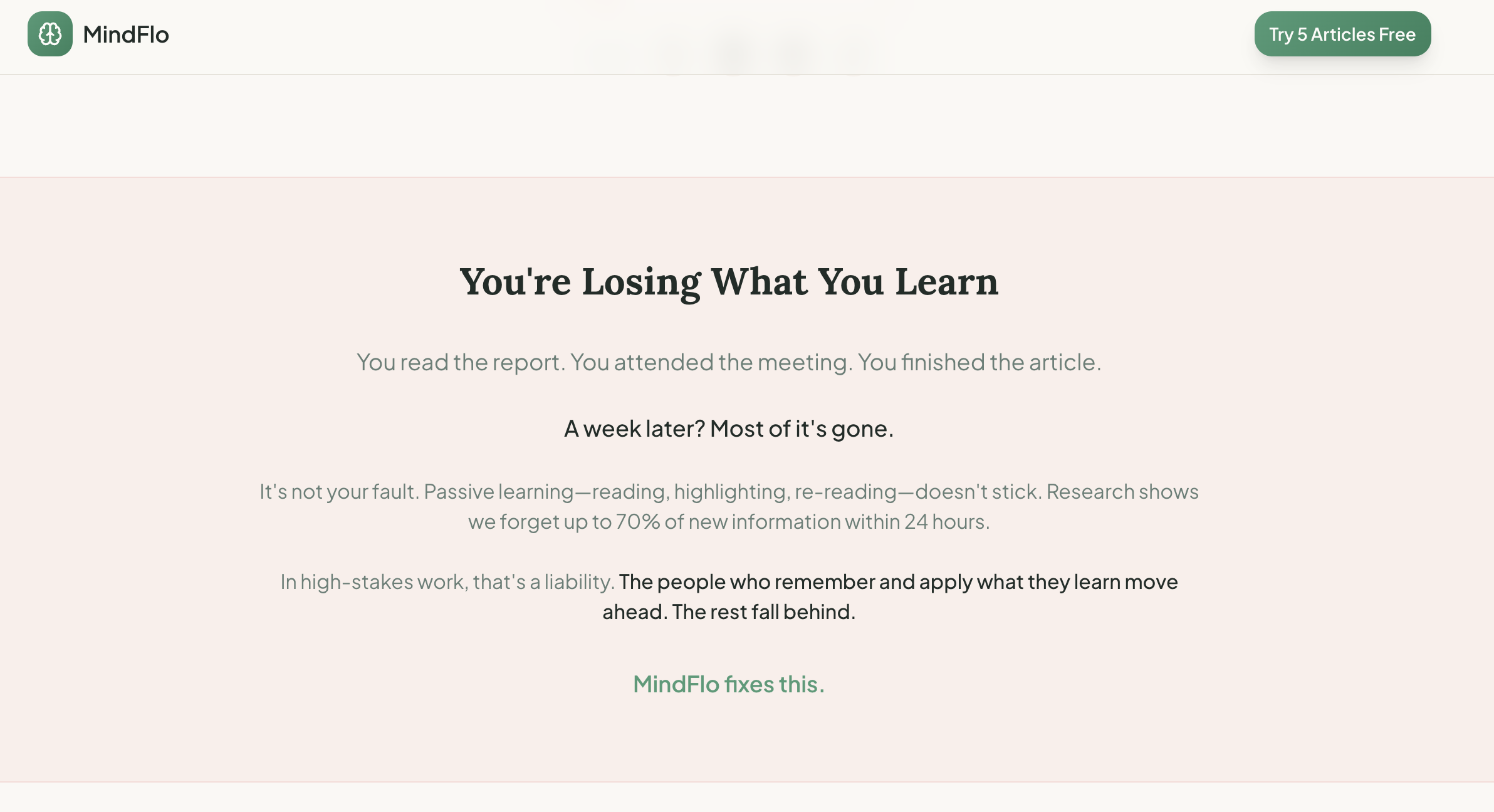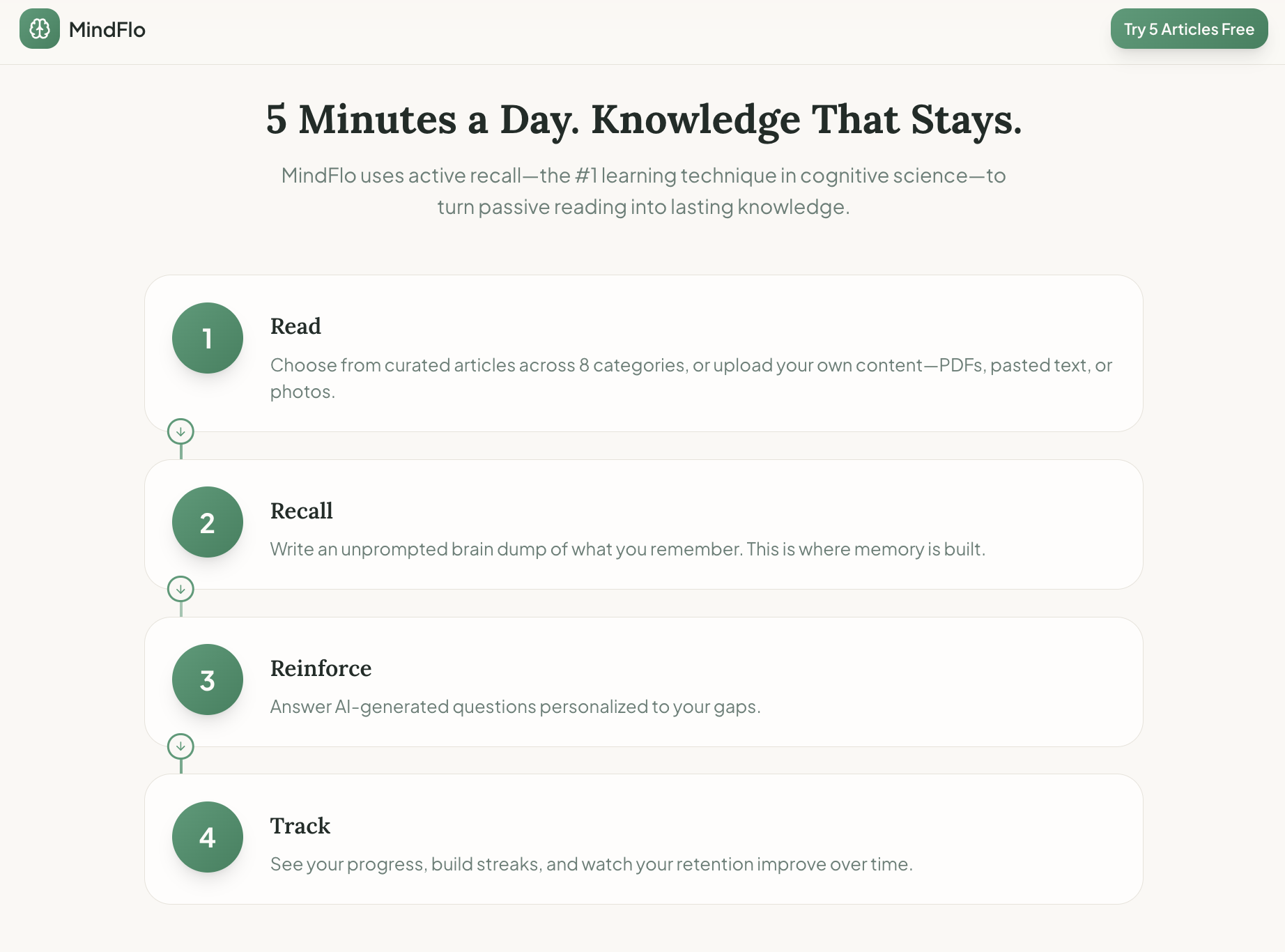 You read articles, attend meetings, and consume endless content—then forget most of it within days. MindFlo fixes this. It's a 5-minute daily workout for your memory using active recall, the #1 learning technique backed by decades of cognitive science. No flashcards. No cramming. Just a simple routine that helps busy professionals retain what matters and show up sharper in meetings, presentations, and high-stakes moments. Upload your own content or learn from curated articles. 5 articles free.