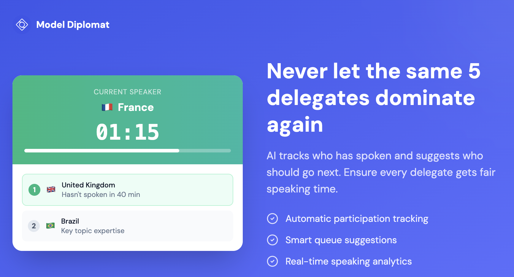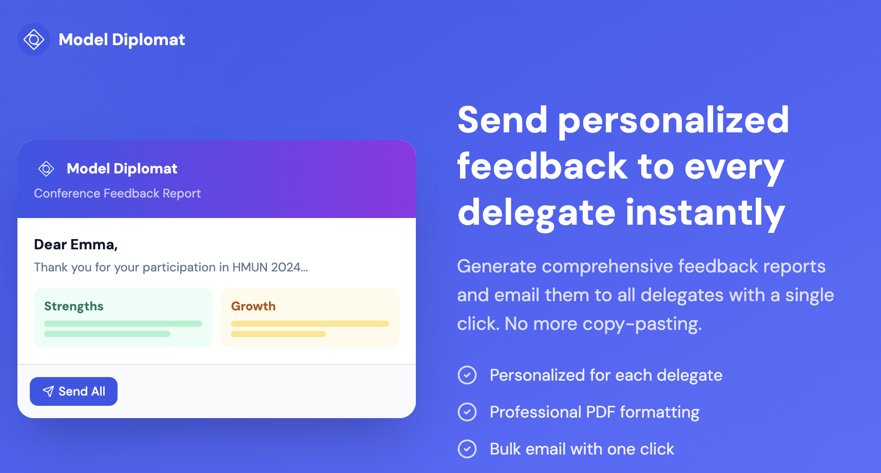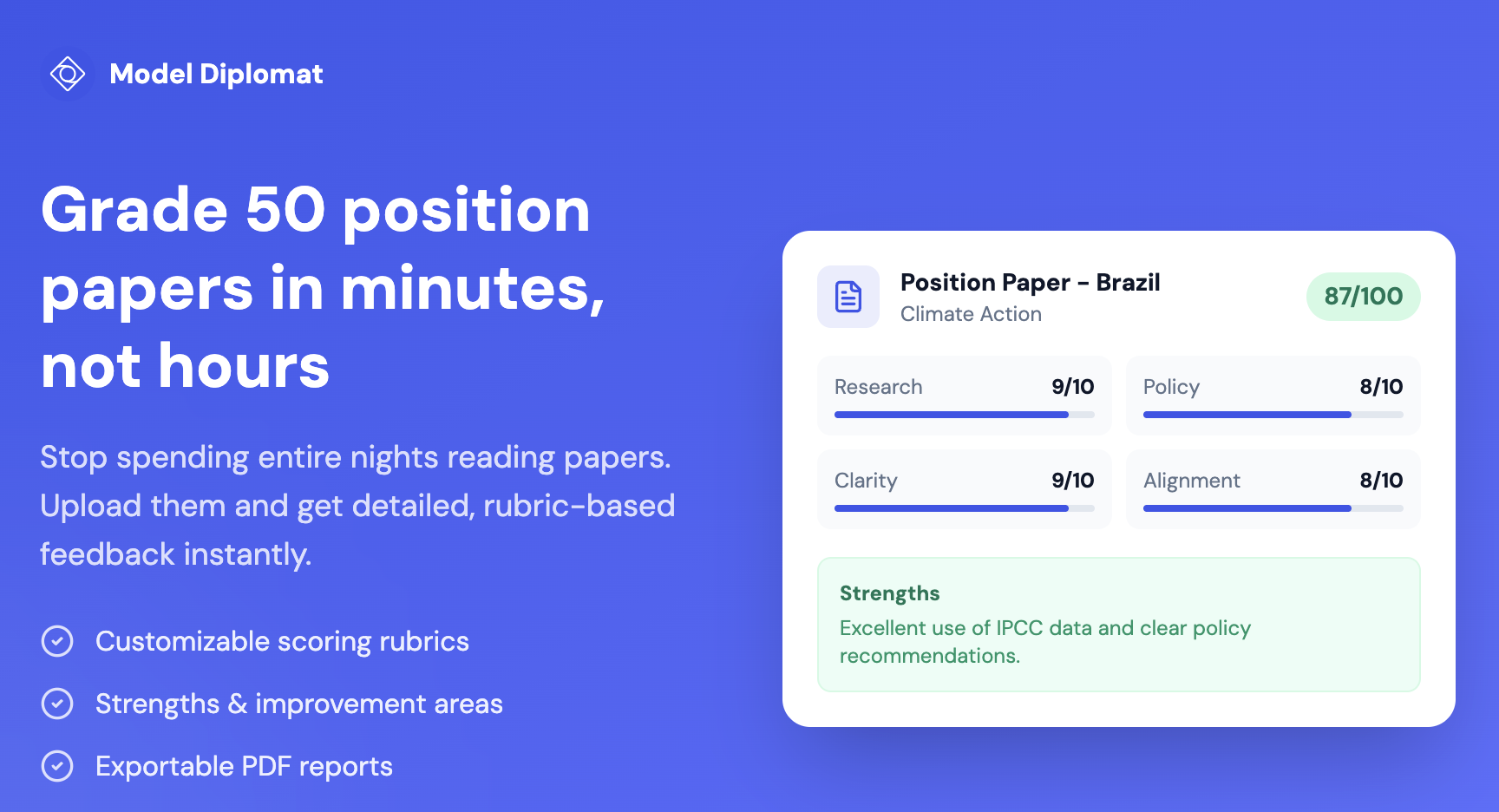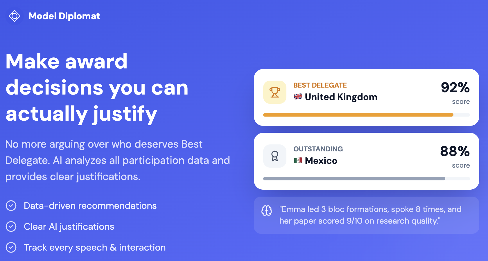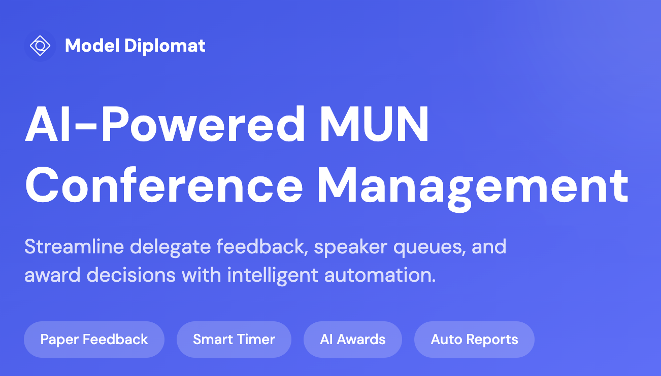 Model Diplomat helps MUN delegates research faster with AI that actually reads high-quality diplomatic sources—no Reddit citations here. Now launching tools for organizers: give delegates meaningful, AI-powered feedback without drowning in notes.