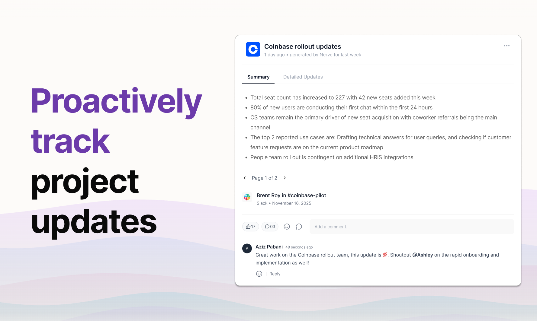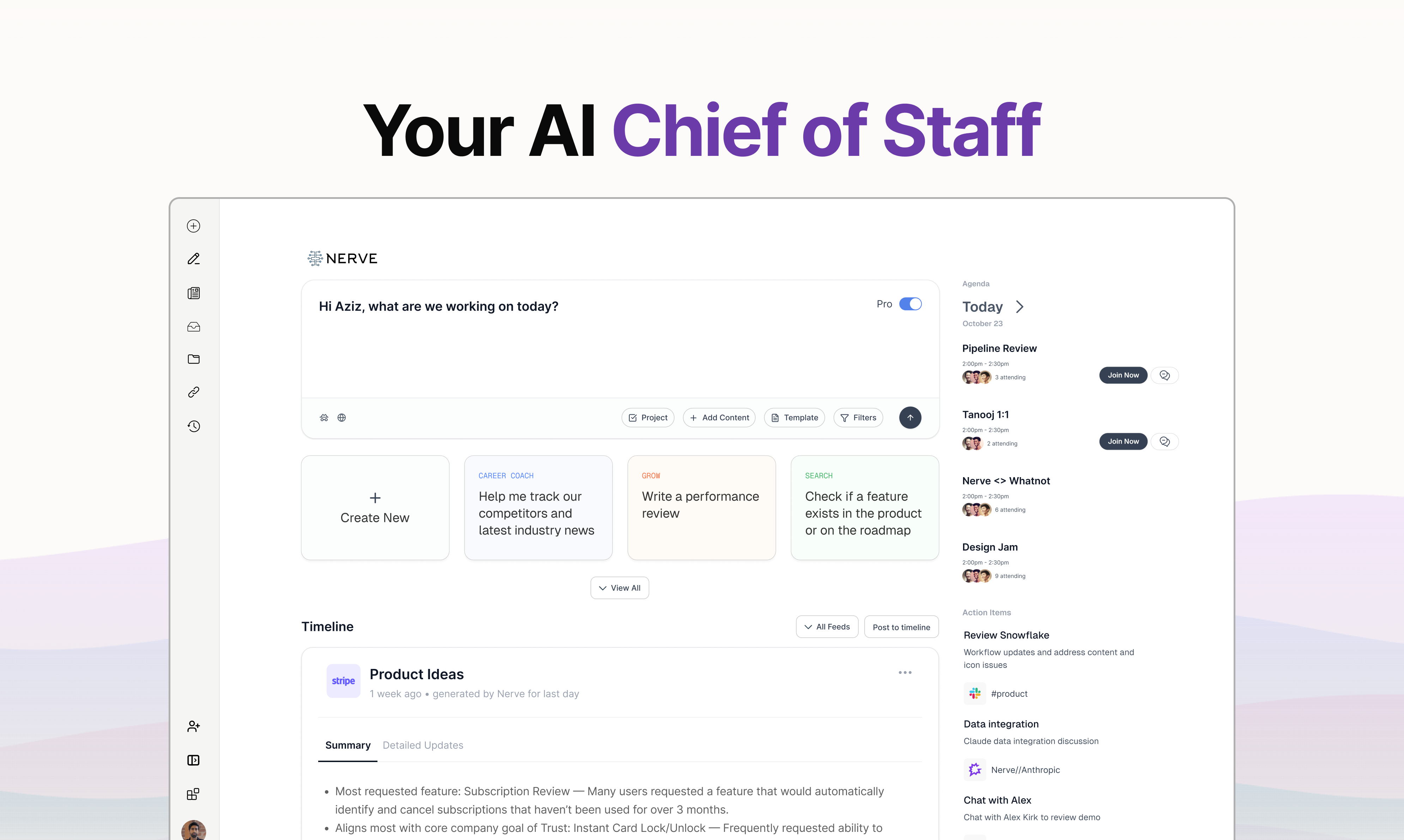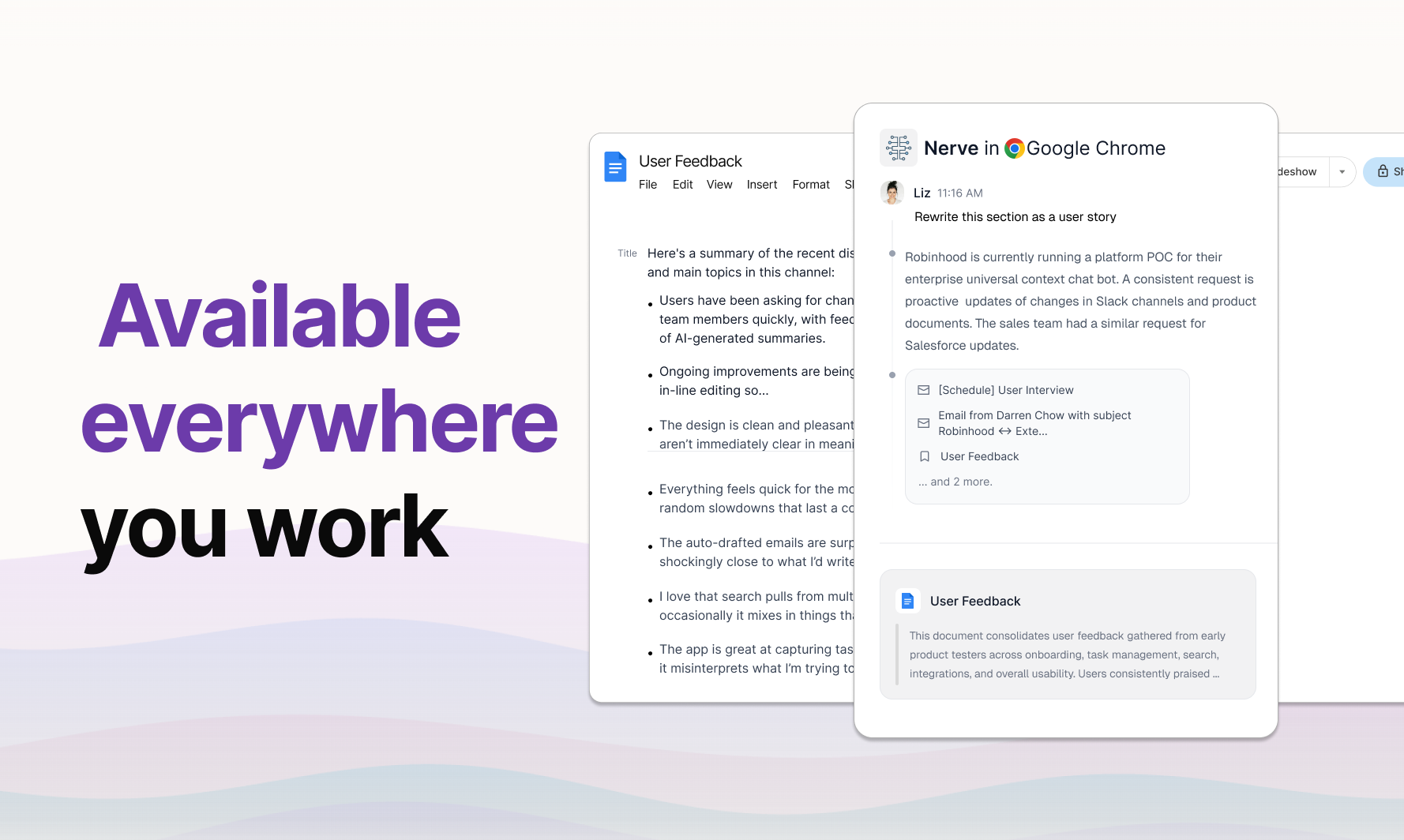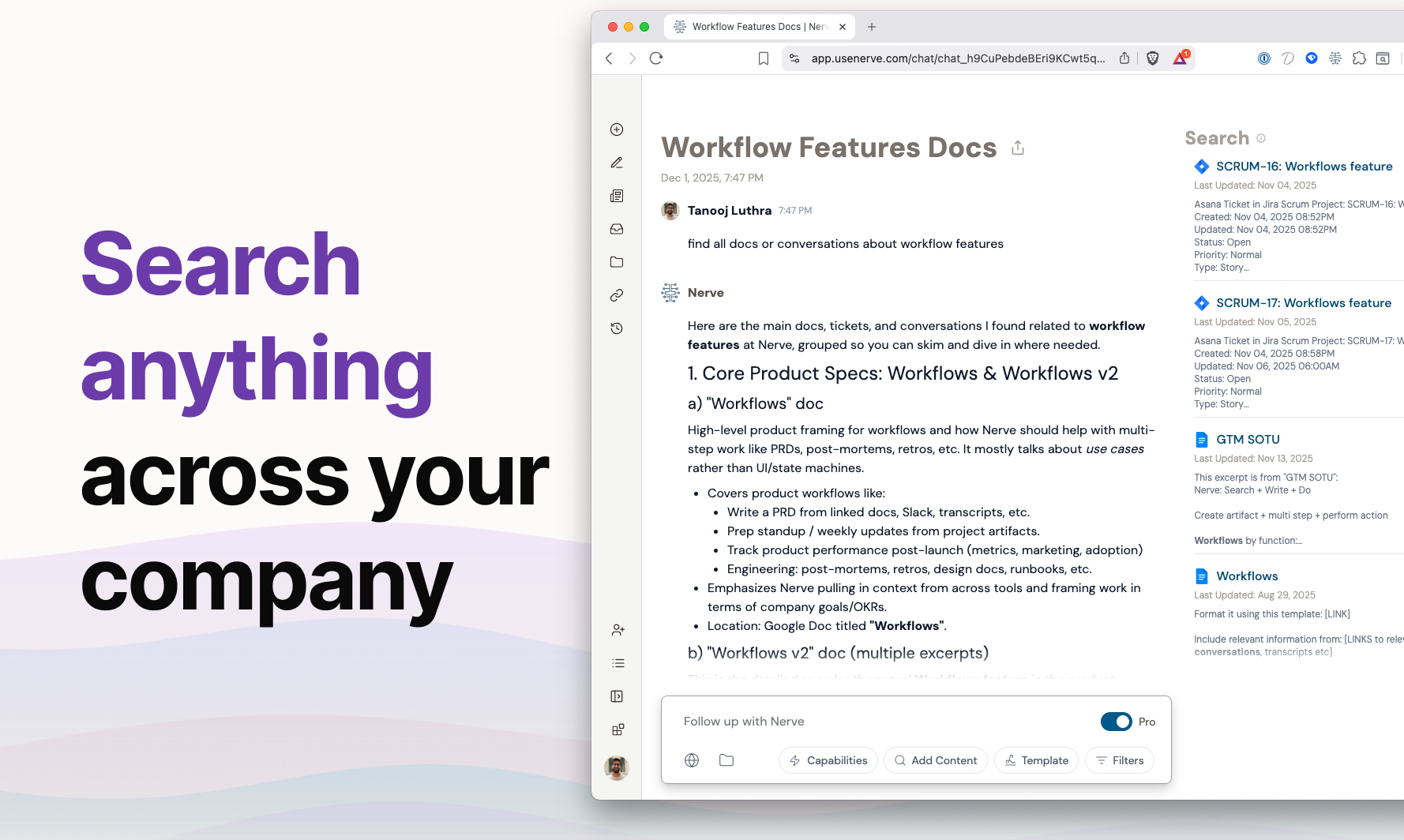 Nerve connects to the apps your team already uses, searches through your internal content, and automates your most common workflows. It handles everything from writing docs, to updating your CRM, creating tickets in JIRA, and responding to emails. Even more, it proactively surfaces your most important to-dos and team updates. Nerve is enterprise ready, with SOC 2 compliance, SAML/SSO support, and never trains on your data.