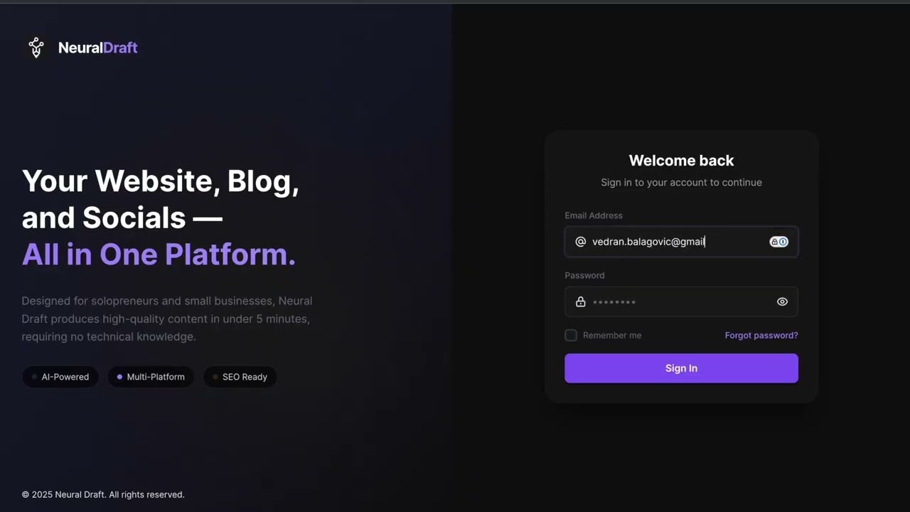 Create content, launch your site, and distribute everywhere - automatically. Designed for solopreneurs and small businesses, Neural Draft produces high-quality content in under 5 minutes, requiring no technical knowledge. Stop wasting time and money on fragmented tools.
