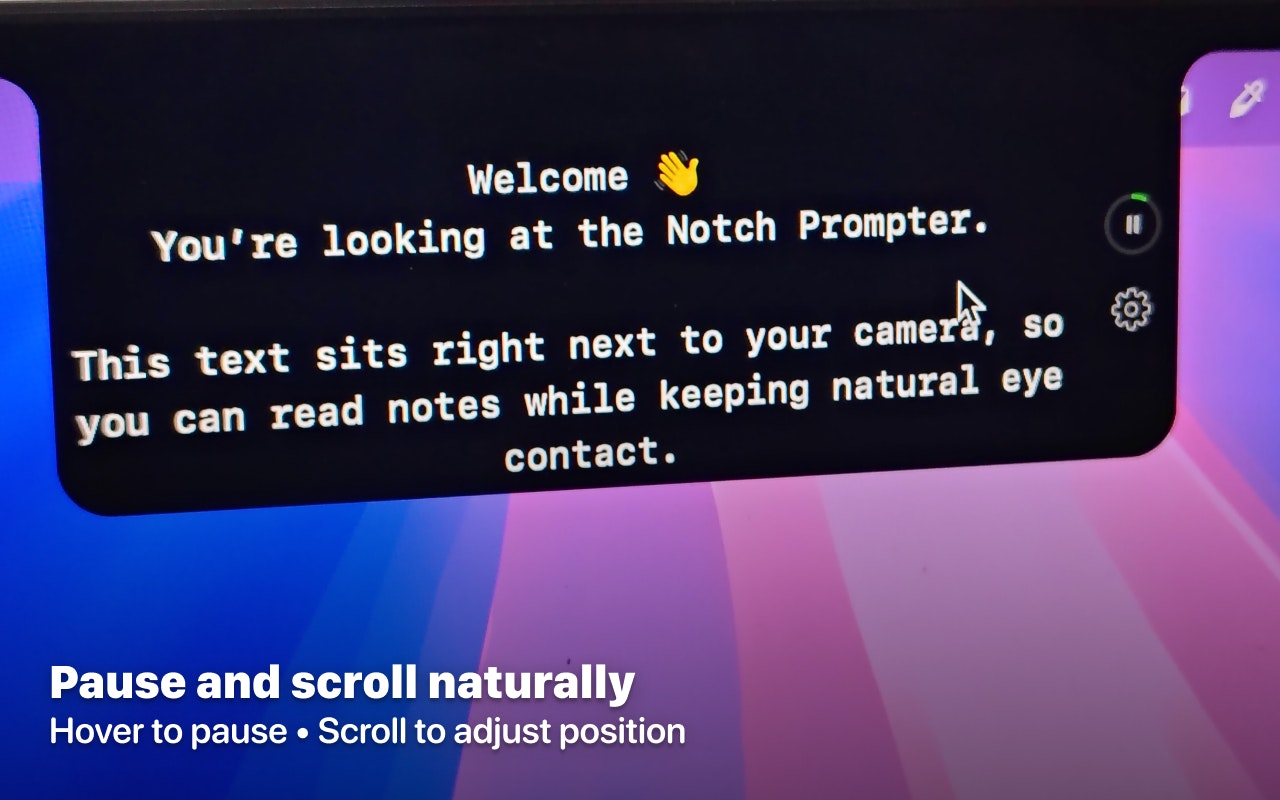 Mac teleprompter that sits in your MacBook notch — right below the camera. Read your script while looking directly at the lens. 🎙️ Voice-synced scrolling — text follows your speaking pace. Pause, it waits. Speed up, it keeps pace. 👻 Invisible during screen sharing — hidden on Zoom, Meet, Teams. They see slides, you see your script. Perfect for sales calls, webinars, recordings, interviews.