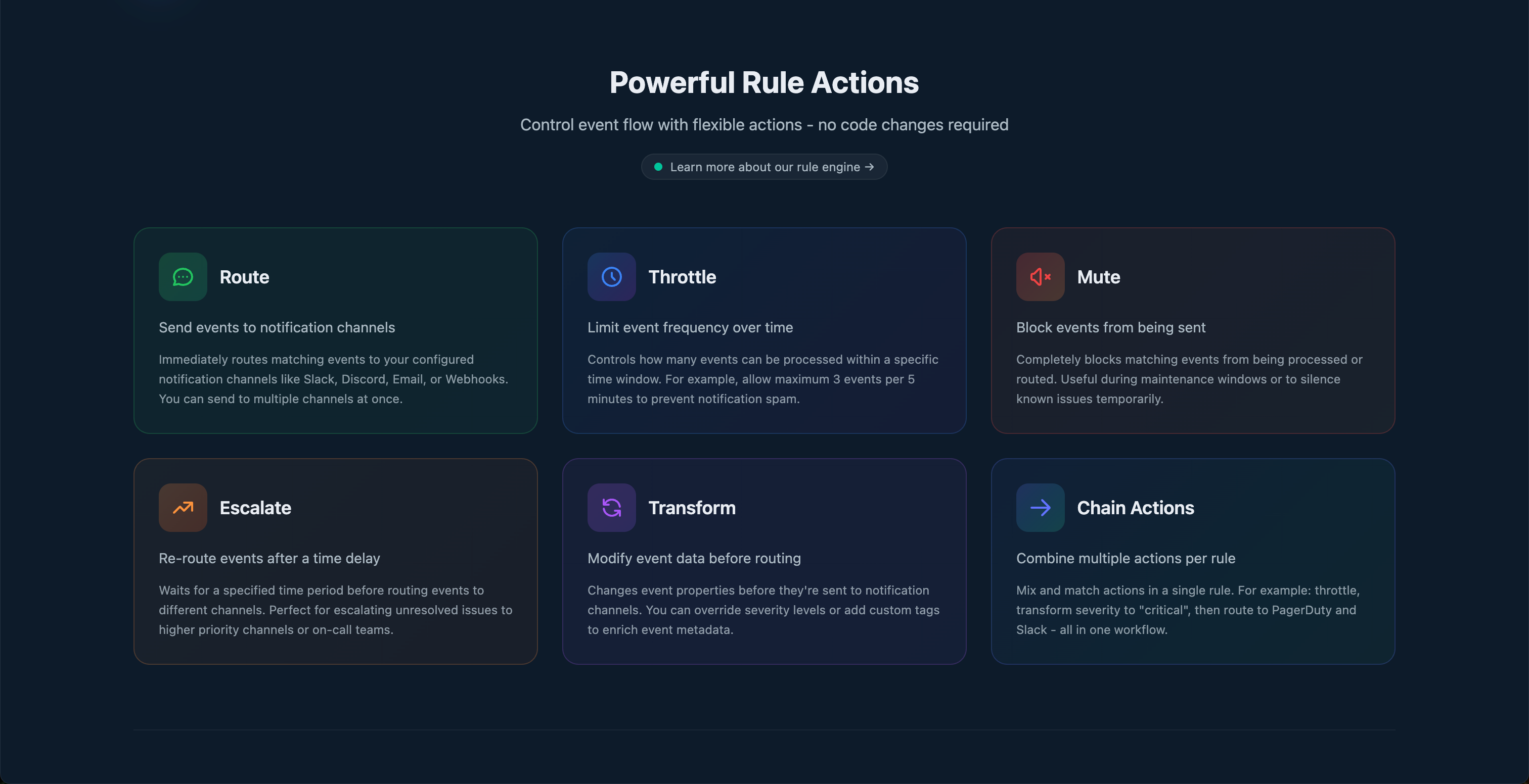 Control your notifications without code changes. Route to Slack, Discord, Email & more. Mute noisy alerts, throttle chatty services, and escalate critical issues—all from a web UI. Built-in retries, real-time dashboards & AI agent integration.