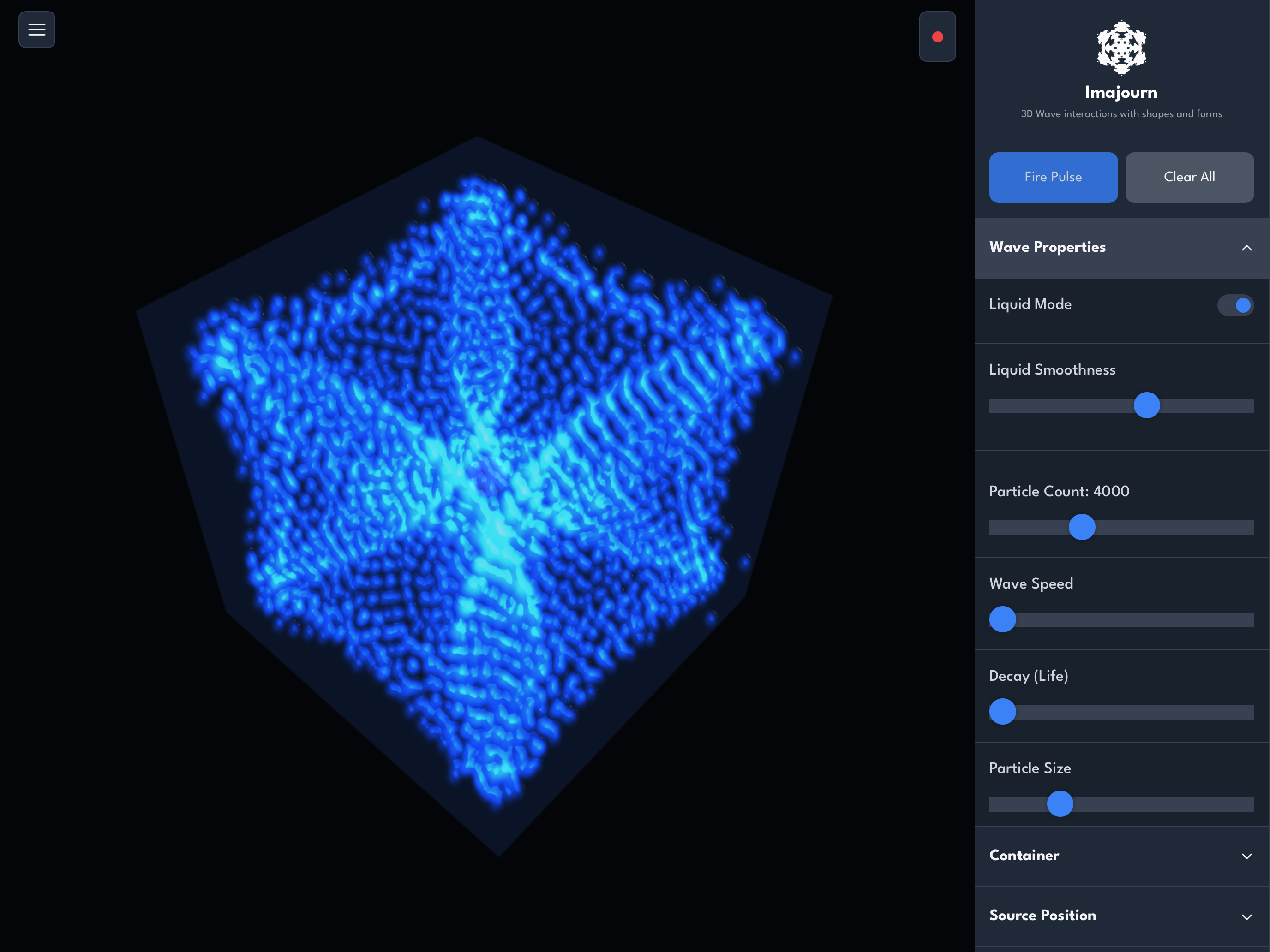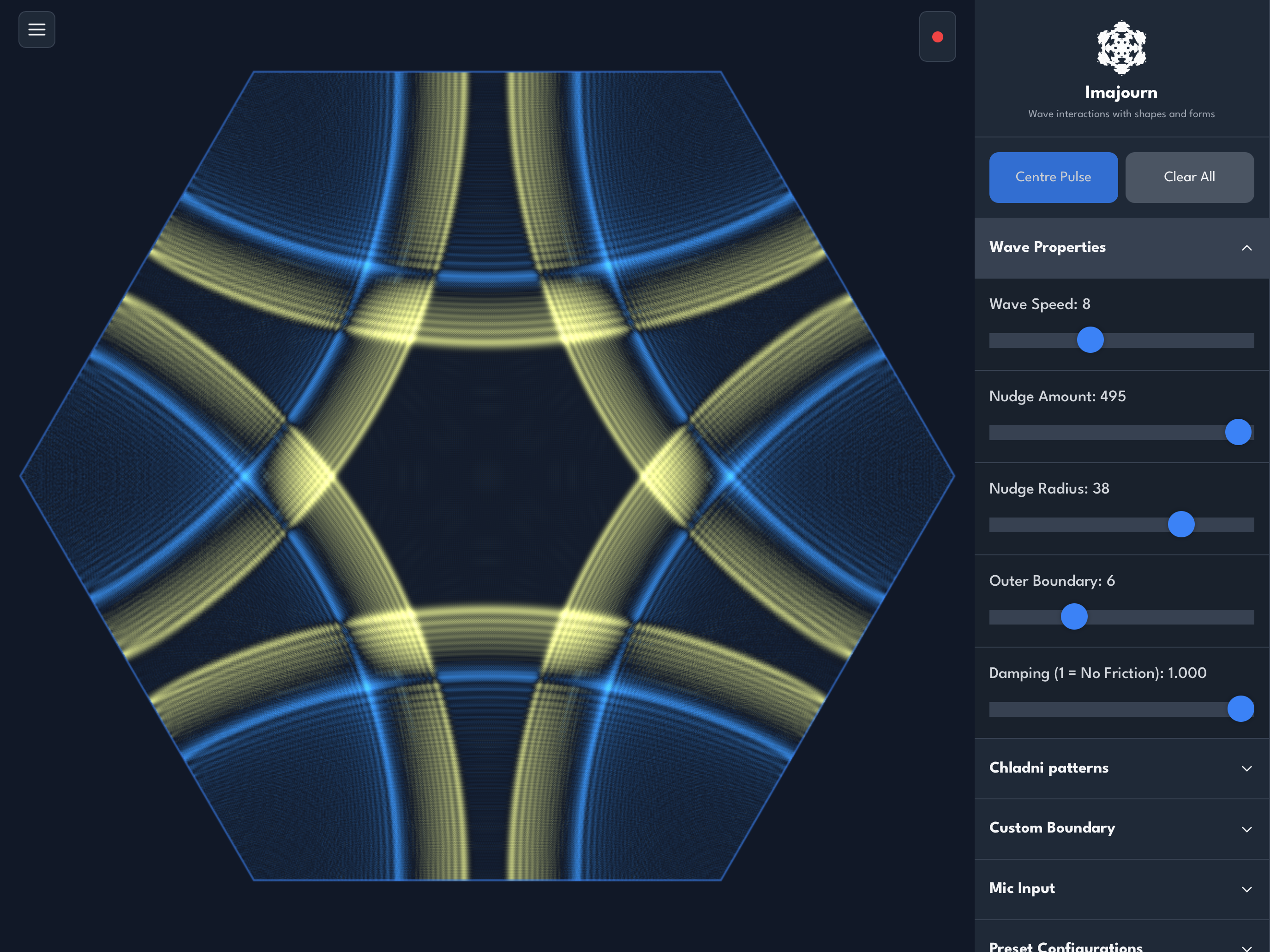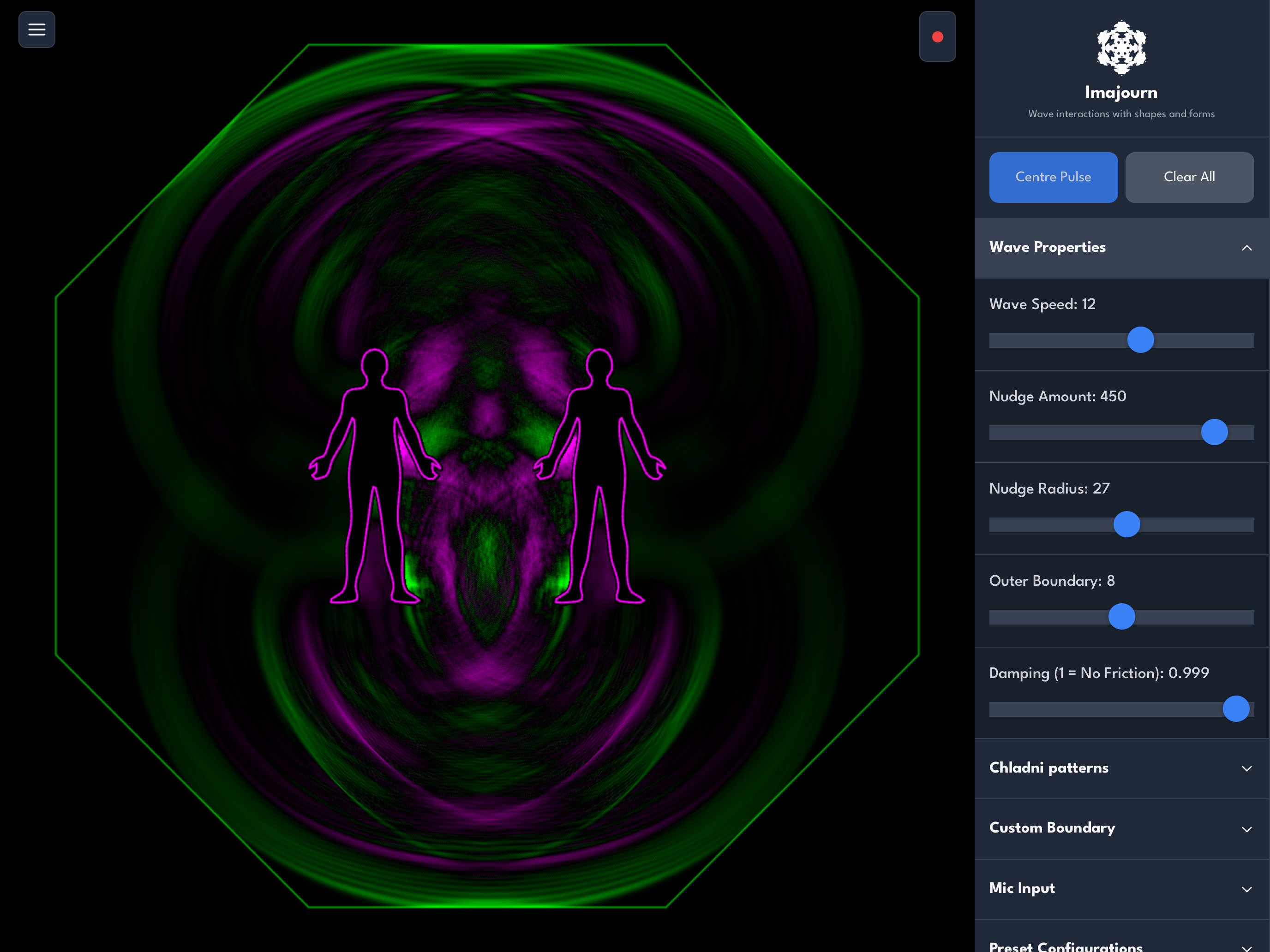 Imajourn is an interactive simulation sandbox that brings the physics of waves and sound to life. Whether you are an artist, a physics enthusiast, or a meditator, Imajourn offers a mesmerizing playground of light, motion, and geometry. Imajourn has moved from its early open source webapp version (Numatics) to a fully functional App Store app with new name and branding, and many new features: Interactive wave sim, chladni patterns and cymatics, audio reactivity, 3D particle sim, presets and more!