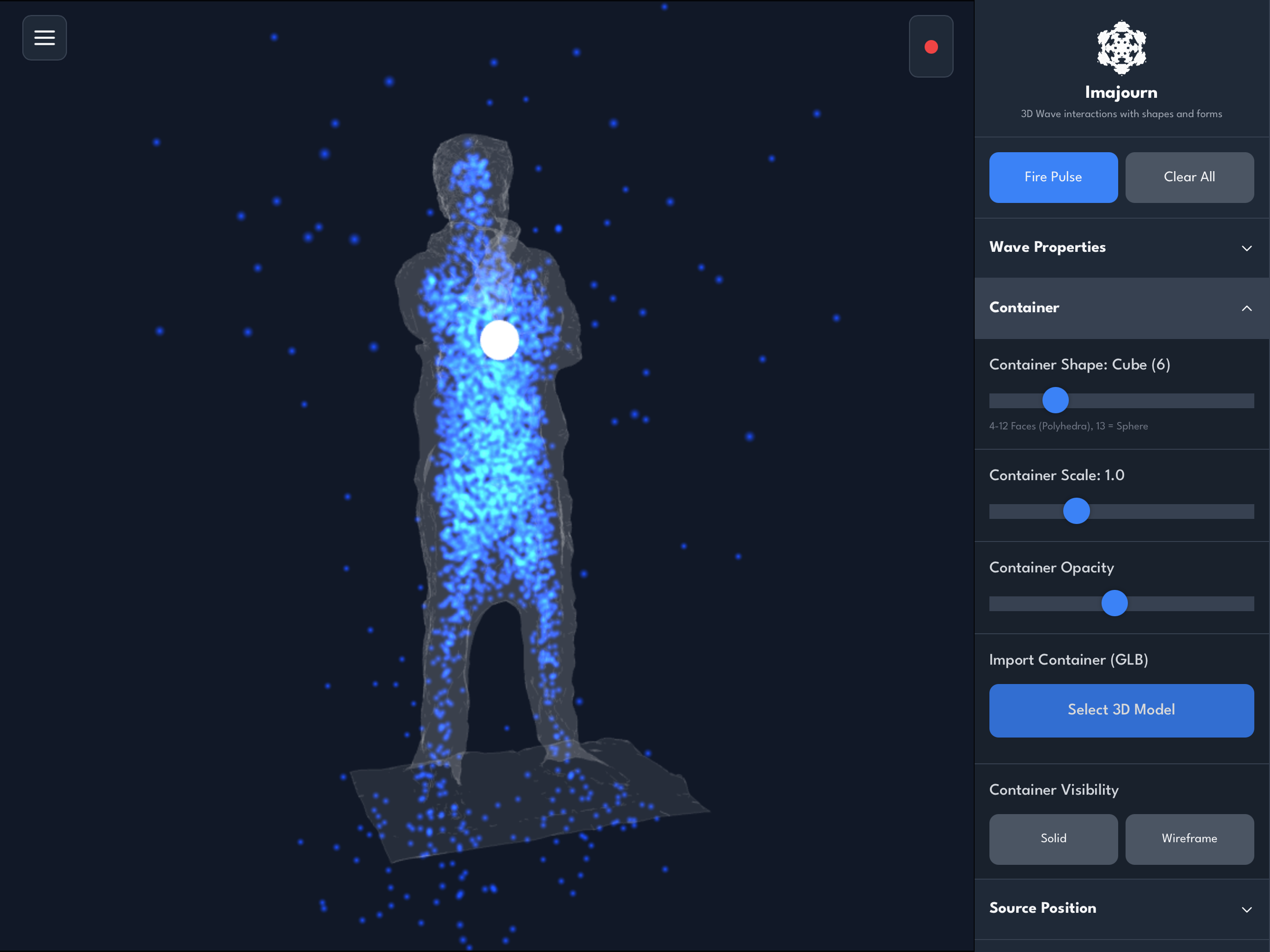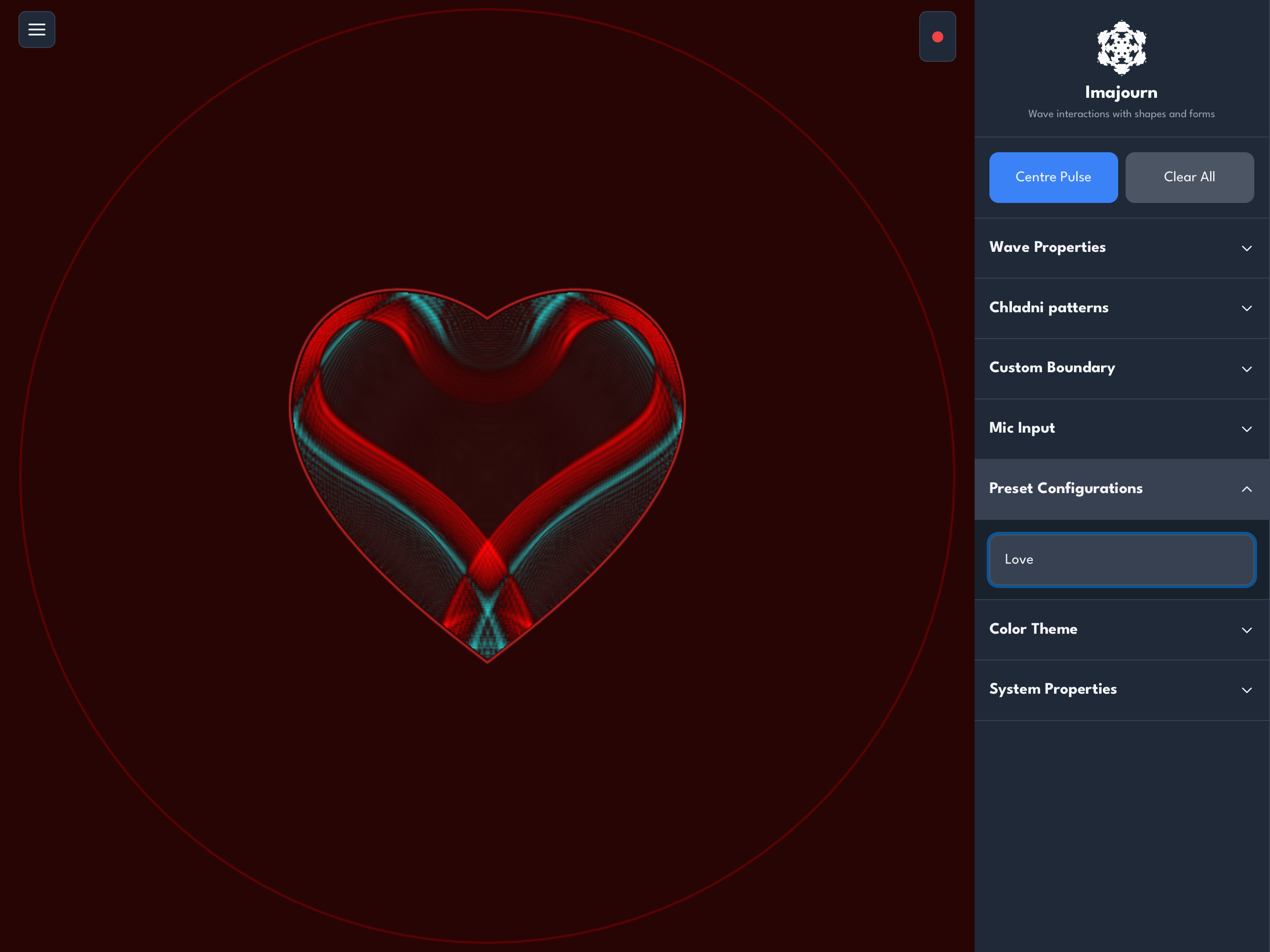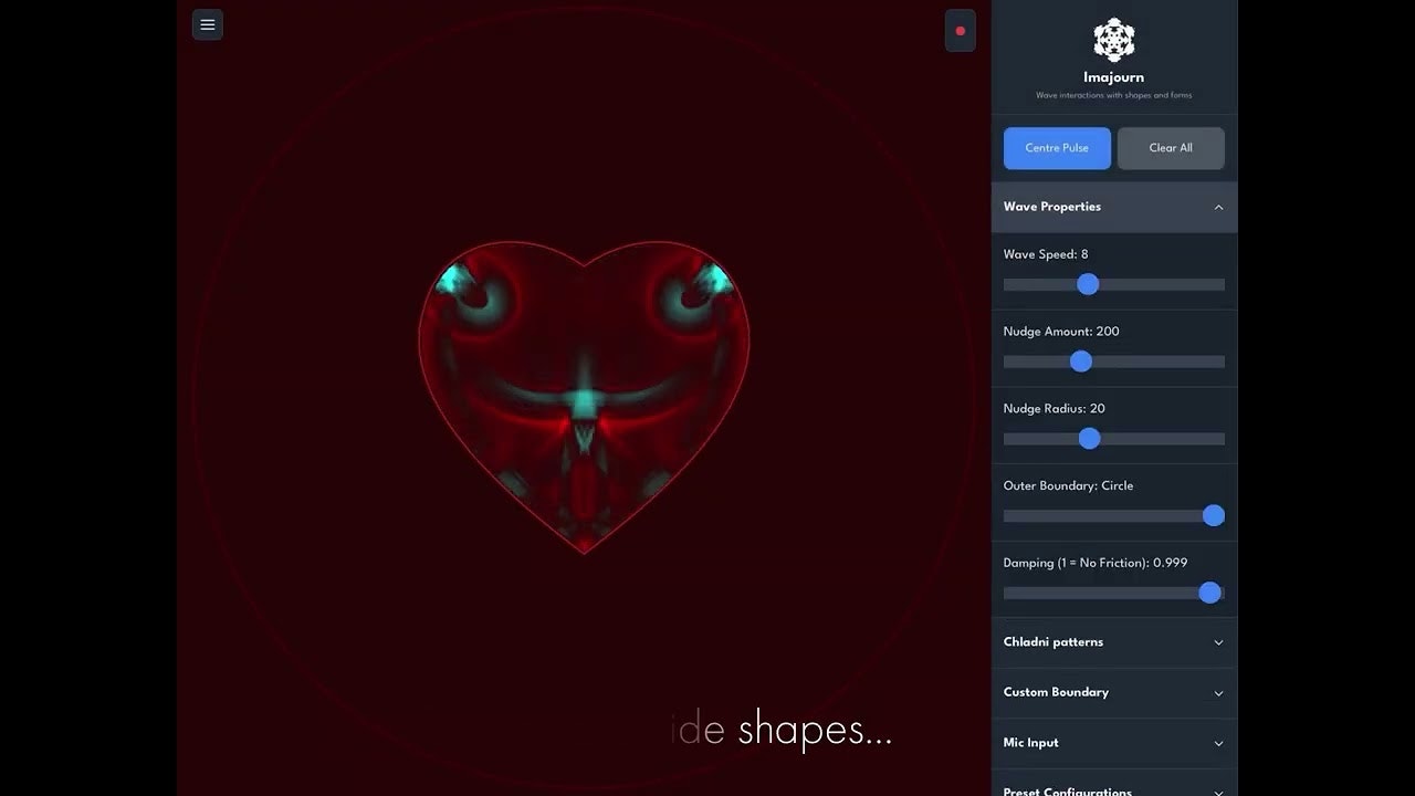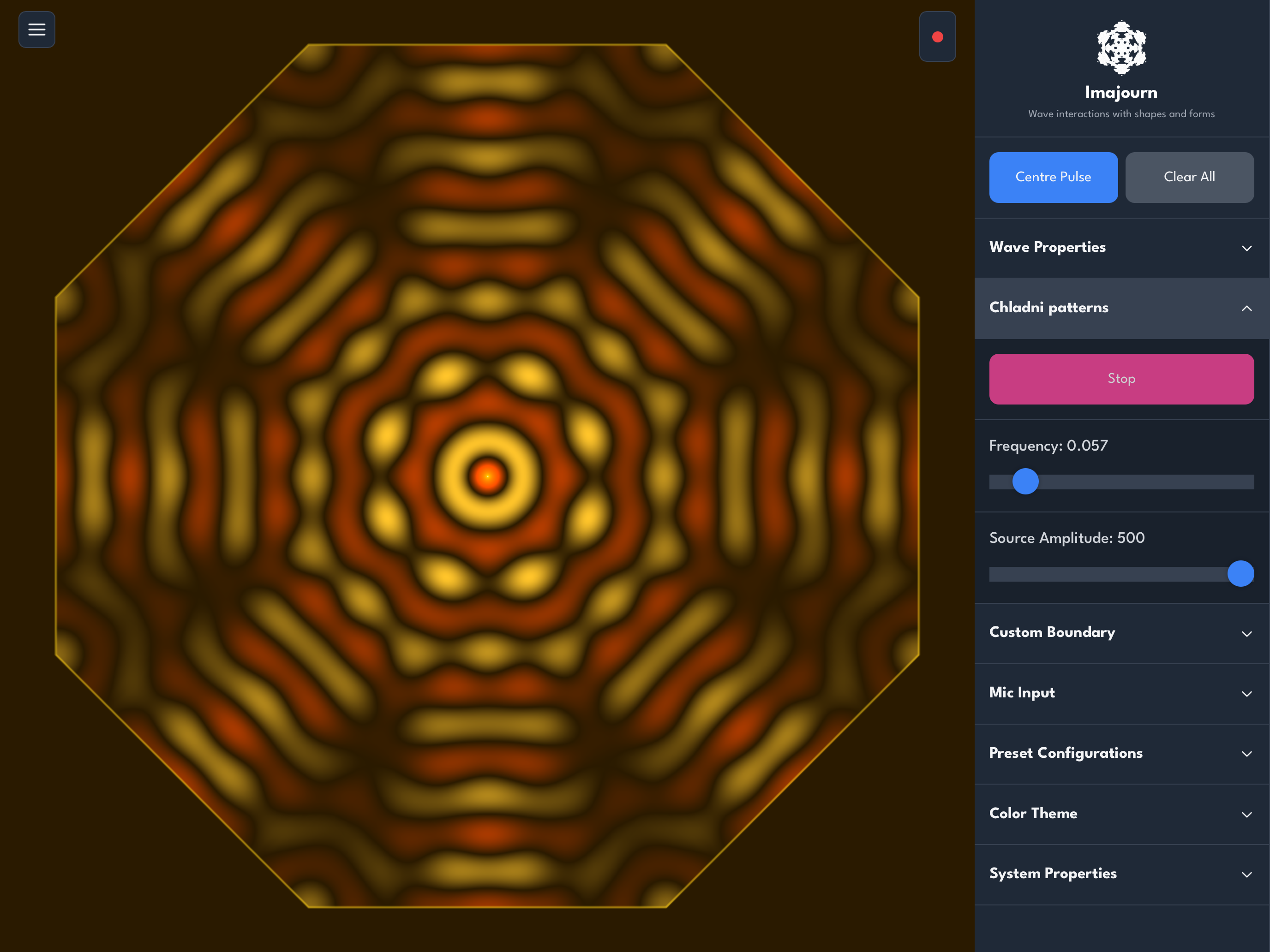 Imajourn is an interactive simulation sandbox that brings the physics of waves and sound to life. Whether you are an artist, a physics enthusiast, or a meditator, Imajourn offers a mesmerizing playground of light, motion, and geometry. Imajourn has moved from its early open source webapp version (Numatics) to a fully functional App Store app with new name and branding, and many new features: Interactive wave sim, chladni patterns and cymatics, audio reactivity, 3D particle sim, presets and more!