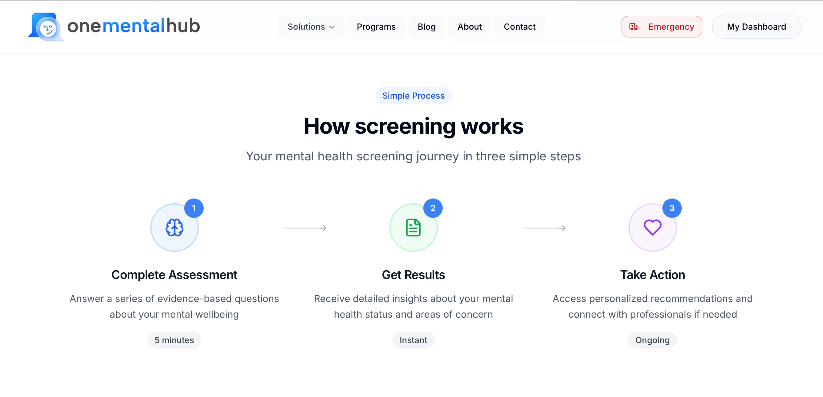 One Mental Hub was created with a simple but powerful vision: to remove barriers to mental healthcare and provide comprehensive support at every stage of the mental health journey. We believe that mental health screening should be accessible, professional, and confidential.