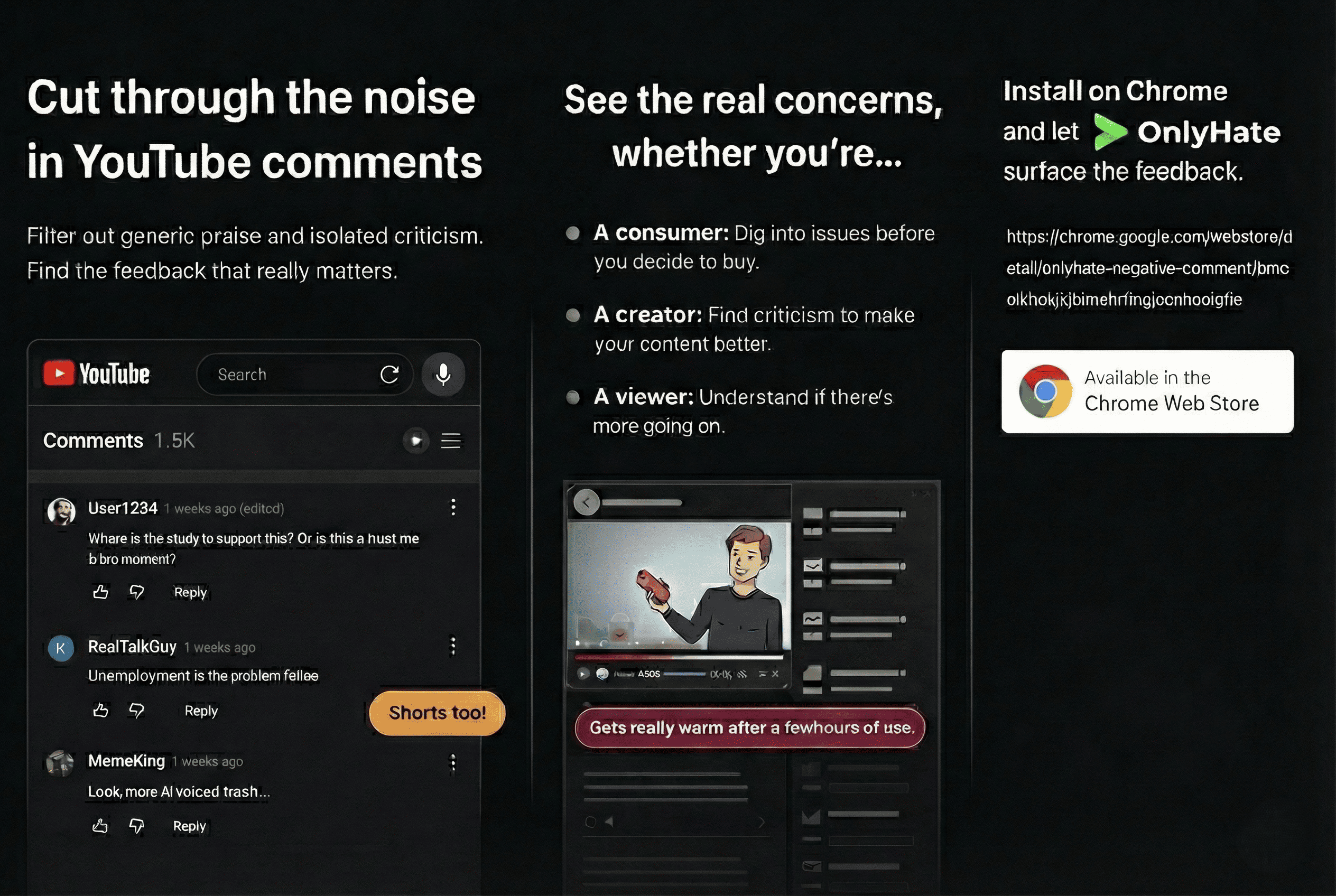 Hides the 'Great job!' so you can focus on the 'Here's what's broken. A Chrome Extension that hides positive comments and shows you only the hate. See the worst, ignore the rest.