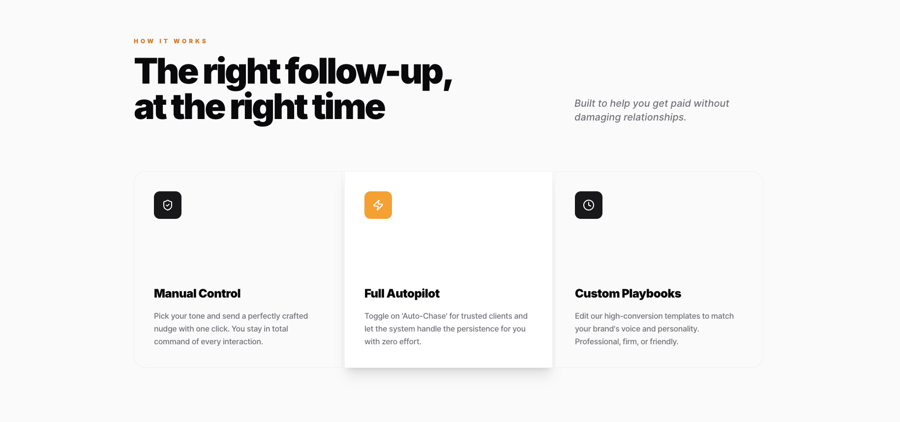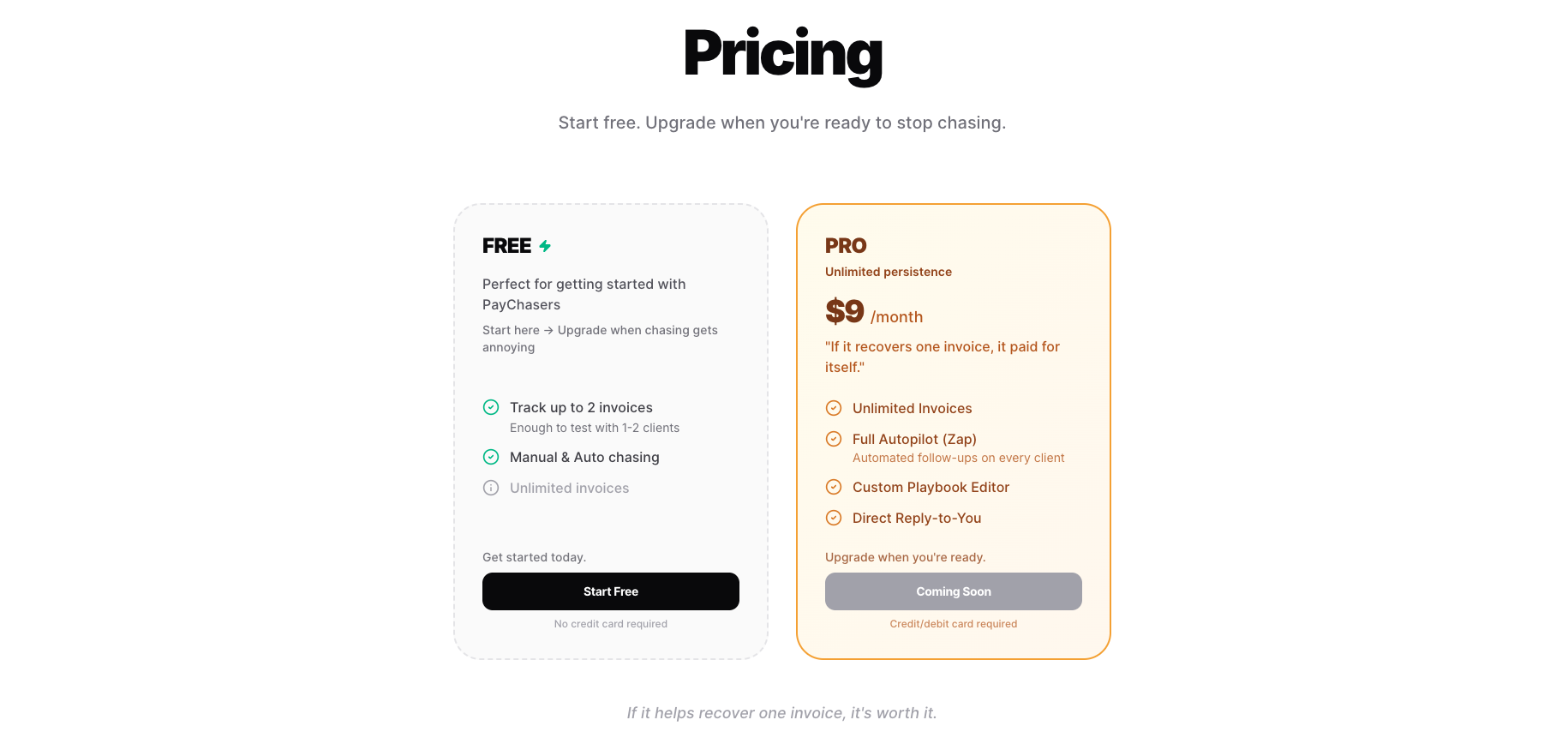 PayChasers helps freelancers and small teams stop chasing invoices. It automatically sends polite, context-aware follow-ups when payments are overdue, so you don’t have to send awkward reminders. You stay in control with manual actions or switch to autopilot when you want. Get paid on time without damaging client relationships.