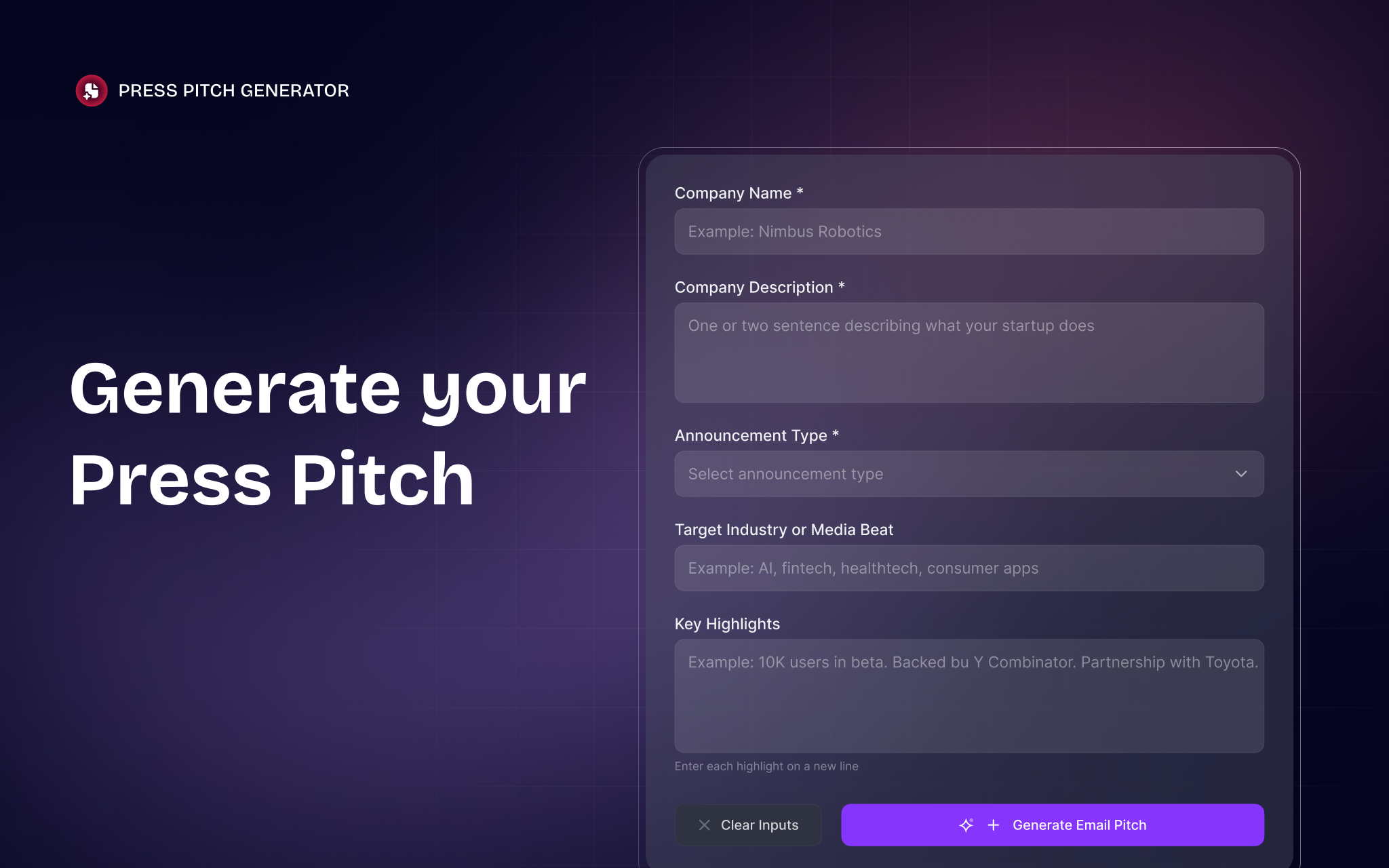 Press Pitch is a free tool I built to help founders write a clear, ready-to-send pitch for journalists in seconds. We kept seeing founders get stuck staring at a blank page or overcomplicating their outreach. This tool fixes that. You answer a few simple questions and get a clean pitch you can copy, tweak, and send right away.