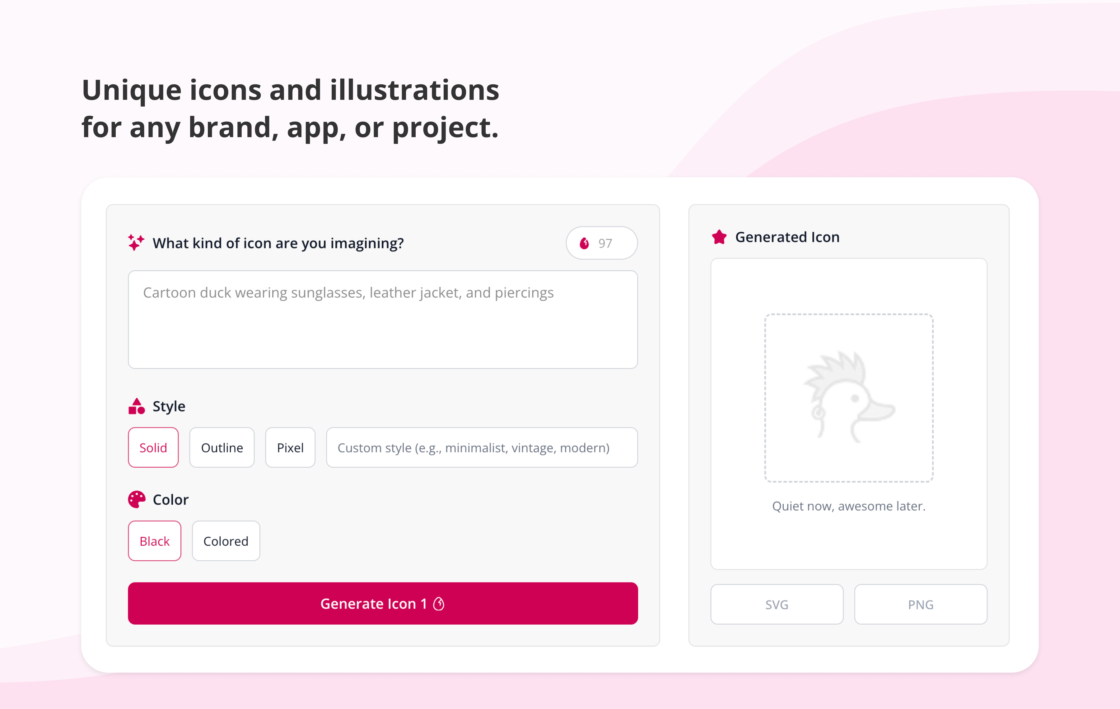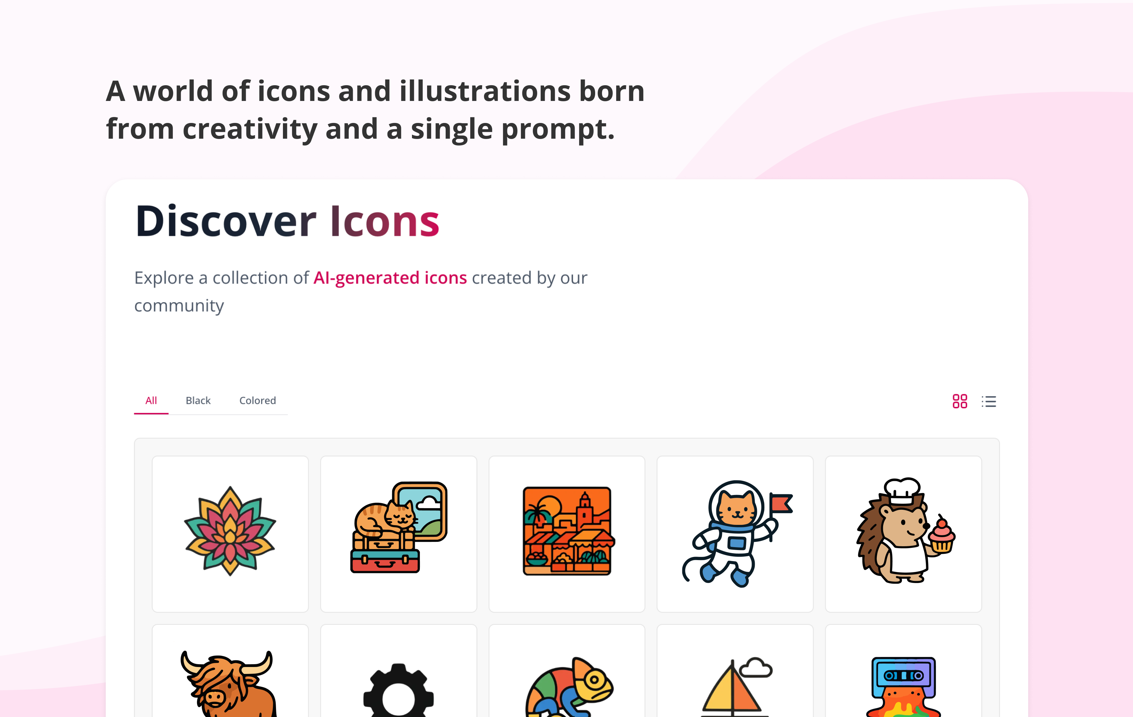 AI-powered icon and illustration generator. Turn text prompts into beautiful SVGs instantly, choose from multiple styles, and explore Discover to get inspired by community-generated designs and prompts.