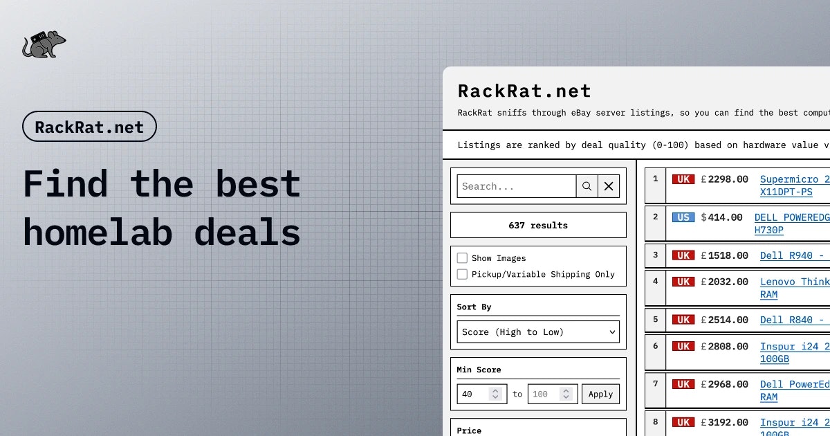 Tens of thousands of eBay server listings analyzed daily to find the highest-scoring hardware deals. Filter by price, specs, and region to find the perfect addition to your homelab.