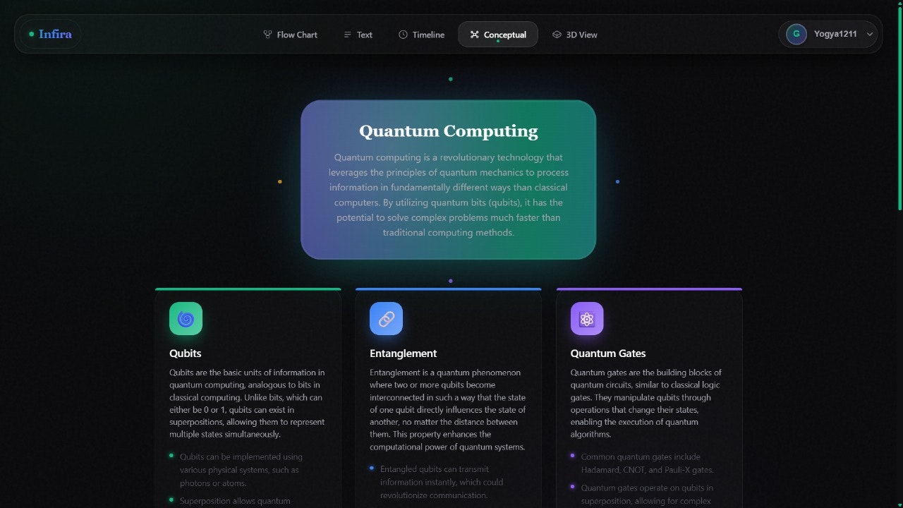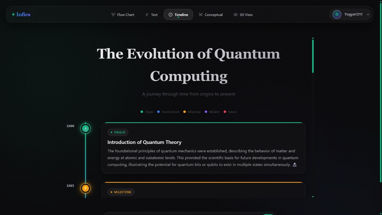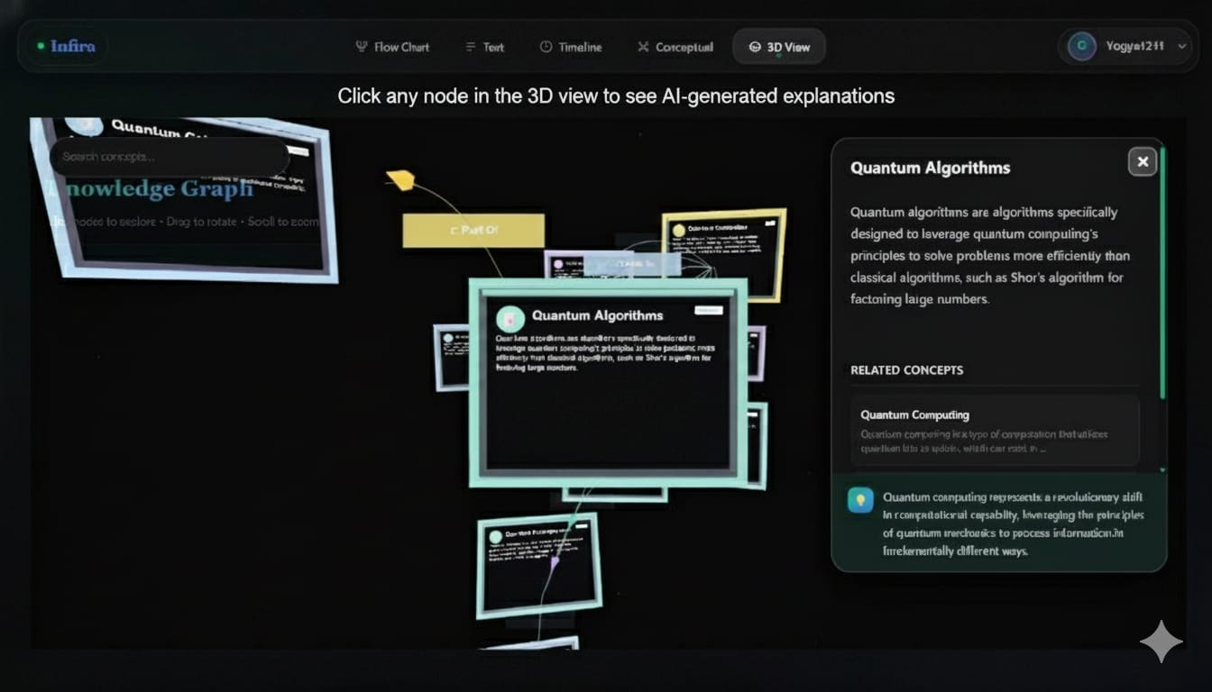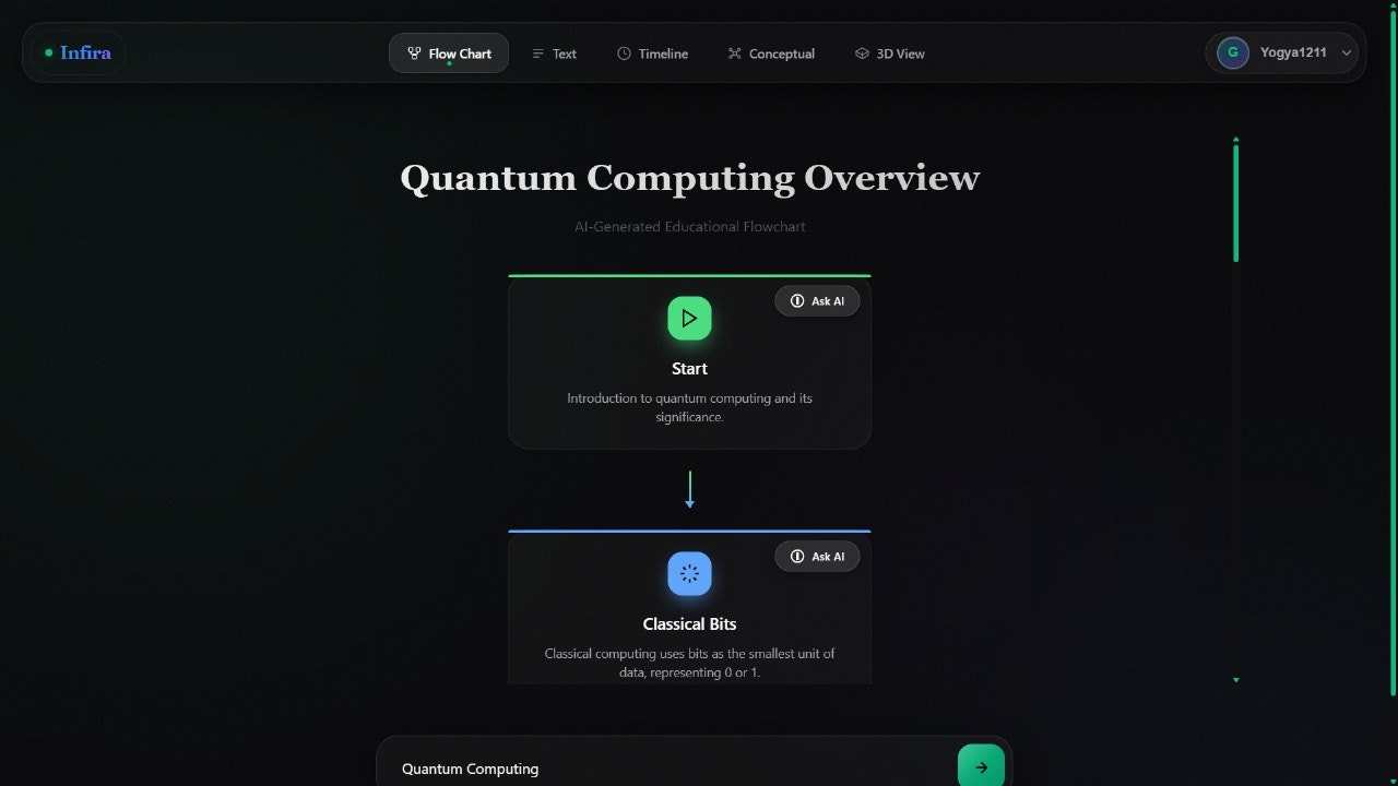 Infira is a multidimensional learning engine that turns complex topics into living, visual experiences. Flowcharts that pulse, timelines that breathe, and 3D concept maps that build themselves — all designed to help you understand faster, remember longer, and think deeper.