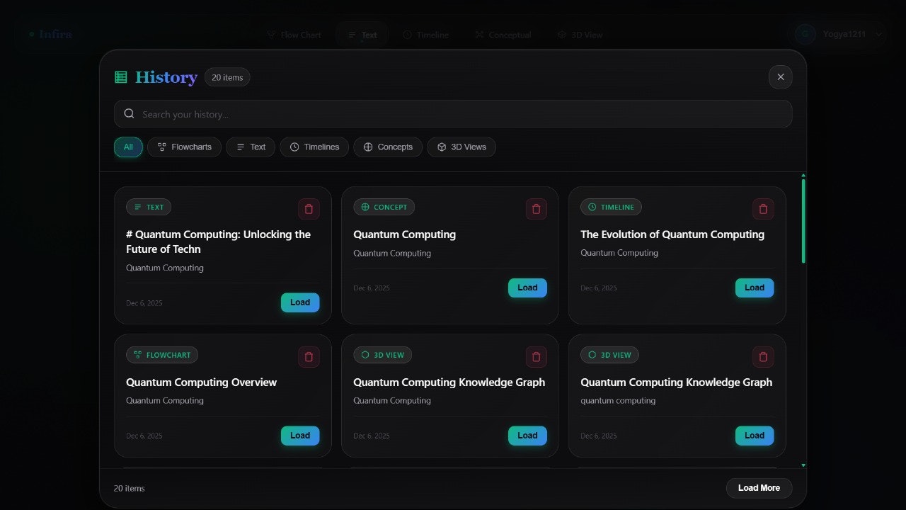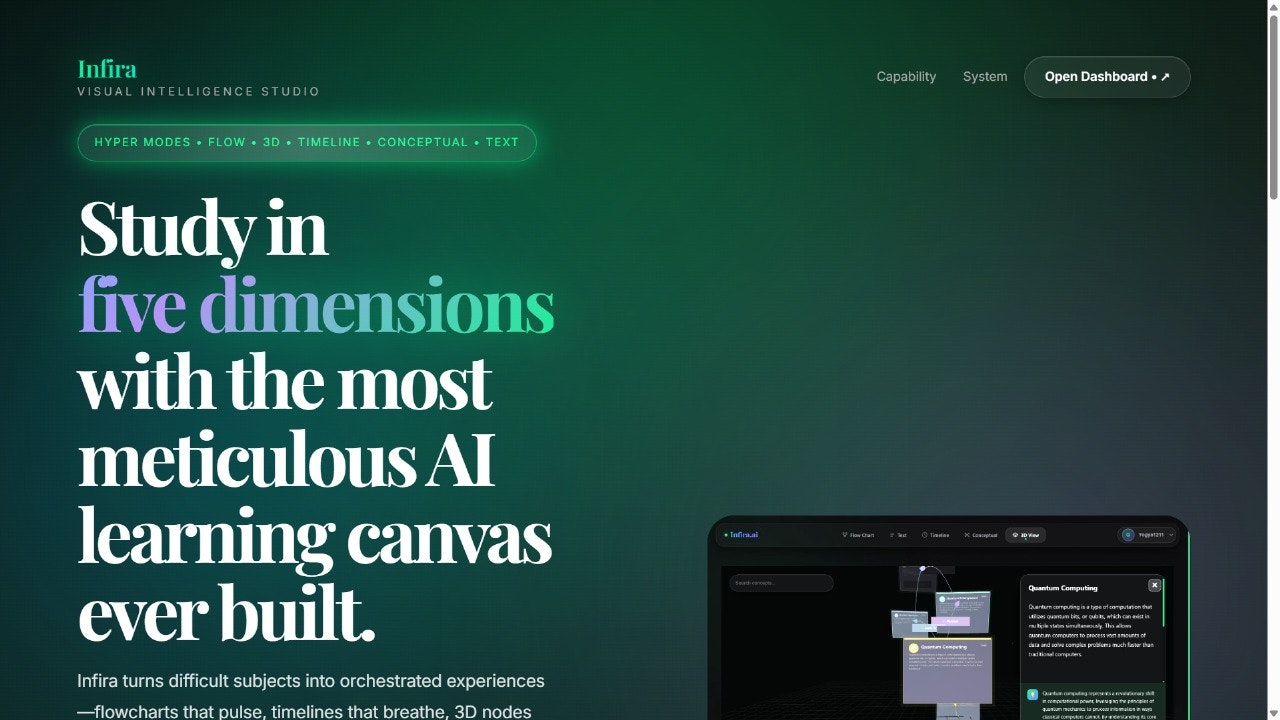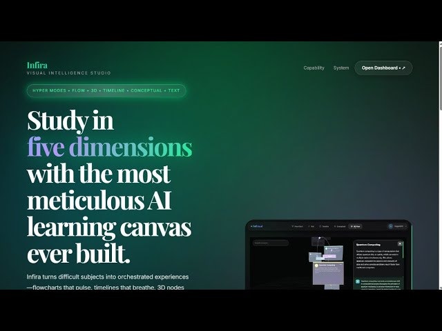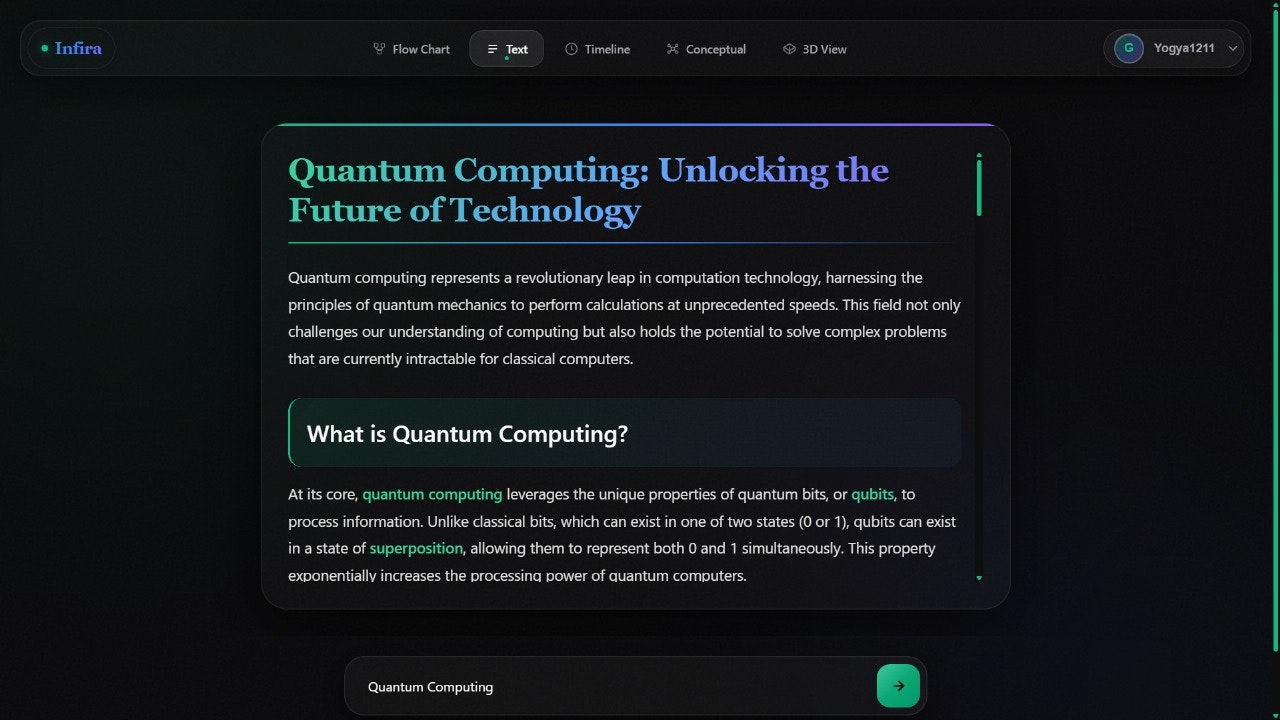 Infira is a multidimensional learning engine that turns complex topics into living, visual experiences. Flowcharts that pulse, timelines that breathe, and 3D concept maps that build themselves — all designed to help you understand faster, remember longer, and think deeper.