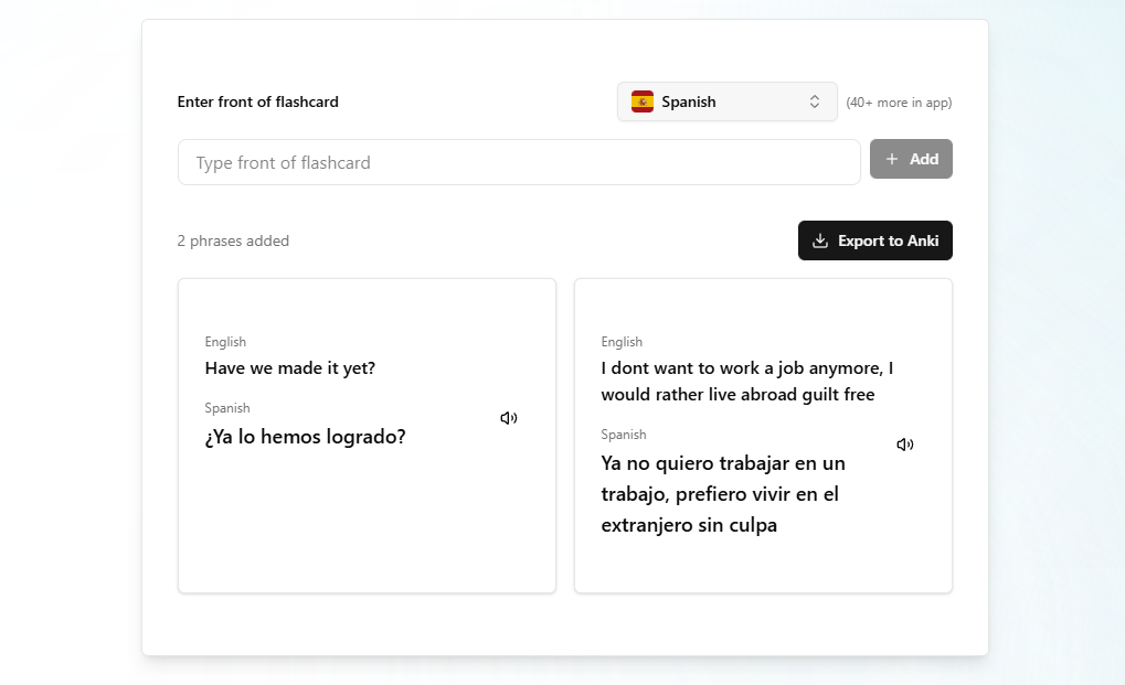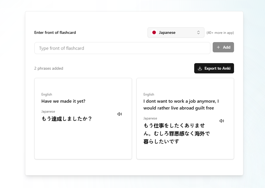 Create Anki flashcard decks instantly with translations and speaker audio. Enter phrases in English, get instant translations in 40+ languages, and generate audio for perfect pronunciation. Export to Anki and accelerate your language learning journey.