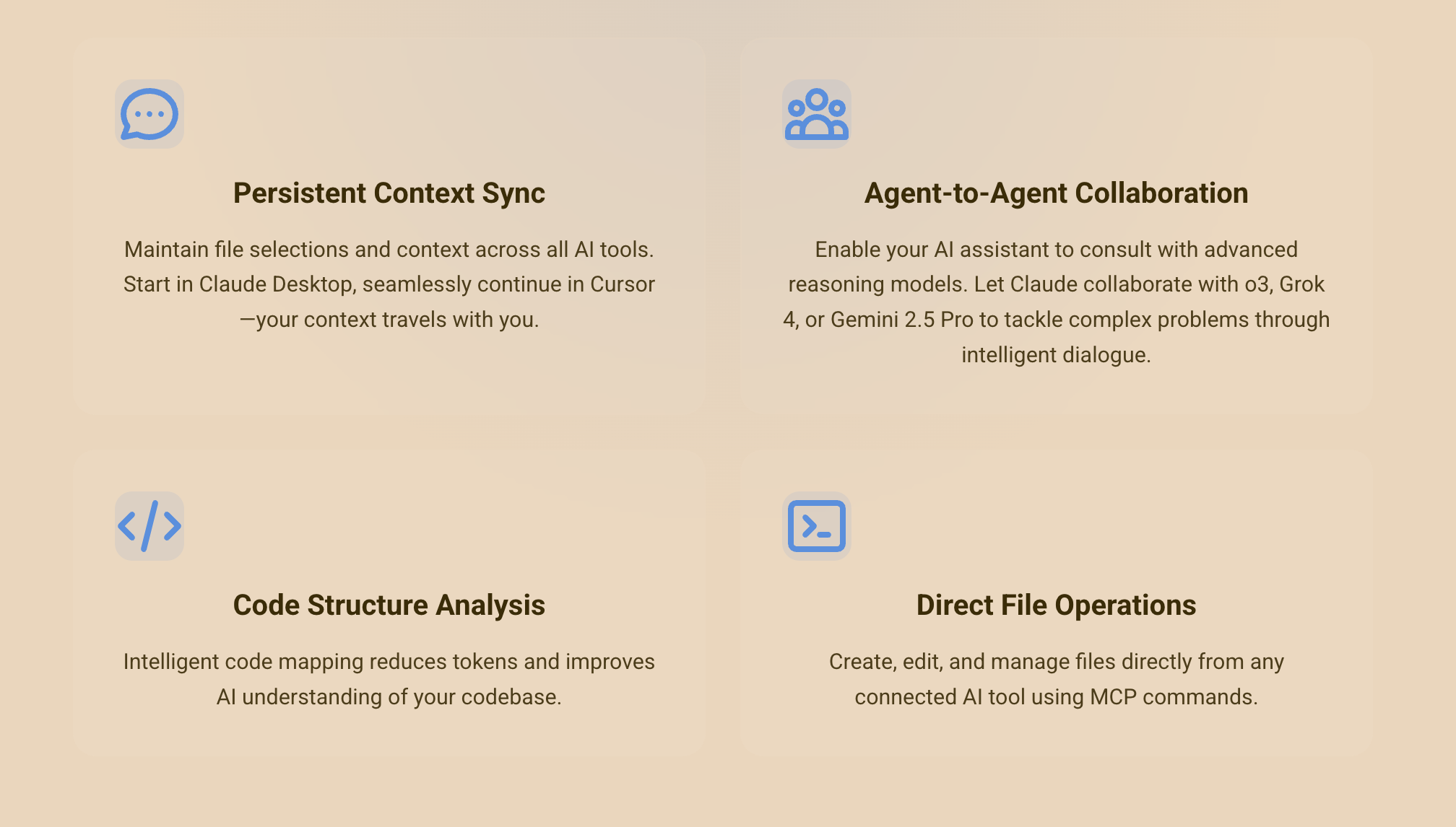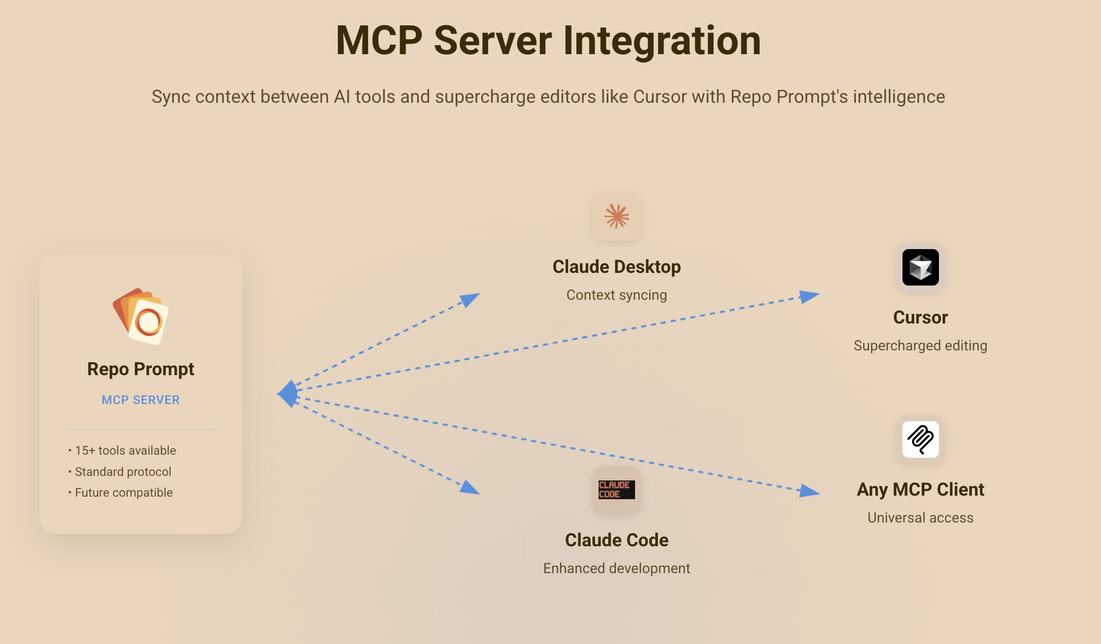 Repo Prompt helps AI models understand your codebase without wasting tokens on irrelevant code. Context Builder analyzes your project and selects the files and functions needed for your task, building dense context that fits in model limits. It works with your existing AI subscriptions (Claude MAX, ChatGPT Plus, Gemini) — no extra API costs. The MCP server turns Repo Prompt into a backend for Claude Code, Cursor, and Codex, giving them context analysis and discovery they can't do on their own.