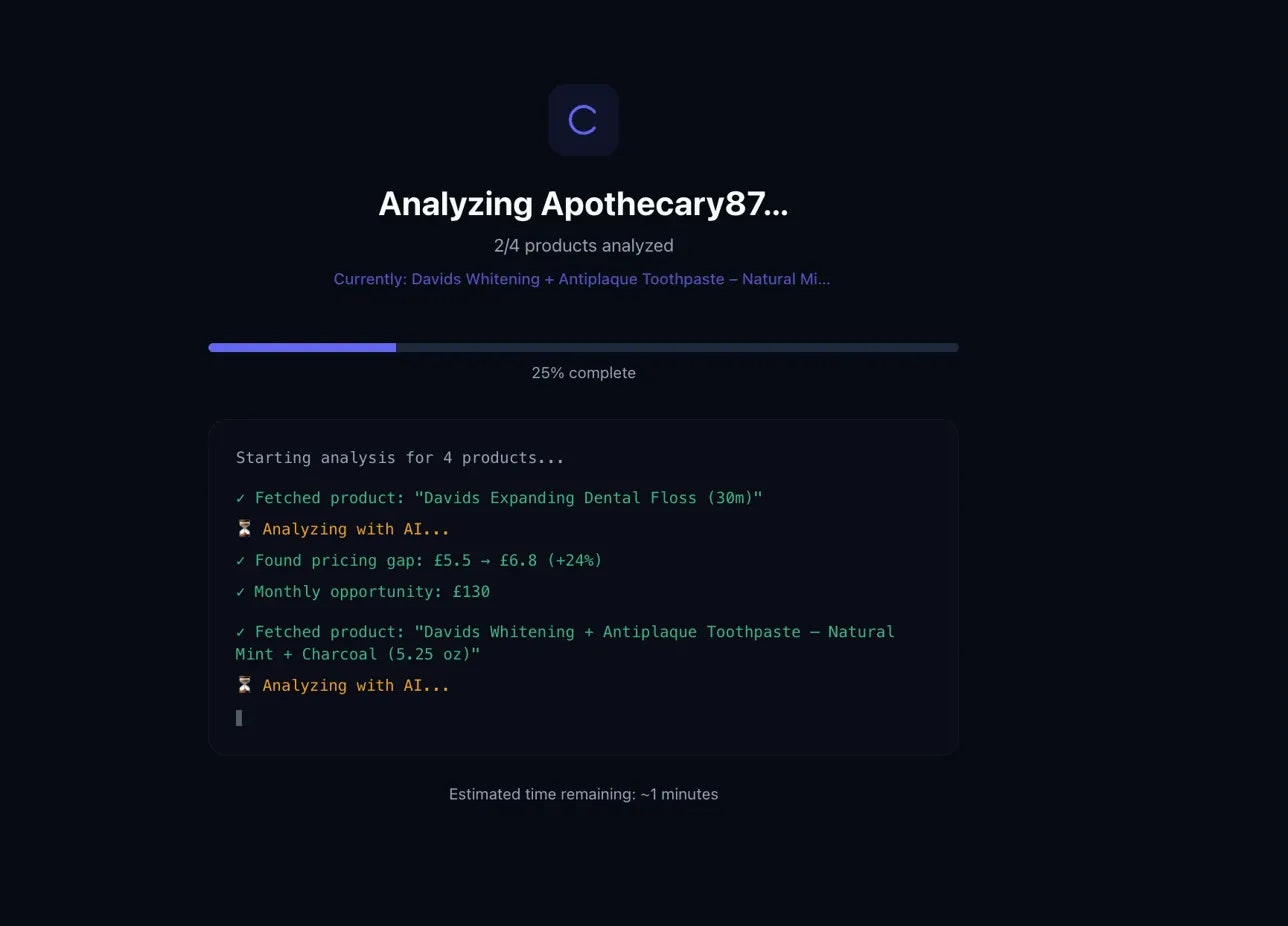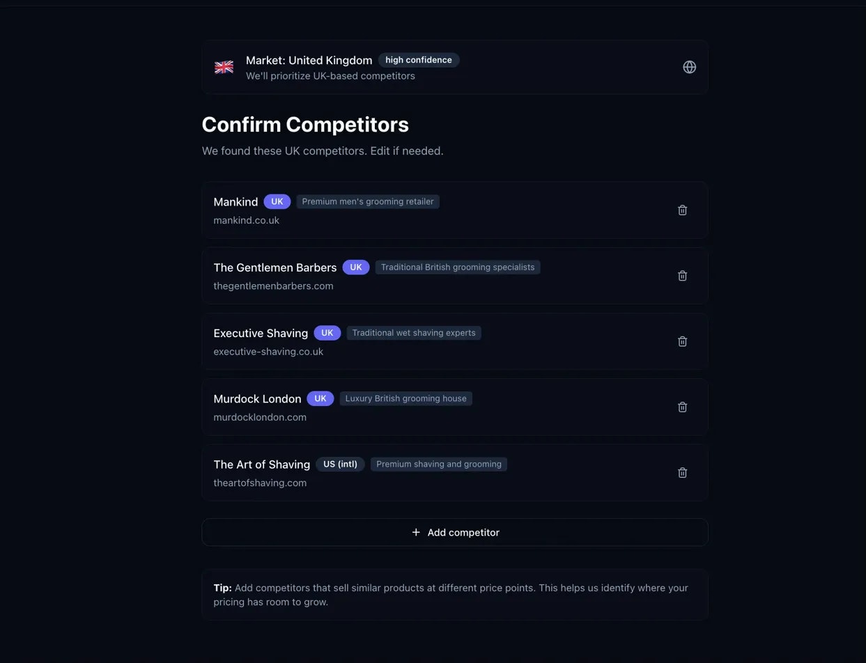 AI pricing intelligence that actually understands your market. We find your real regional competitors (not global noise), analyze where you stand, and show you exactly where to price. Find £10K-20K/month in opportunities - no signup, 3 minutes.