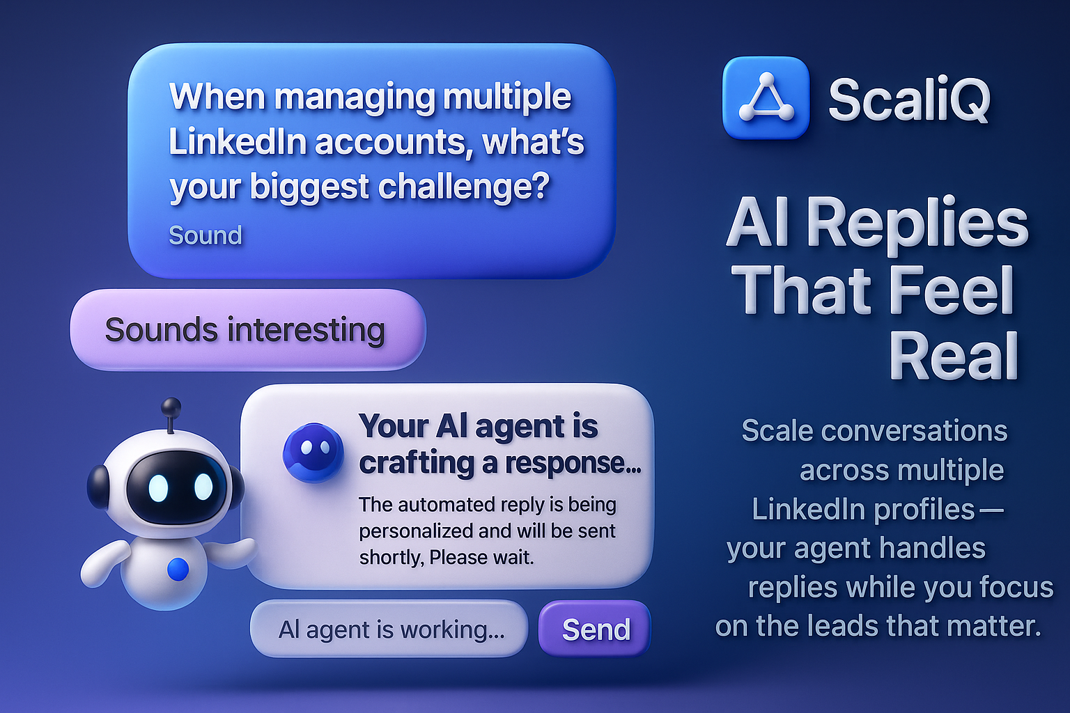 ScaliQ lets you scale LinkedIn outreach across multiple accounts from one unified inbox — with AI agents that handle DMs, follow-ups, replies. It analyzes every response, applies qualification tags, and keeps the conversation moving until a prospect is ready for you.