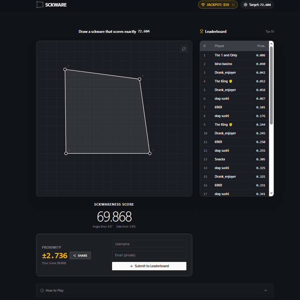 Draw a sckware (square) with a score as close to the daily goal as possible to top the leaderboard. Match the daily goal exactly and win the building jackpot!