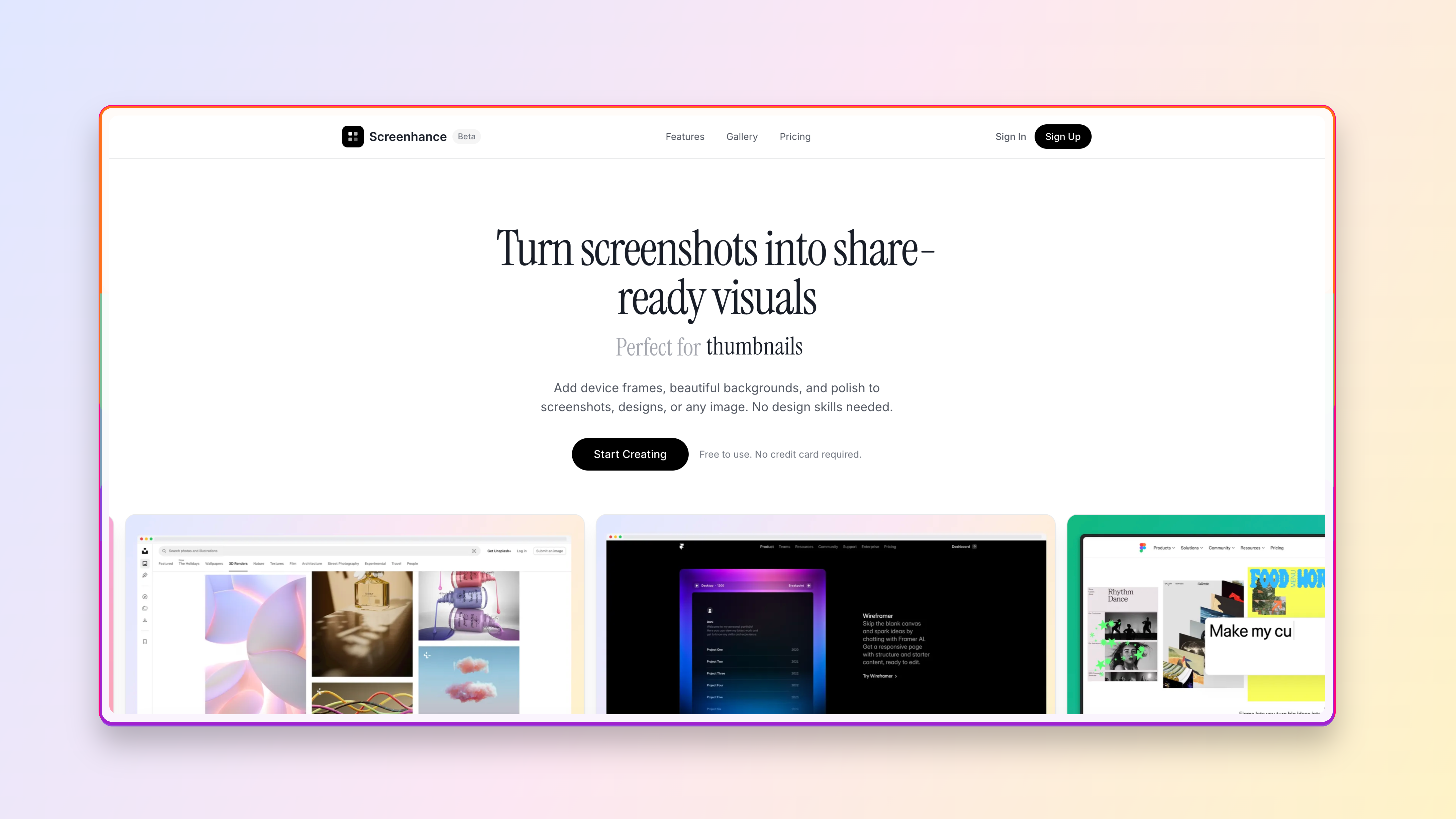 Most screenshot tools are static or require design skills. Screenhance is template-first and animation-native. Turn screenshots into polished visuals or short MP4/GIF clips in minutes. Pick a layout, theme or transparent background, tweak colors and shadows, add subtle motion, and export. Device and browser frames included. Free tier, Week Pass, and Pro.