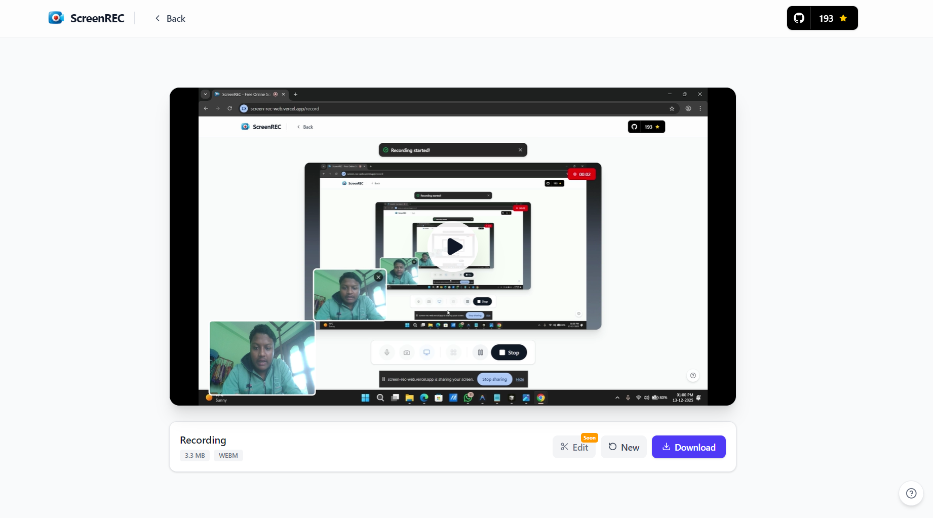 🎬 ScreenREC: The simplest screen recorder ever Record screen, webcam & audio in-browser—no downloads, no signups. Why teams love ScreenREC: ✨ Zero install, works instantly 🔒 Privacy-first, recordings stay local 🎥 Full HD quality ⚡ One-click start 🎨 Dark mode UI 💾 Export MP4/WebM 🌐 100% open source Perfect for tutorials, demos, bug reports, presentations & async team communication. No bloat. No tracking. Just recording done right.