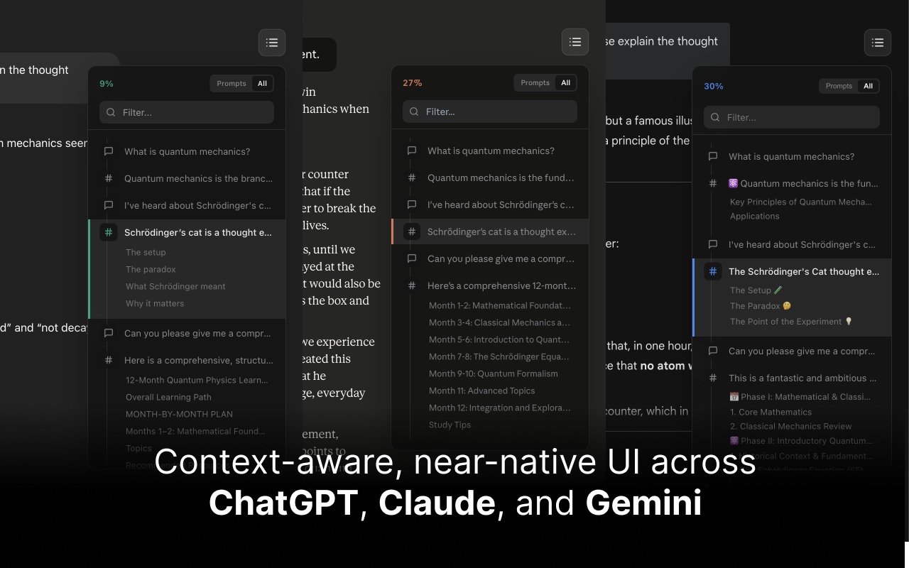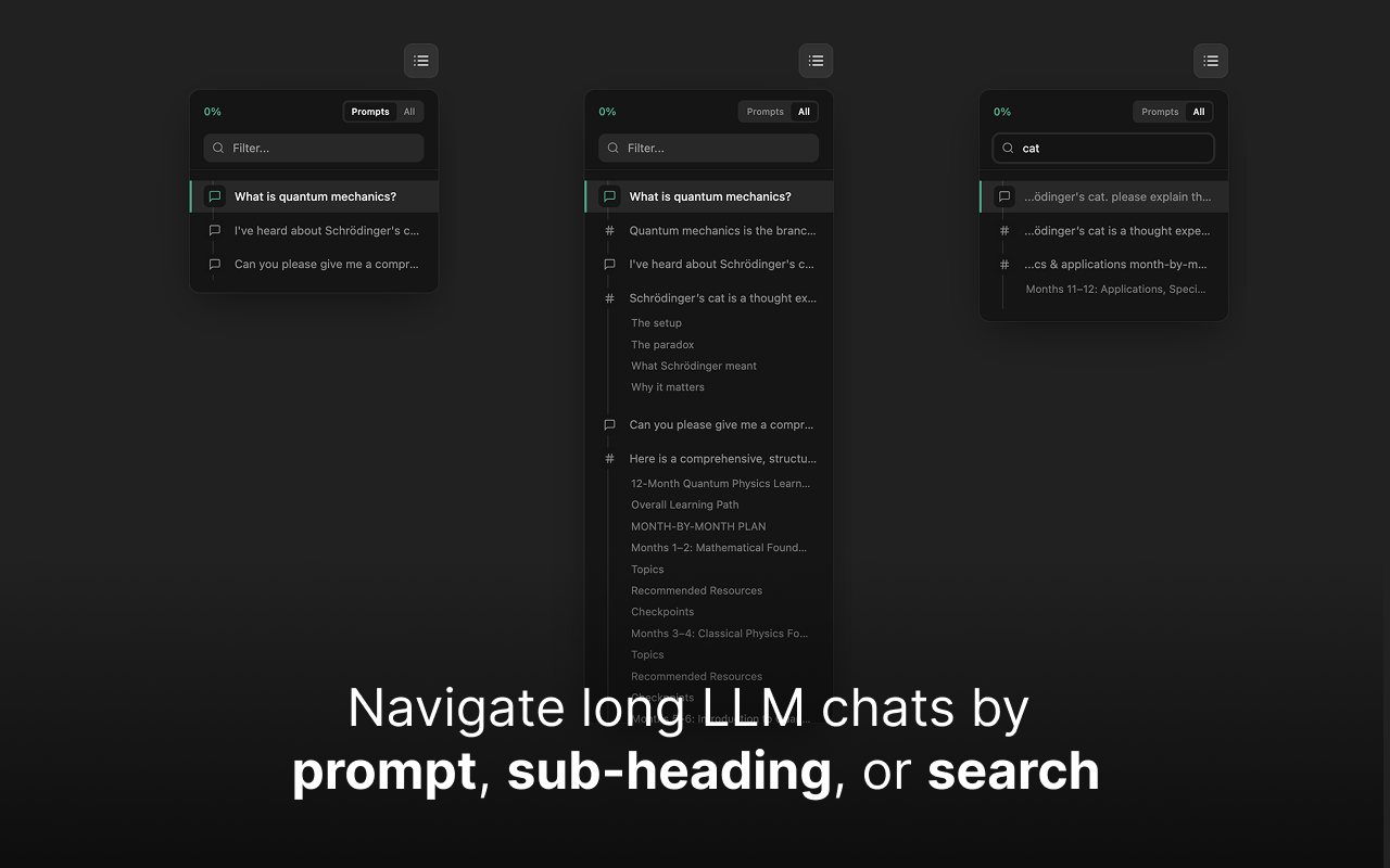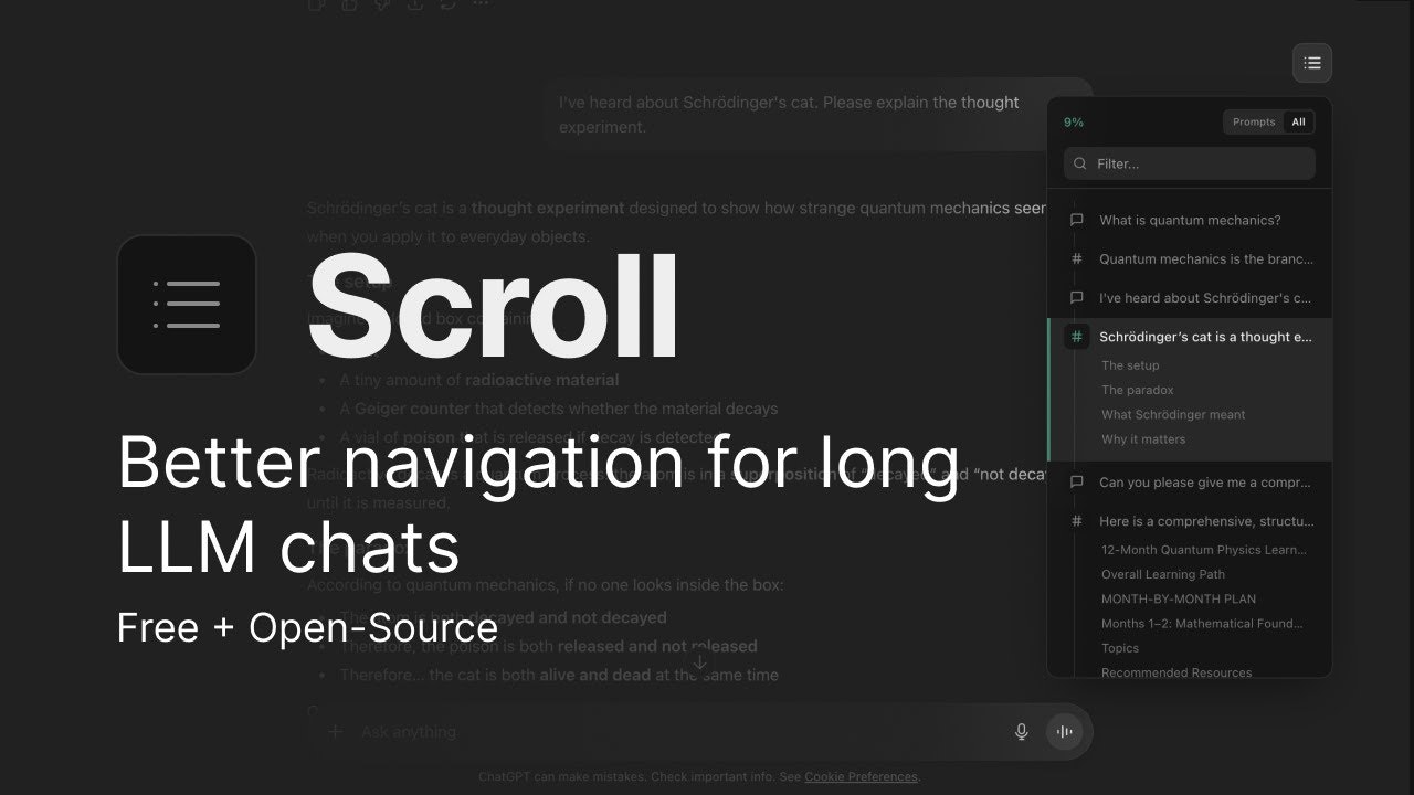Long AI conversations are hard to navigate. You end up scrolling endlessly, trying to find something you asked ten messages ago. Scroll adds a sidebar that shows every turn in your conversation. Click any item to jump between prompts and responses. It works on Claude, ChatGPT, and Gemini. Toggle it with Cmd+. Use arrows and Enter to navigate if you prefer. Switch between seeing all messages or just your prompts. It's straightforward, free, and open source. Hope it helps!