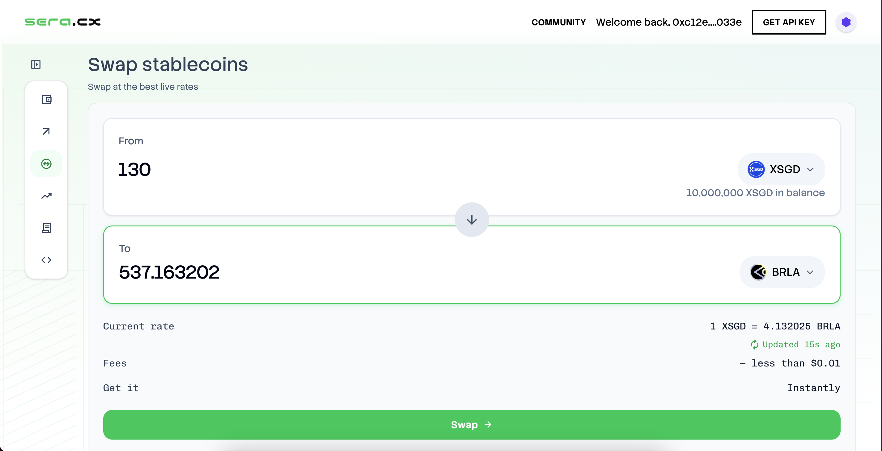 Sera is a stablecoin-native FX settlement layer powering 70+ regulated, 1:1 fiat-backed stablecoins from 20+ countries. We enable on-chain FX rate setting, non-USD liquidity routing, and instant multi-currency settlement for real-world cross border payments, payroll, and global remittance. Try swapping across currencies, set your own FX rates across 552 currency pairs, and explore 50+ ecosystem ideas to build real-world stablecoin applications with Sera.