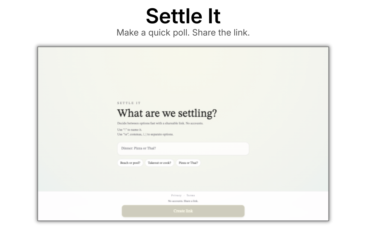 Settle It is a simple way to make quick polls and share them with a link. Type a question in one line, send the link to friends or family, and see the result as votes come in. It’s designed for everyday decisions like where to eat, when to meet, or what to do next. No accounts, no setup, no friction. Make a poll. Share the link. Decide.