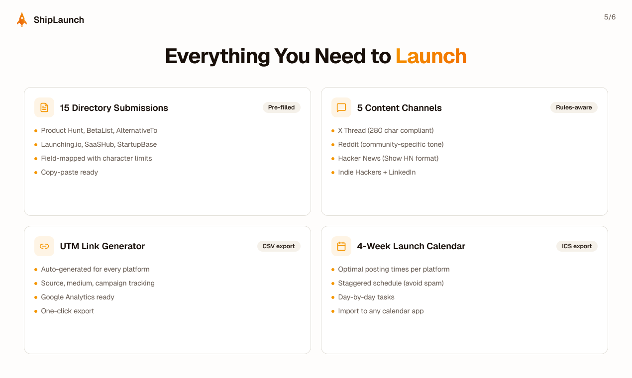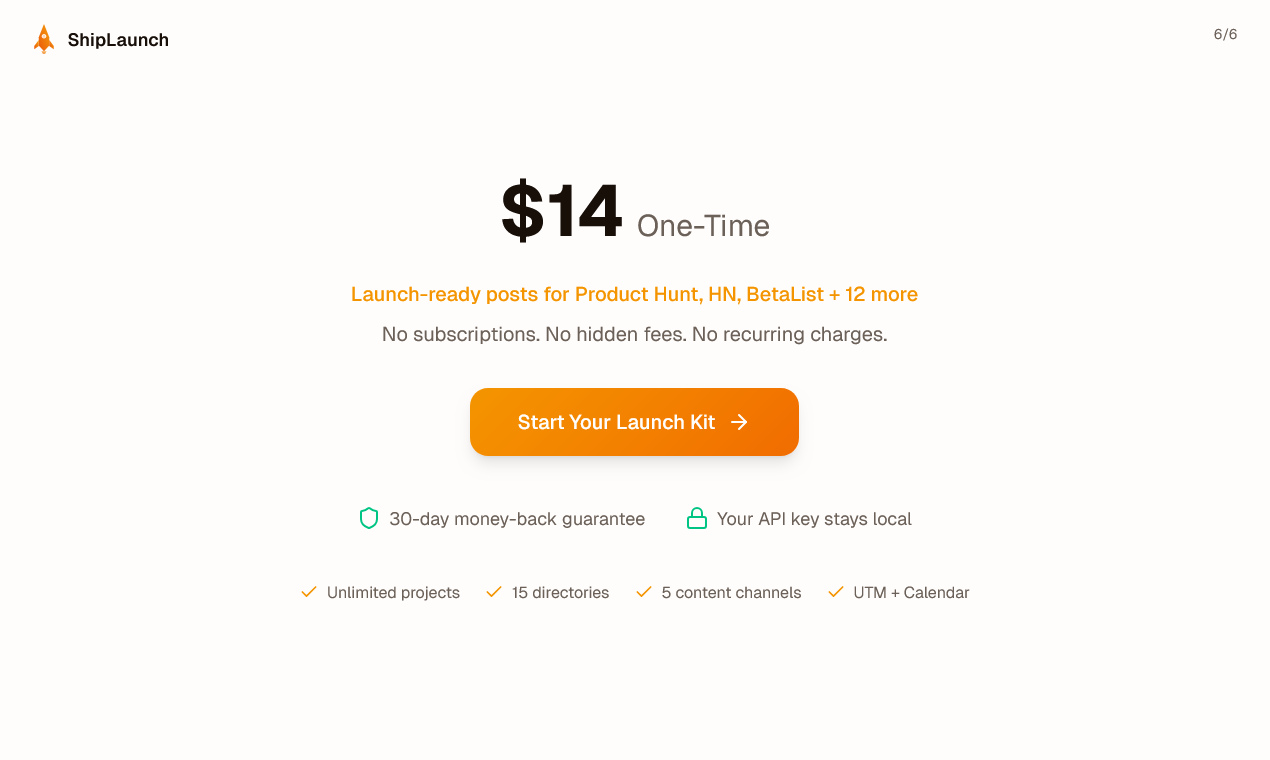 Launching a product means rewriting and reformatting the same message for Product Hunt, Hacker News, BetaList, and dozens of other directories, each with different rules and character limits. ShipLaunch turns one product description into launch-ready content for 15+ platforms in under a minute. You stay in control. Edit, tweak, and post wherever you want. One-time $14. Bring your own API key. No subscriptions.