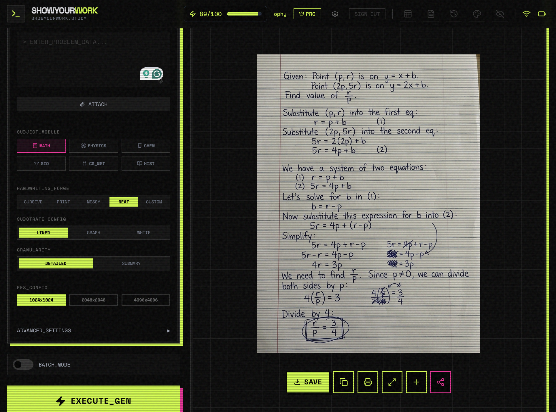 Generate photorealistic handwritten homework solutions in seconds. Step-by-step work shown for Math, Physics, Chemistry & more. The AI that actually shows its work.