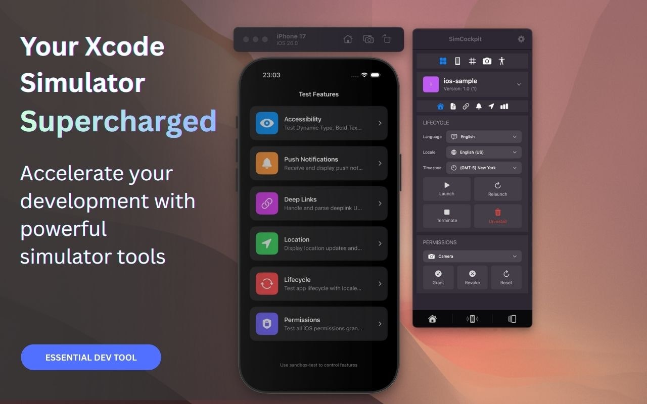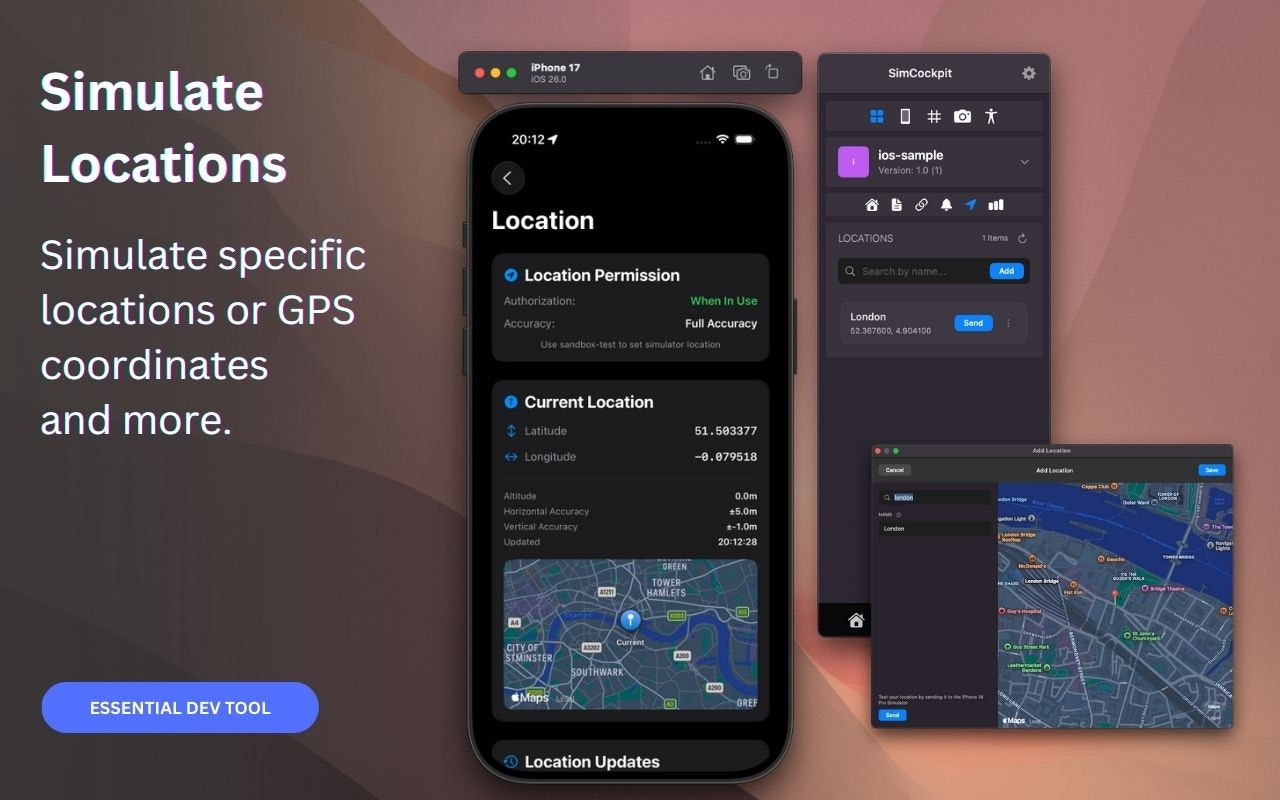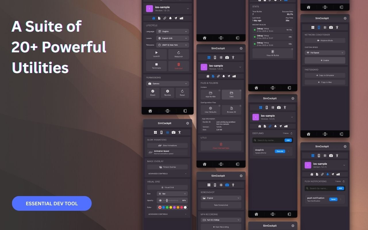 SimCockpit is the native control center for your Xcode Simulator. We built it to replace the friction of terminal commands and scattered tools with a single floating window. Toggle network conditions, mock GPS locations, edit User Defaults, and record demos without breaking your flow. It is the missing companion designed to let you focus on building great apps, not managing your environment.