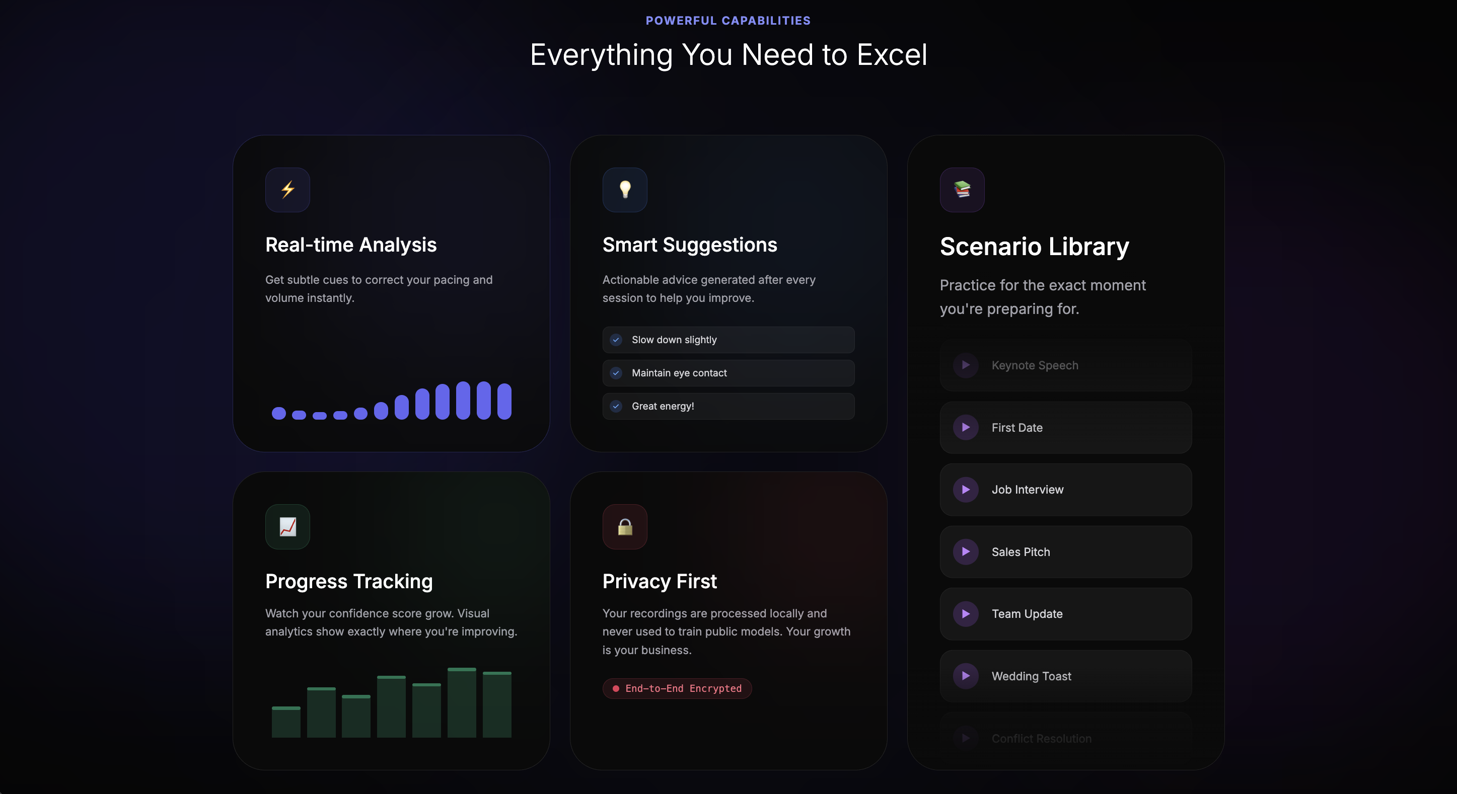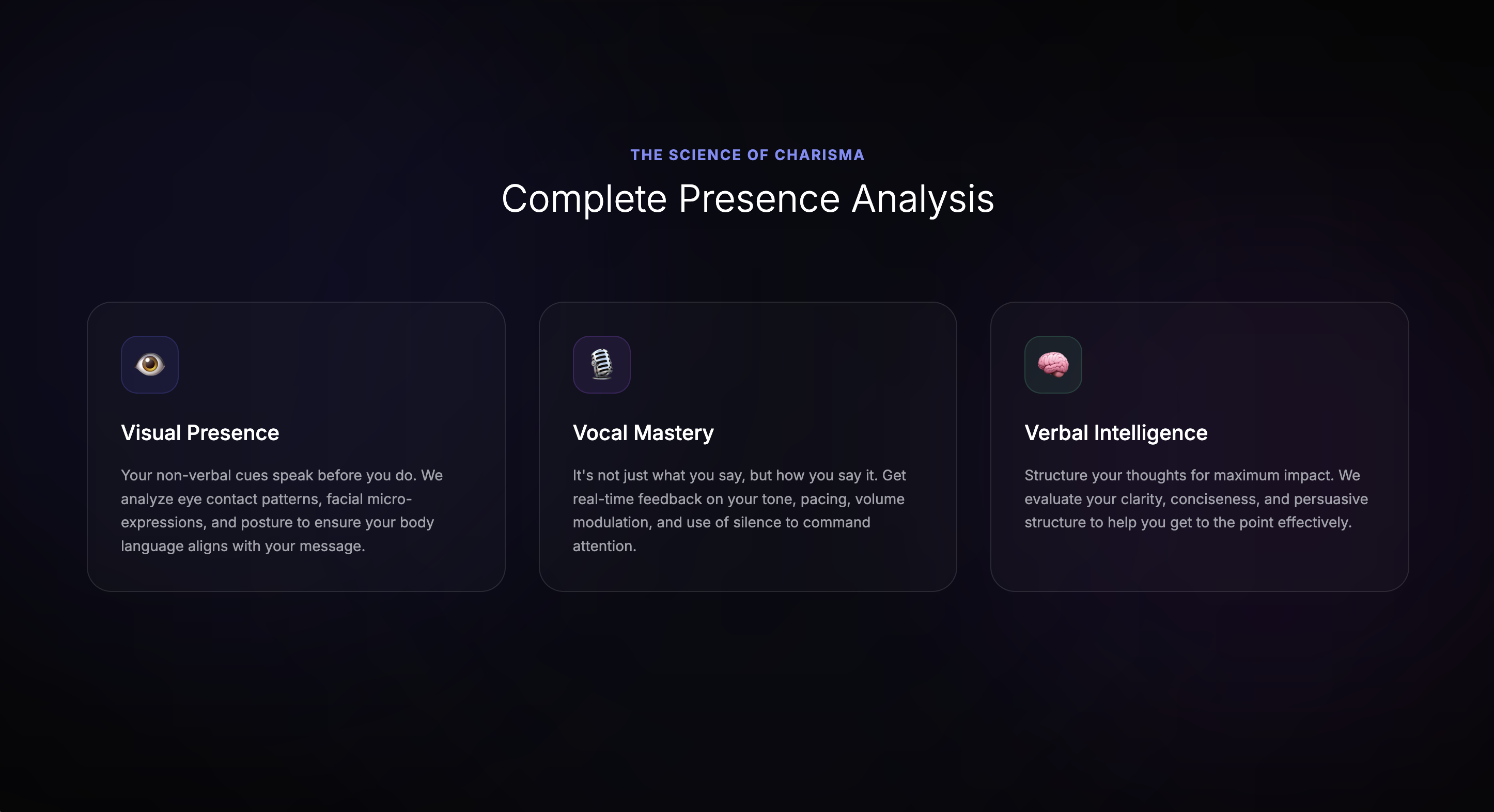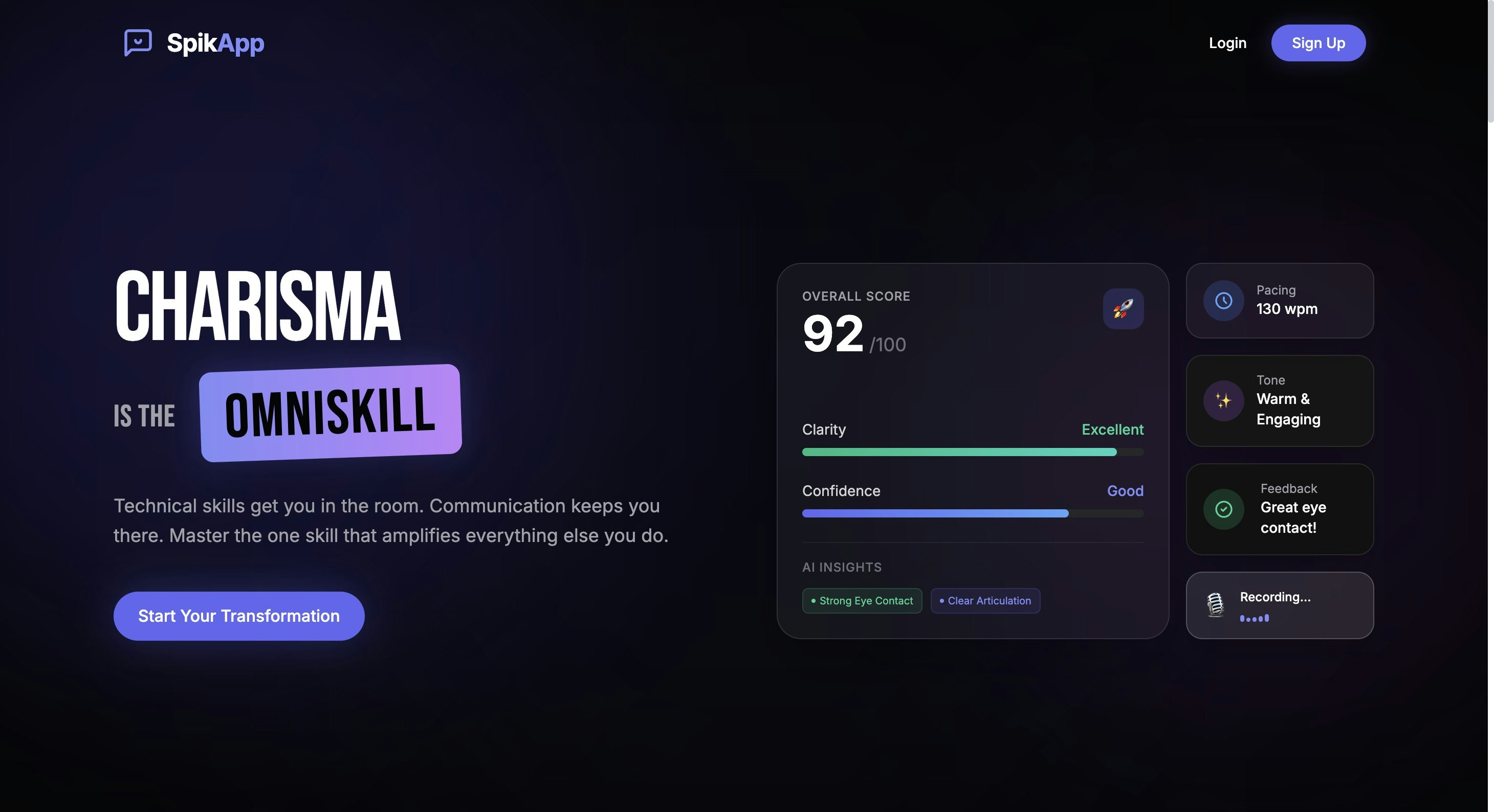 SpikApp is the only AI coach that sees and hears you. We go beyond simple text analysis by processing your full audio and video performance simultaneously. Our AI evaluates your vocal delivery (tone, pitch, pacing) alongside your visual presence (eye contact, facial expressions, body language) to detect inconsistencies. Practice in realistic scenarios, get timestamped feedback on exactly when your non-verbal cues contradicted your message, and master the art of presence.
