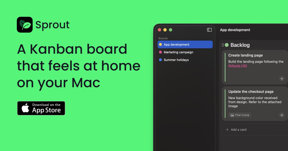 A few months ago I started looking for a simple kanban board to manage all my tasks, as I was getting crazy with the load of work I had. I spent weeks looking for one that was private, offline, that wasn't bloated with a ton of useless features. So I built Sprout 🌱, a simple and native Kanban board for Mac. - No accounts - No noise (0 notifications, ads, useless features) - 100% private (it uses CoreData and iCloud).