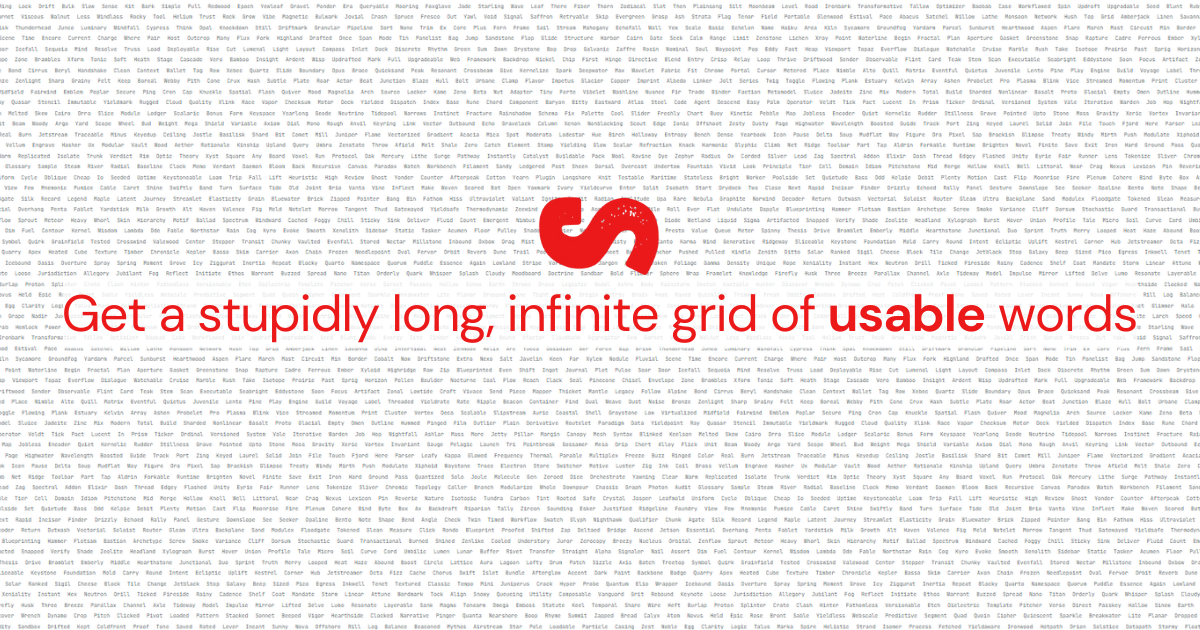 Naming things is hard. We made it stupid easy. Get a mighty, dense, infinite grid of words you can choose from, combine and tweak. All free, no signup required.