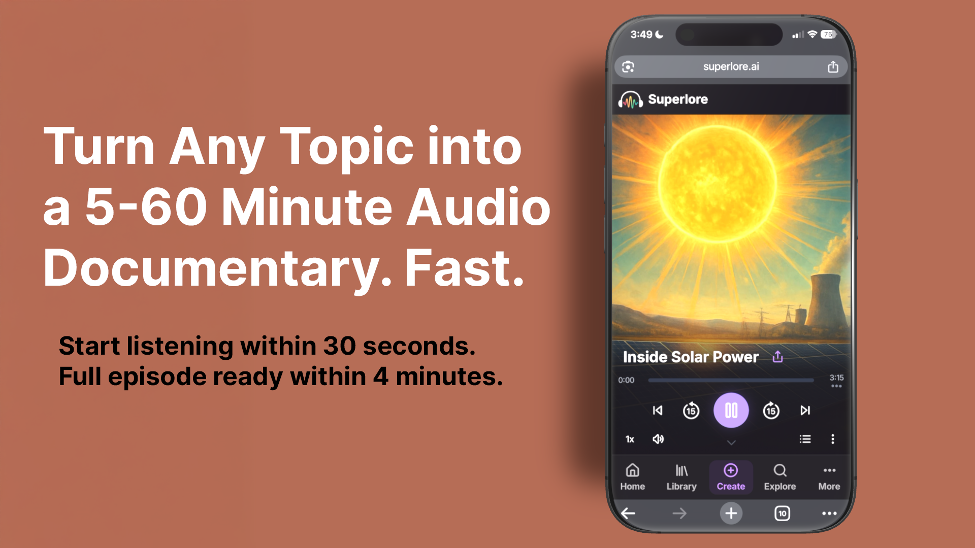 Superlore is an AI-powered platform that creates long-form audio documentaries on-demand. Simply input a topic, choose a duration, and click create. Within 30 seconds, you'll have an audio episode complete with expert narration, thoughtful pacing, a live transcript, and professional sound design. No sign up required!