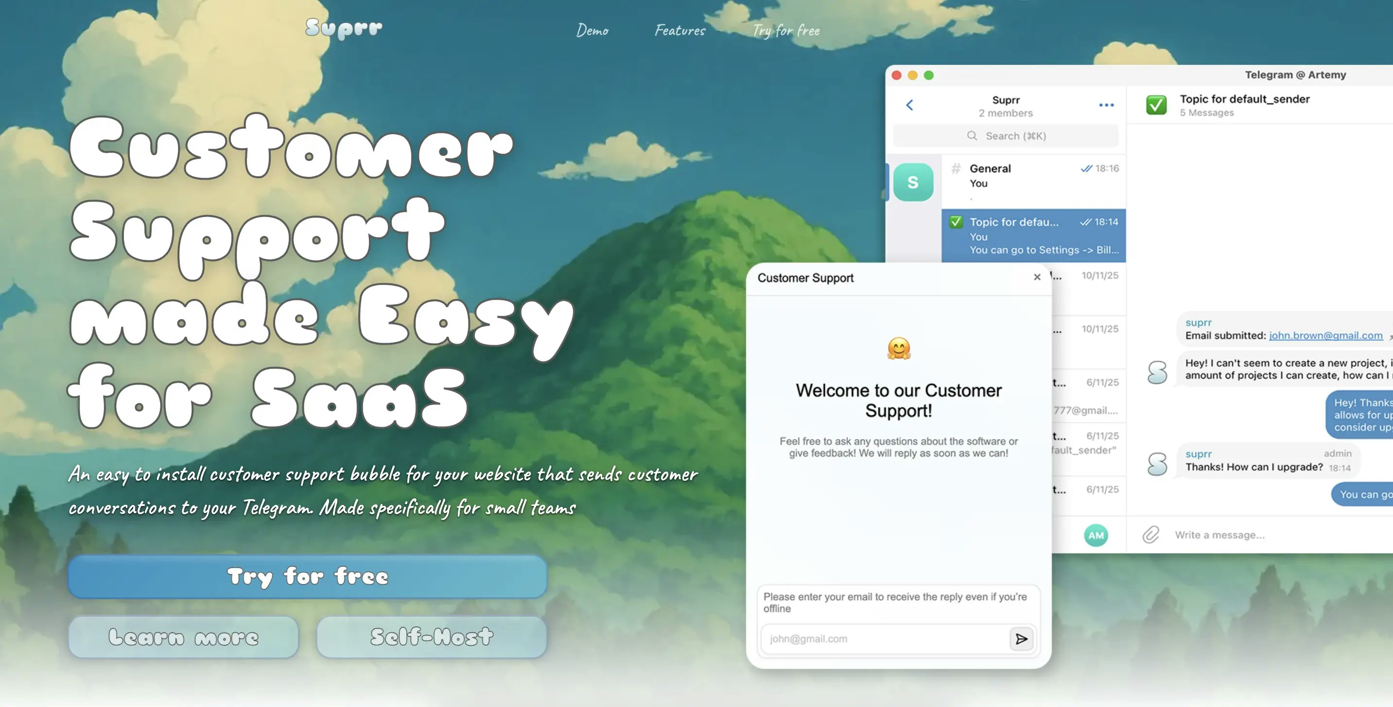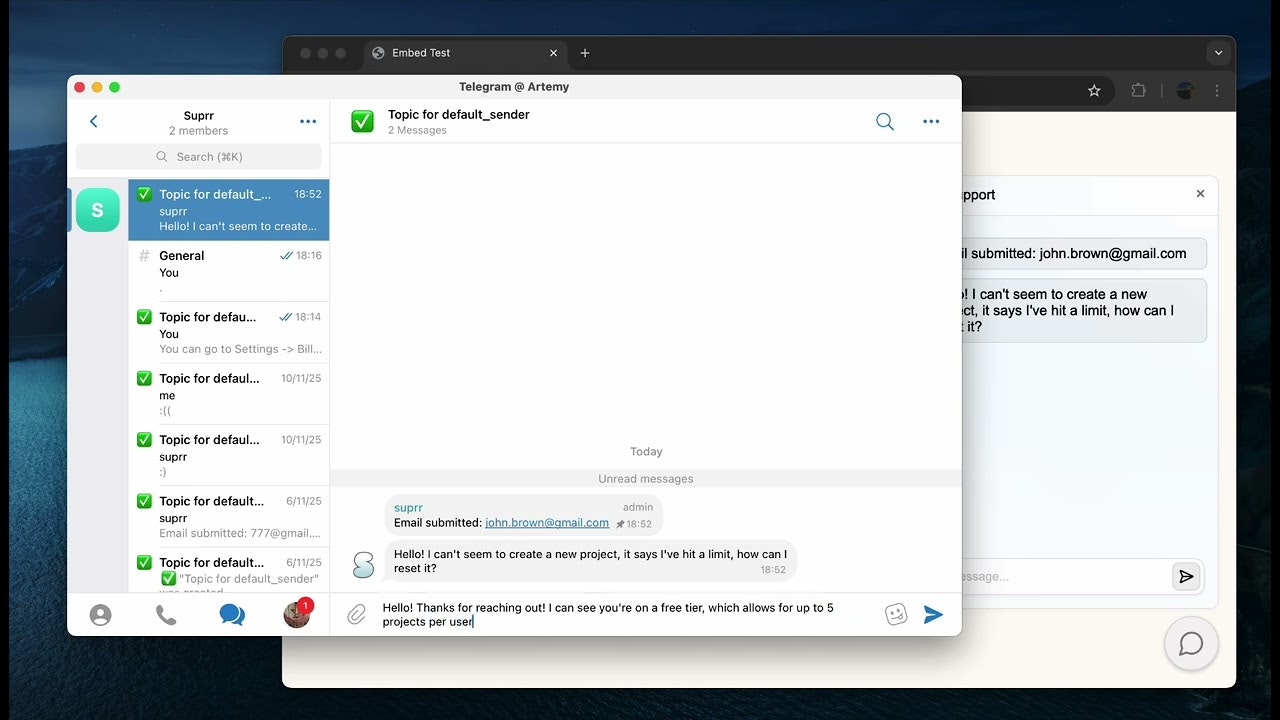 An easy to install customer support bubble for your website that sends customer conversations to your Telegram. Tailored to small teams, respond to your customers’ requests right from Telegram, 5 min to integrate