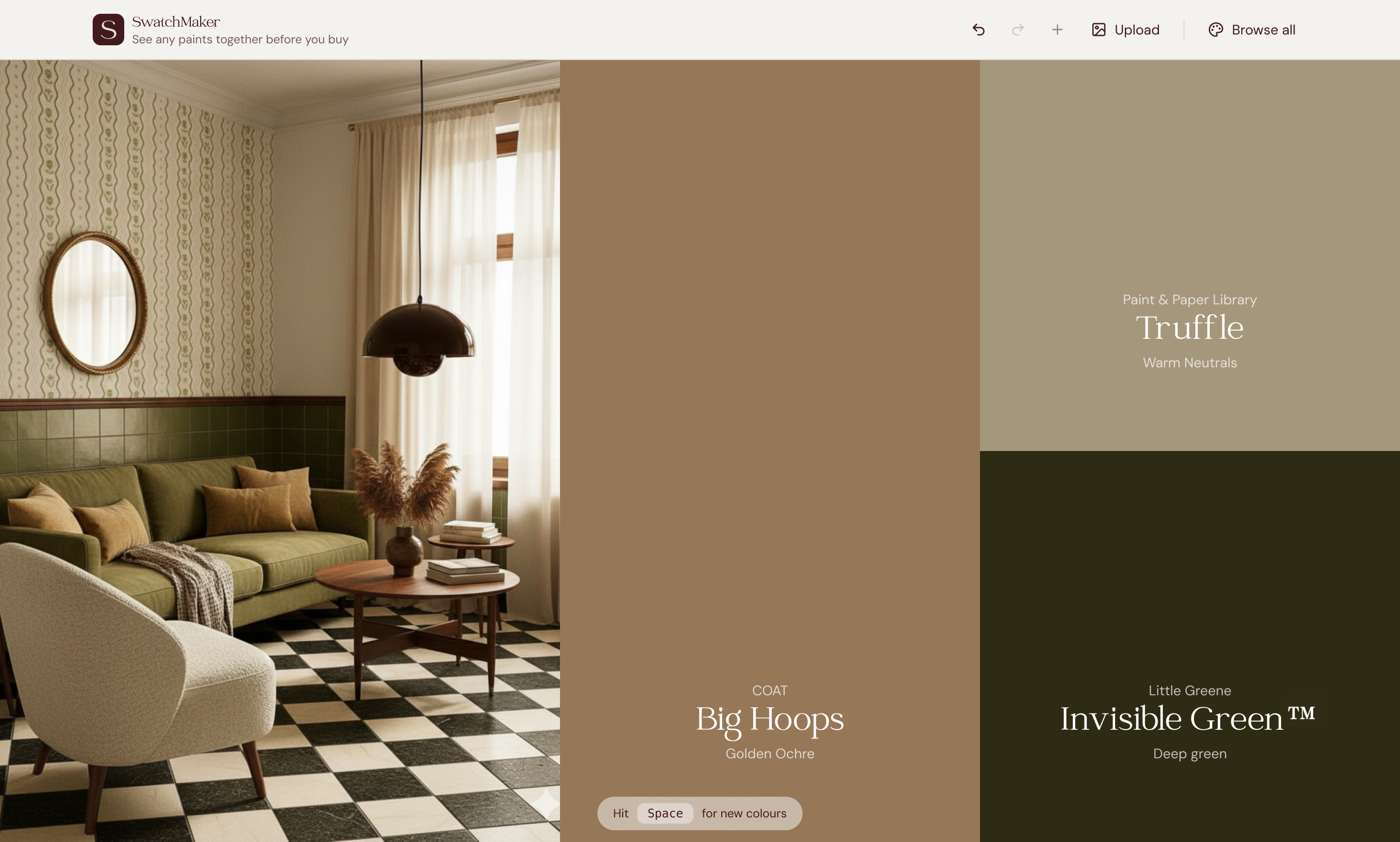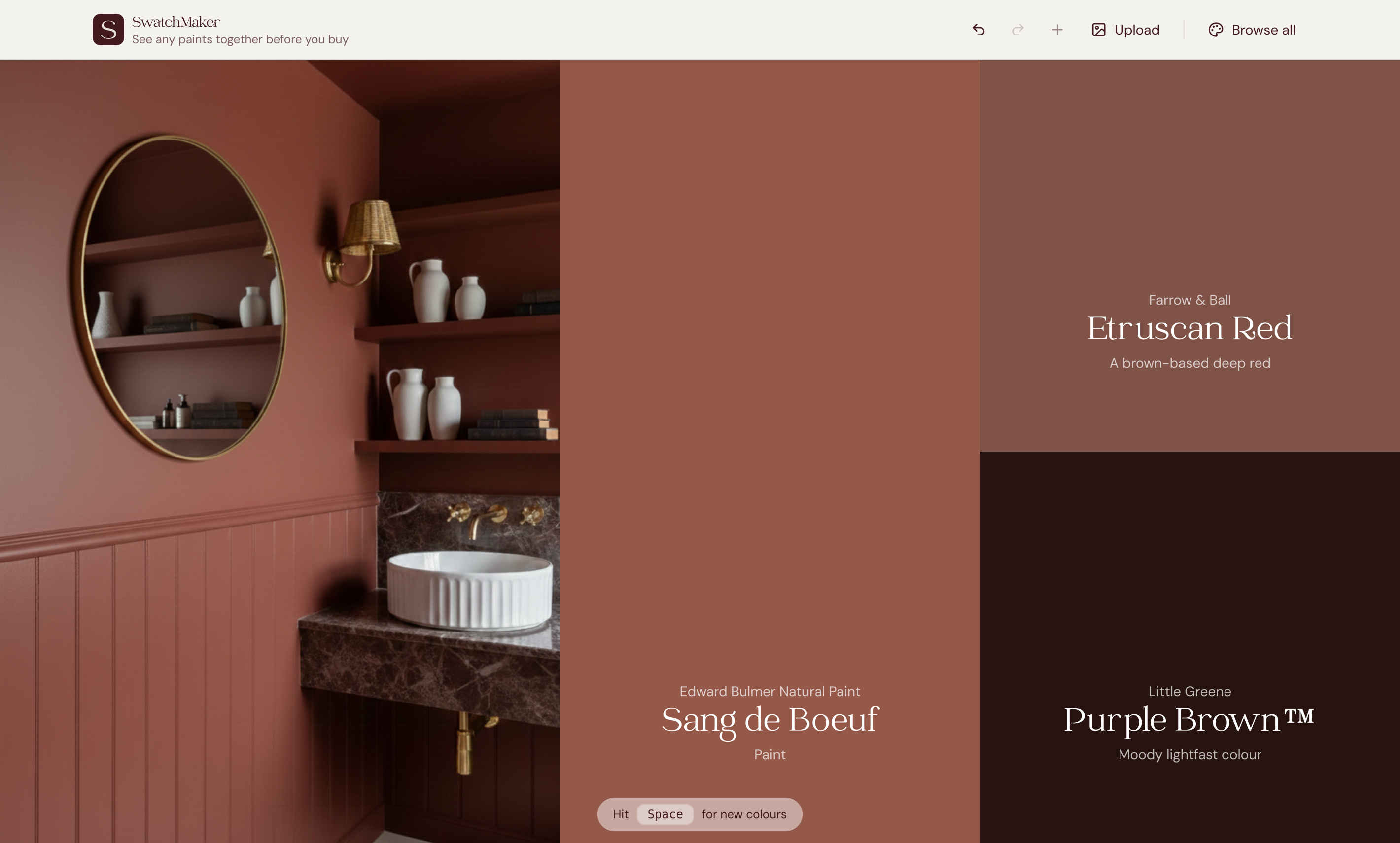 SwatchMaker lets you explore thousands of real paint combinations before you ever leave your sofa. No guessing, no expensive mistakes, no drawer full of sample pots you'll never use. How it works • Hit the space bar to shuffle through random colour combinations from real paint brands • Lock colours you love and find the perfect pairing • Upload any image; wallpaper, a photo, artwork—and we'll match the colours to actual paints from Farrow & Ball, Lick, Paint & Paper Library, and more.