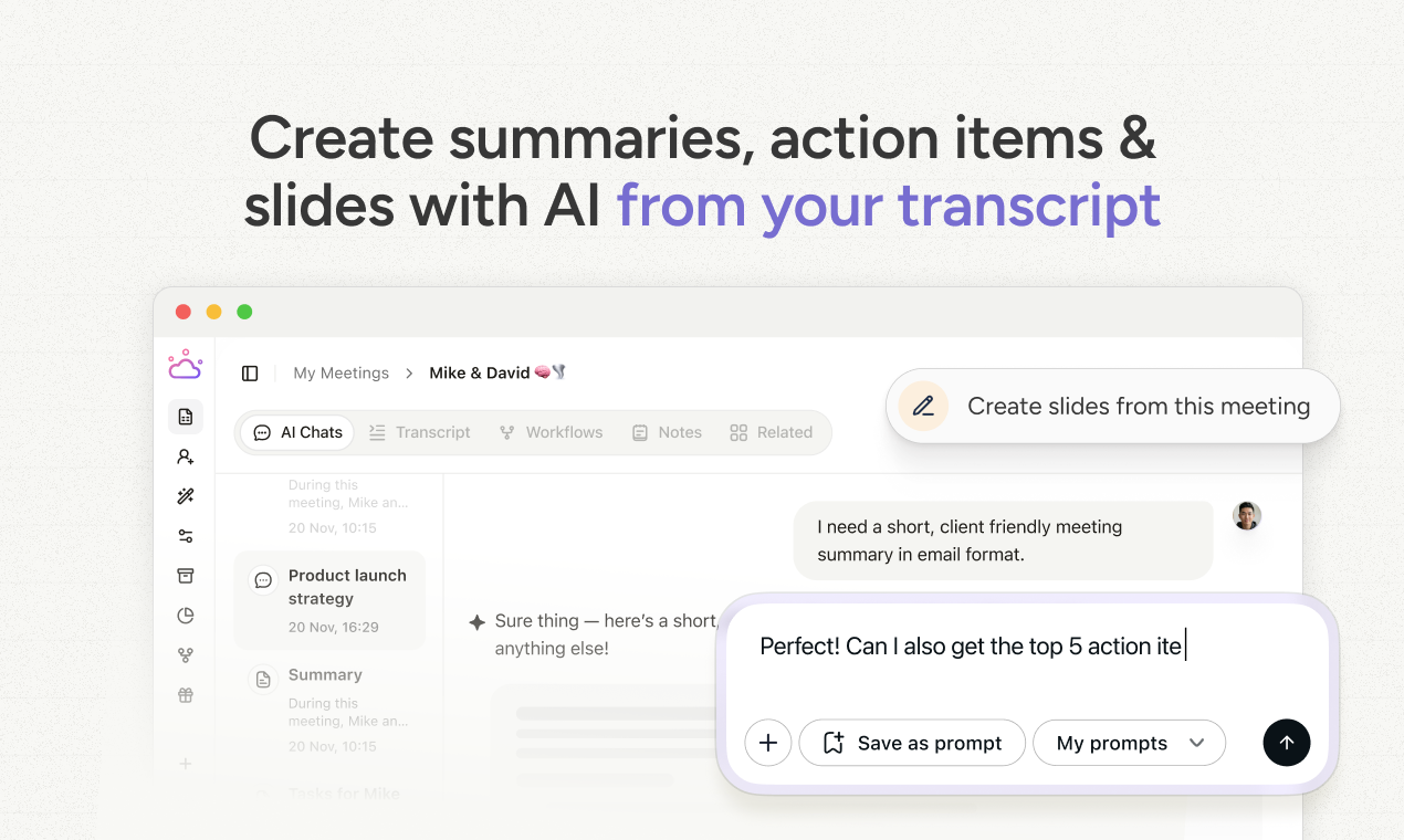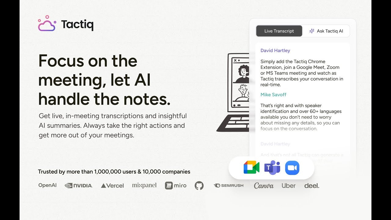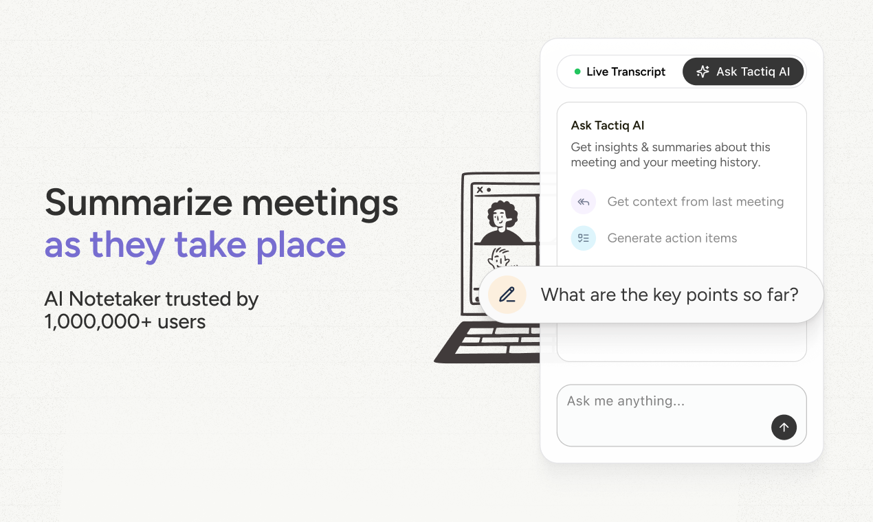 Tactiq 3.0 lets you use AI during meetings to summarize conversations as they take place. Generate summaries and ask smarter questions in real time, assign AI tasks and create slides with Tactiq’s AI Agent.