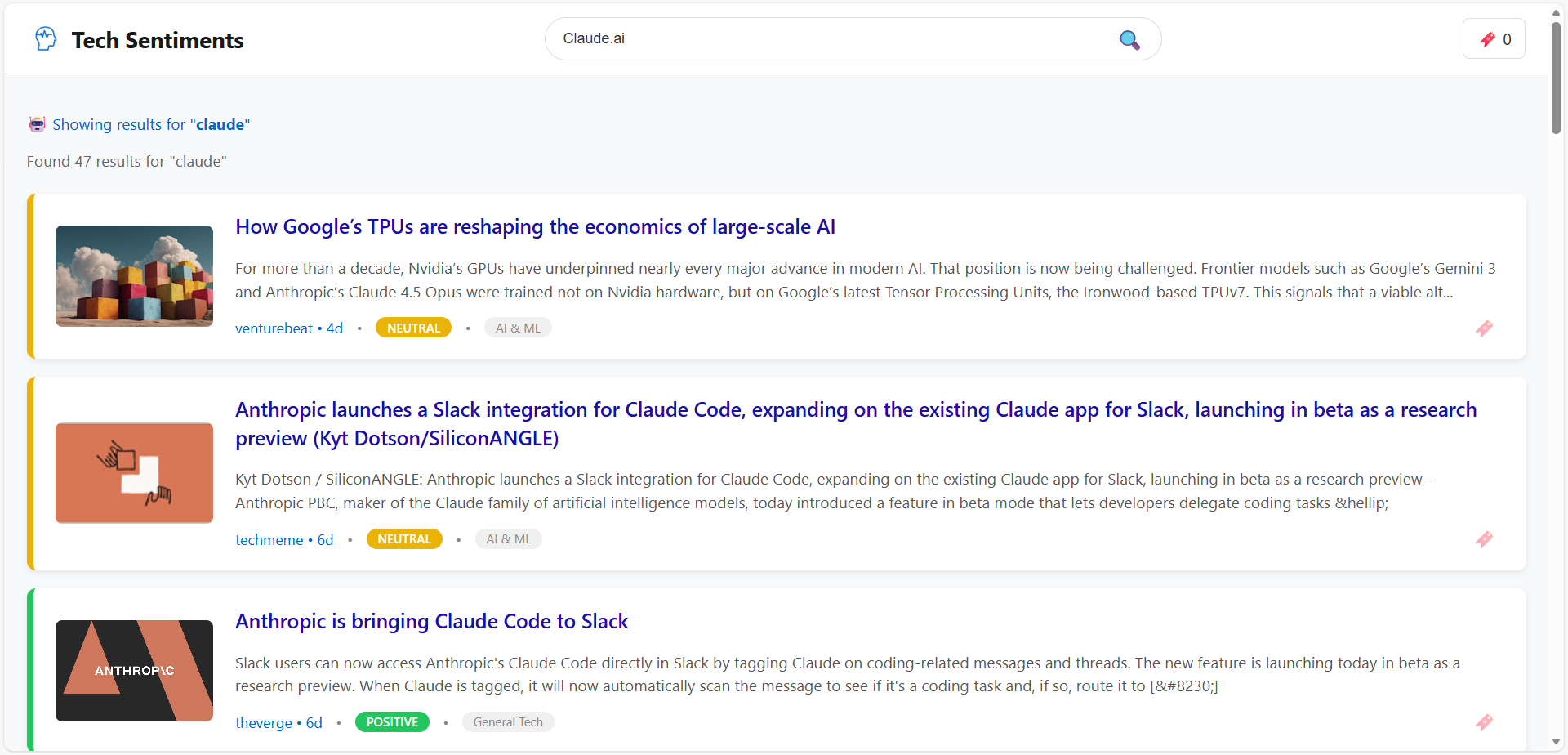 Real-time tech news with AI sentiment analysis. Track Bitcoin, Tesla, Nvidia, OpenAI and more. See if news is positive, negative, or neutral instantly. Track tech news sentiment in real-time., AI-powered search, and instant mood analysis across AI, startups, crypto, and more. See if the market is bullish or bearish at a glance. Free to use.