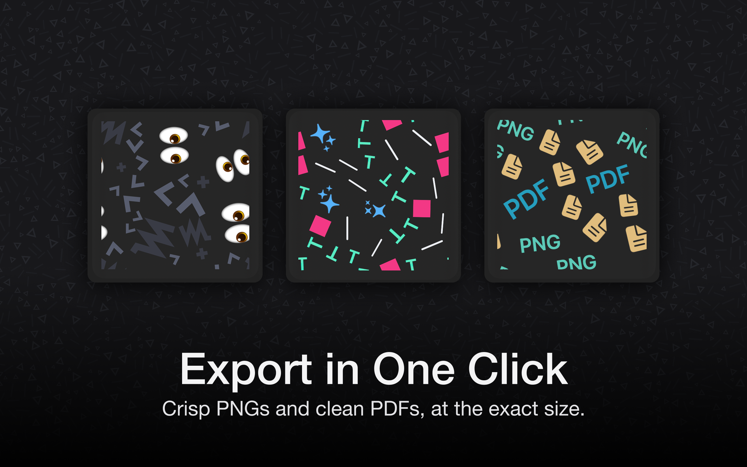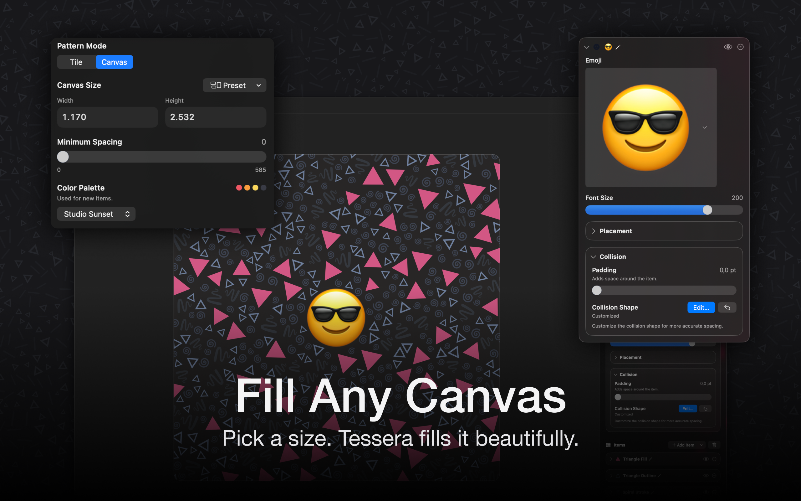 Create seamless tiles and production-ready pattern assets in minutes: pick from a large library of shapes, text, symbols, and more, customize everything to your liking, and let Tessera Designer intelligently lay it out on the canvas. Finally, export clean, seamlessly repeatable patterns that are genuinely fun (and easy) to make.