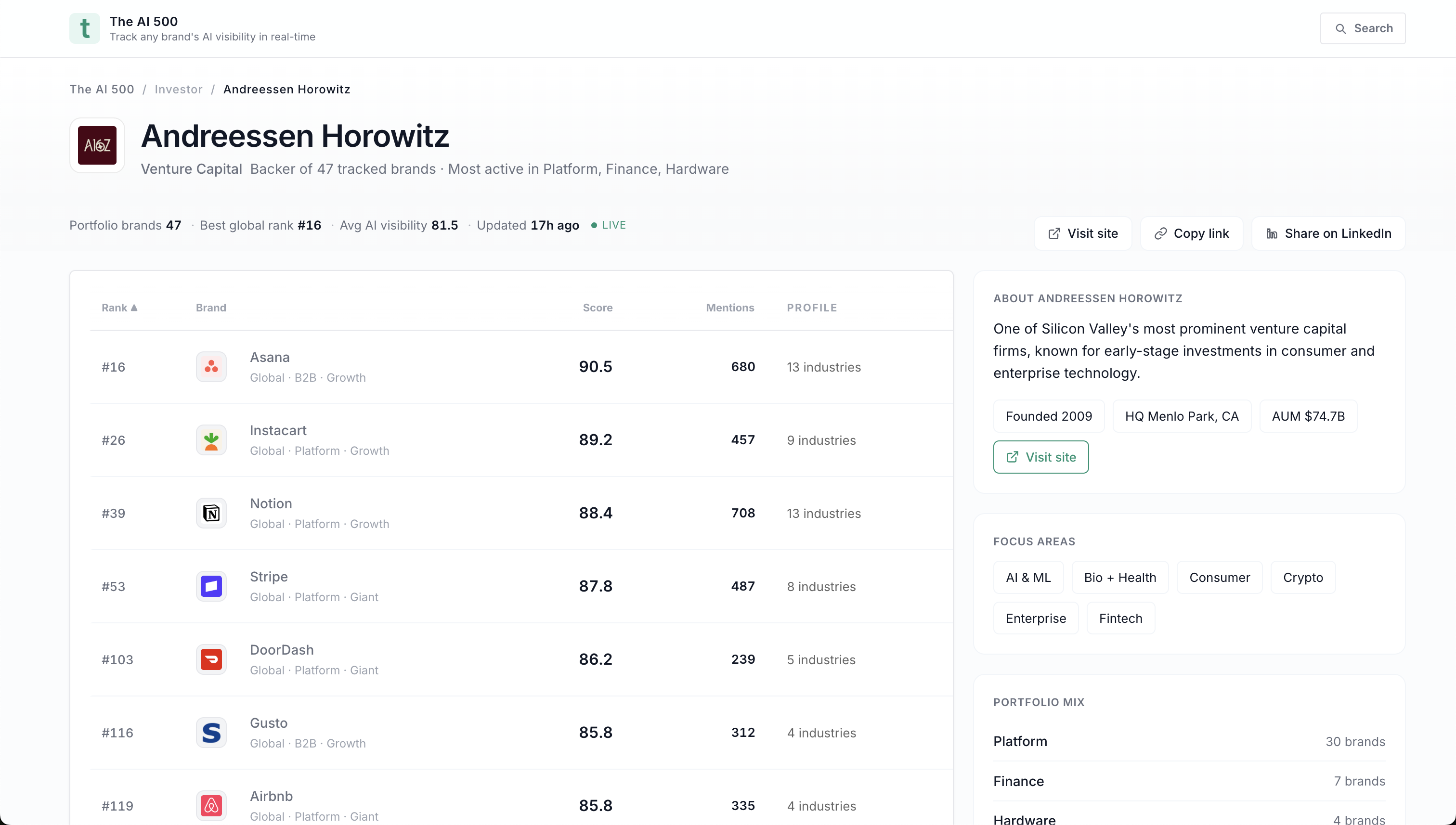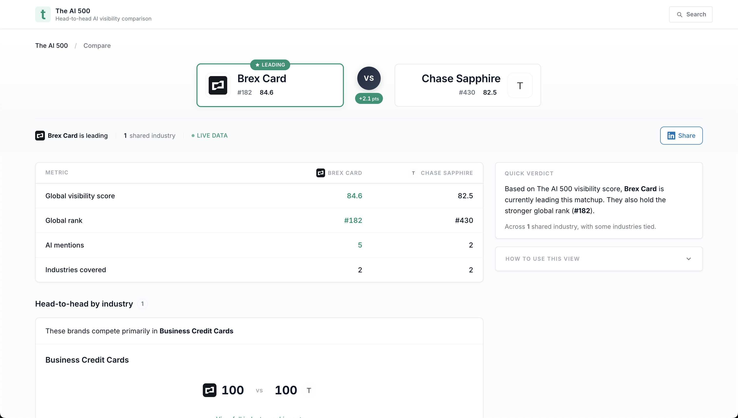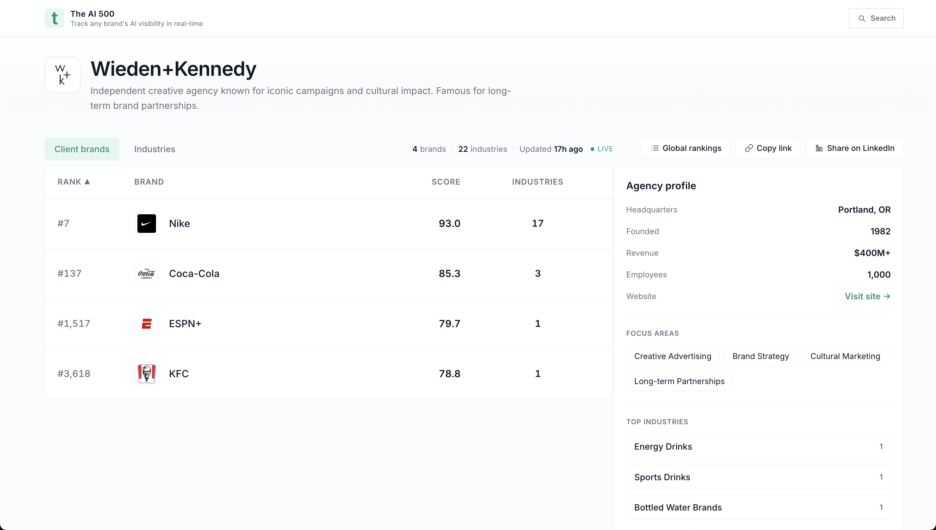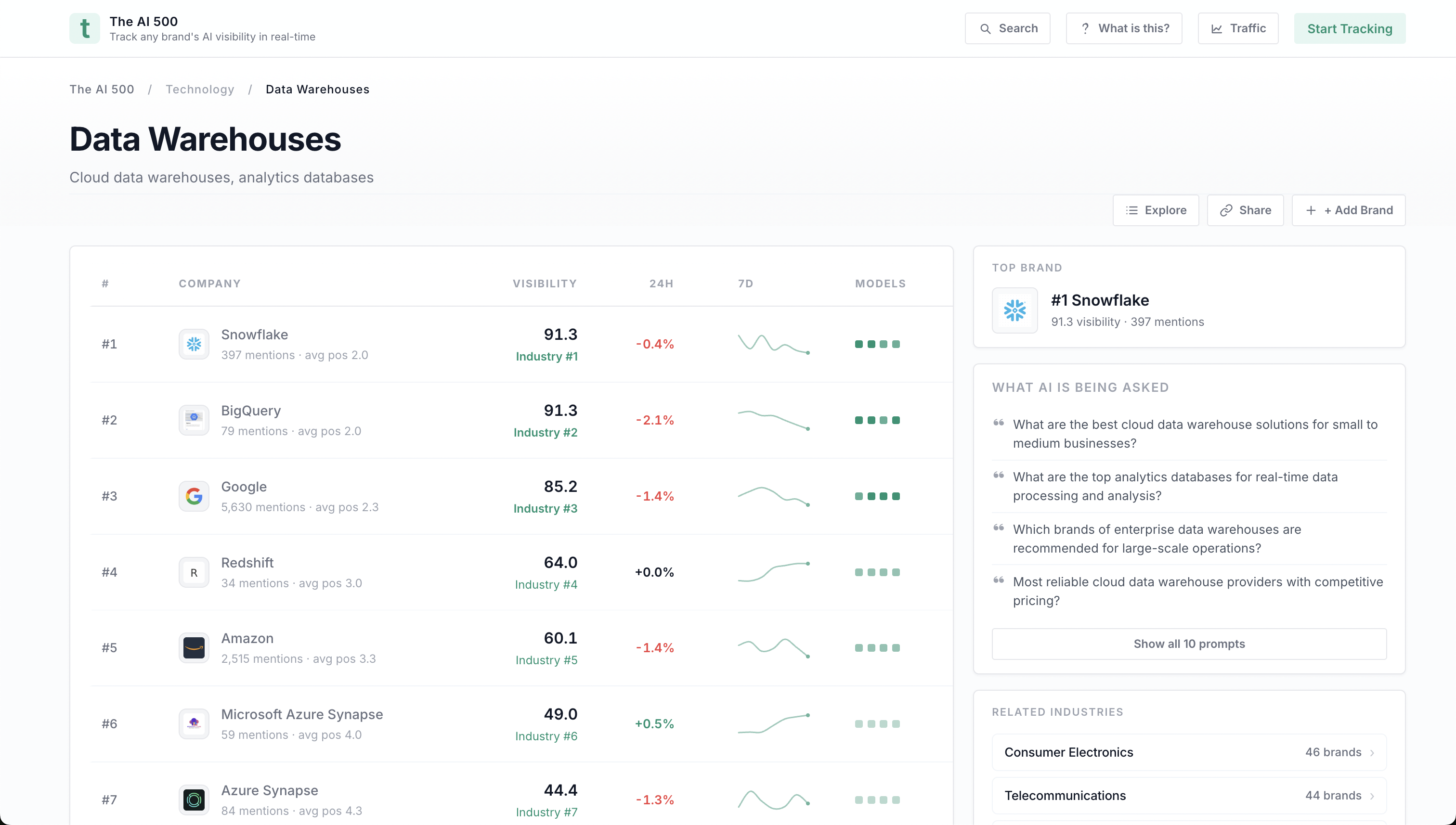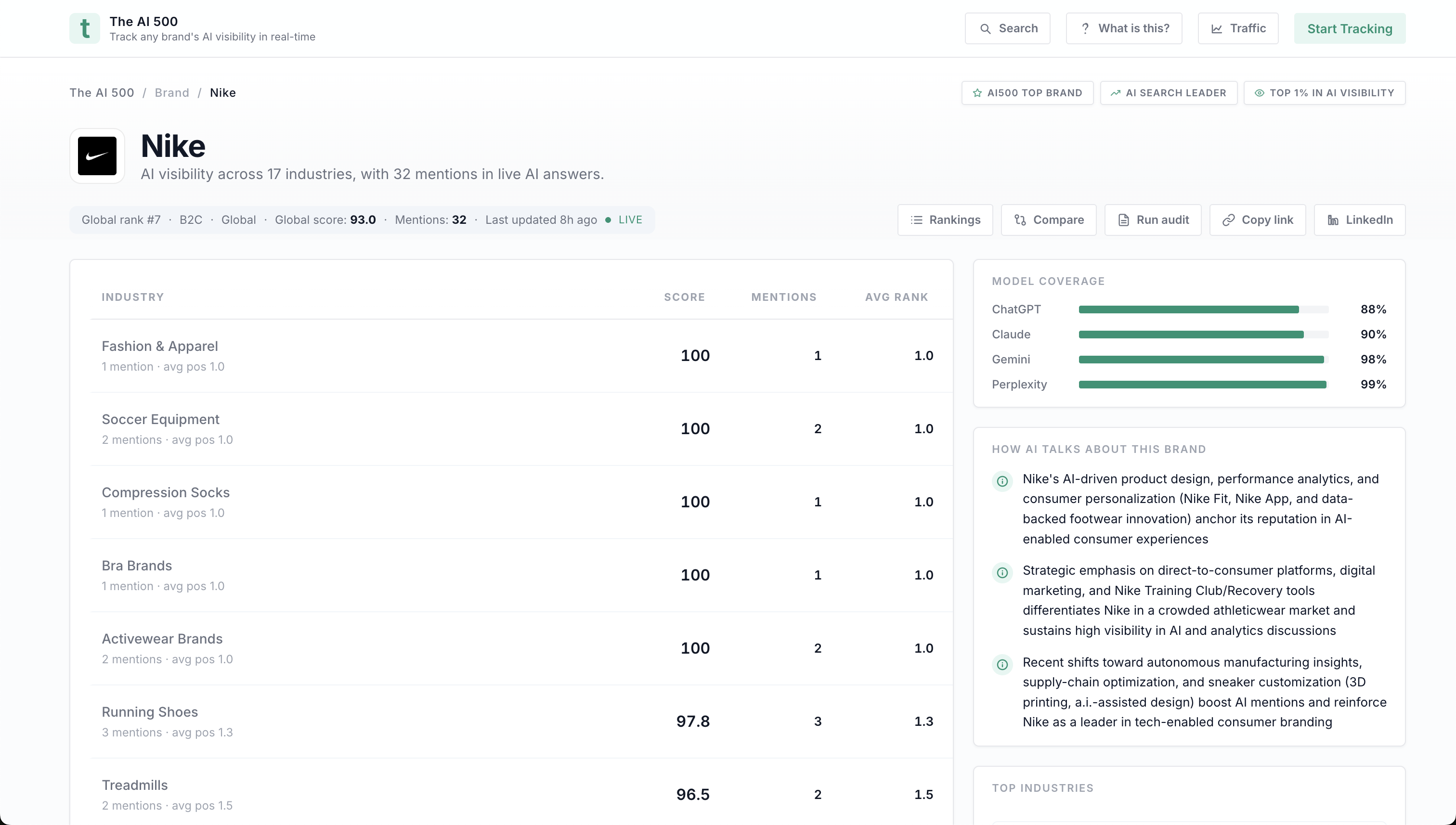 The first public benchmark of AI brand visibility. We query ChatGPT, Claude, Gemini & Perplexity across 500 industries with 5,000+ real prompts to track which brands get recommended. Like the S&P 500, but for AI. • 15,000+ brands ranked • 500 industries covered • Updated daily • Model disagreement analysis • Compare any two brands head-to-head See where you rank before your competitors do.