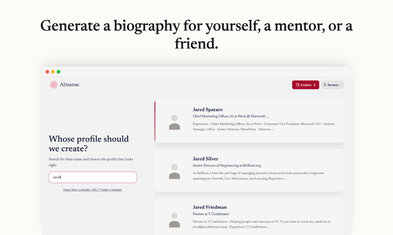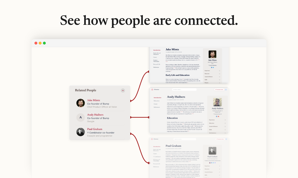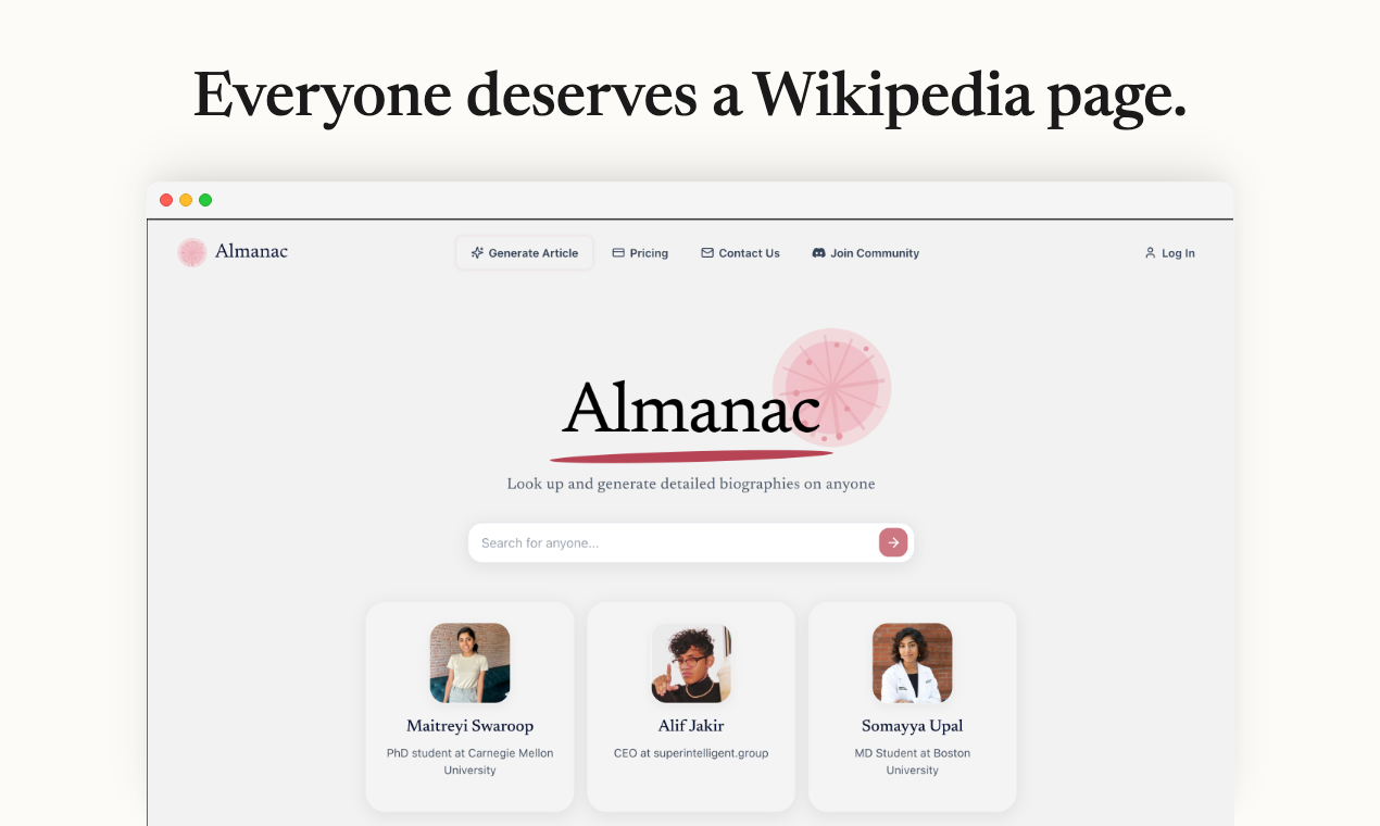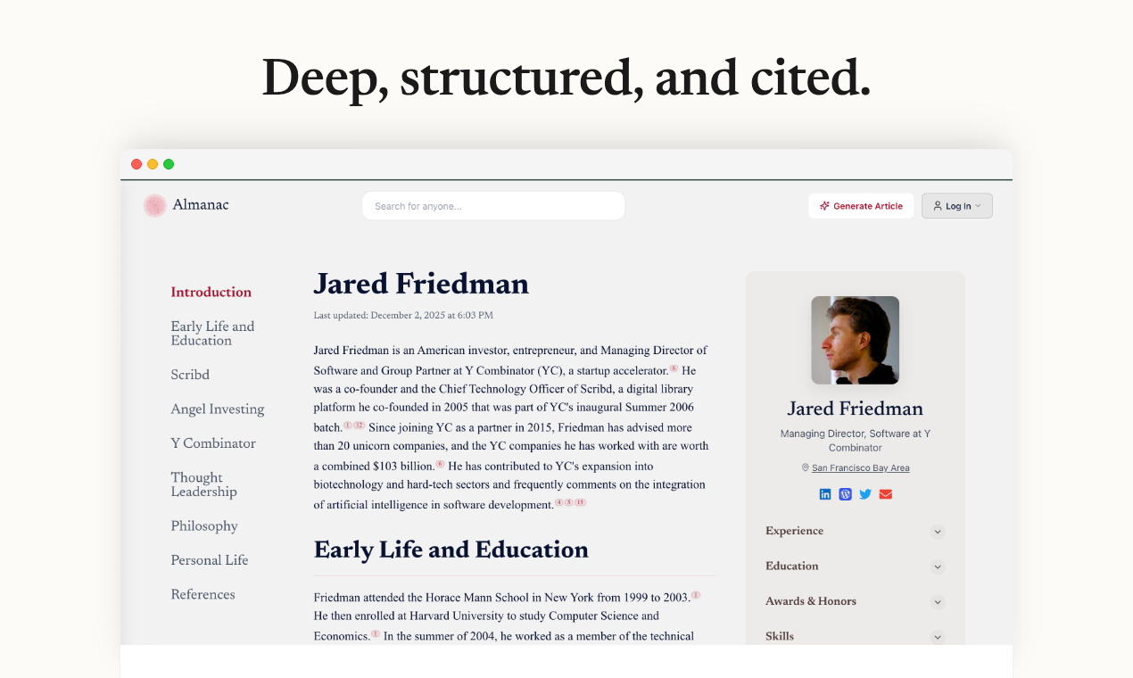 Almanac lets you type any name and instantly see a professional, public-facing profile for that person. Search yourself or anyone else, if the profile does not exist yet, you can generate it in <10s. We crawl the public web, reconcile sources, and writes a detailed, neutral biography with a profile card, timeline, and key highlights. The related-people section links connections to other people so you can quickly see how everyone is connected. Share your Almanac page as your go-to bio link.