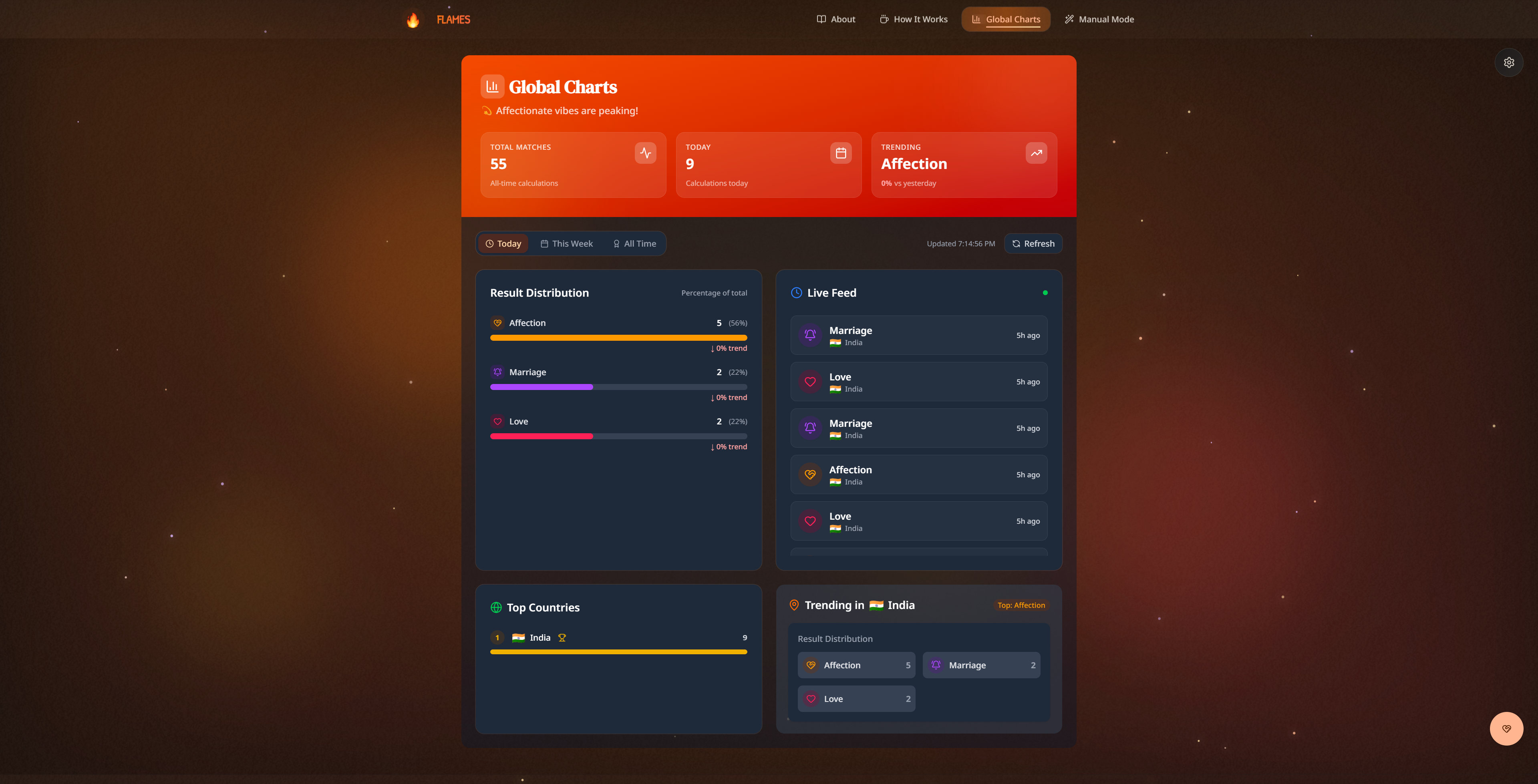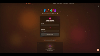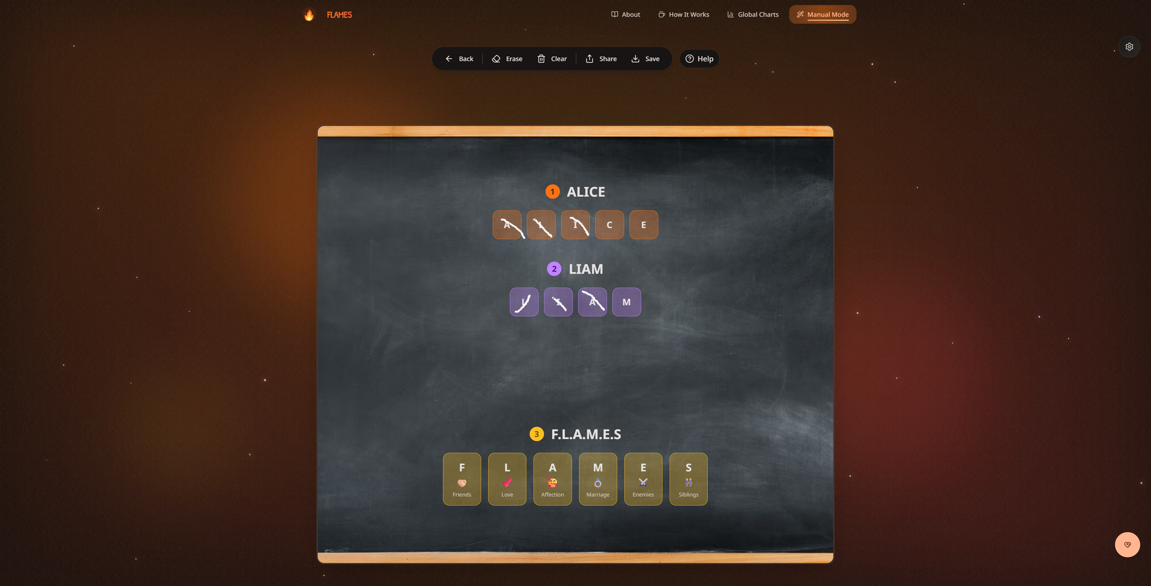 A modern, interactive reimagining of the classic FLAMES game—beautiful animations, manual mode for the paper-and-pencil feel, global charts, and easy sharing. Pure nostalgia. Zero scientific validity.