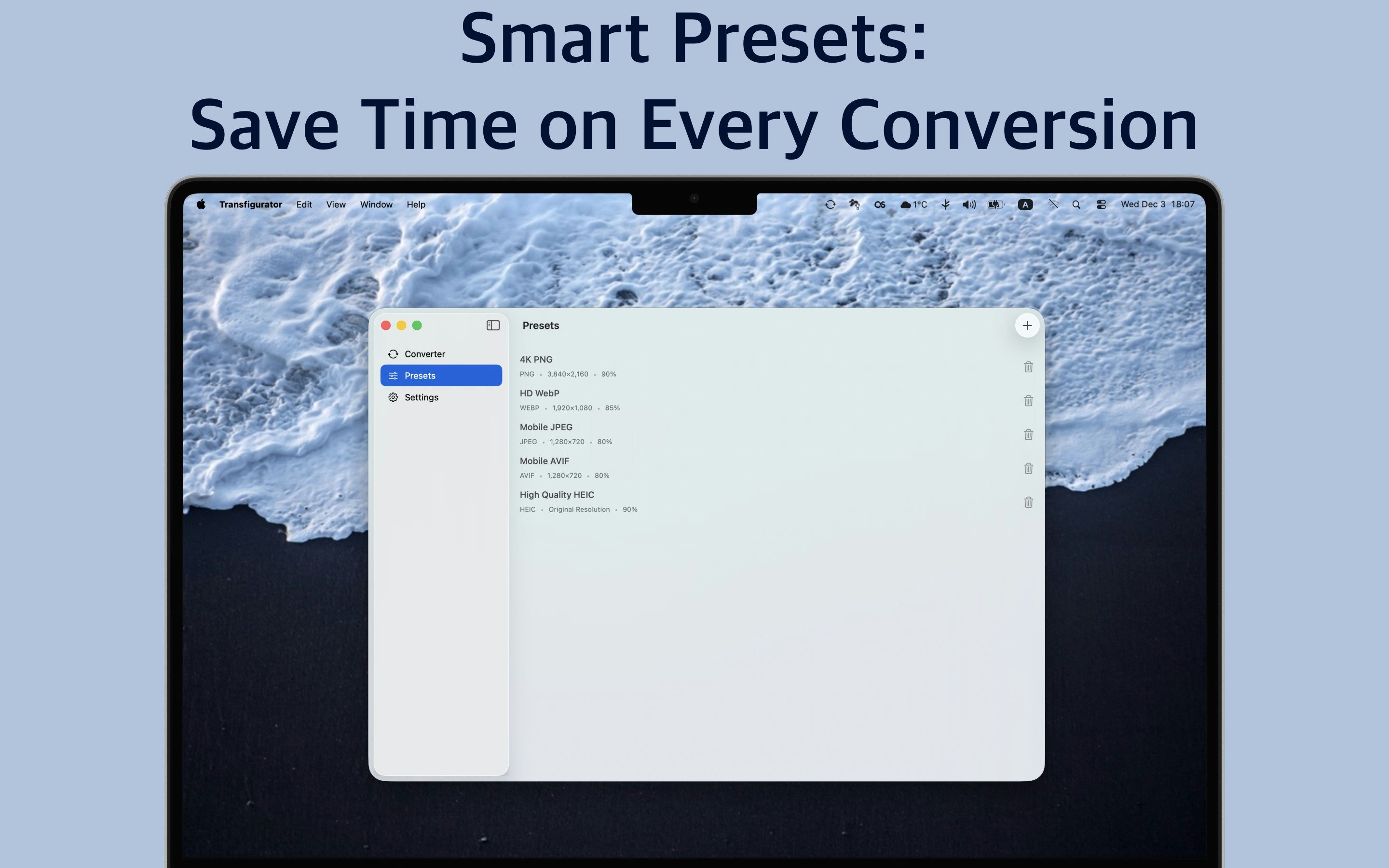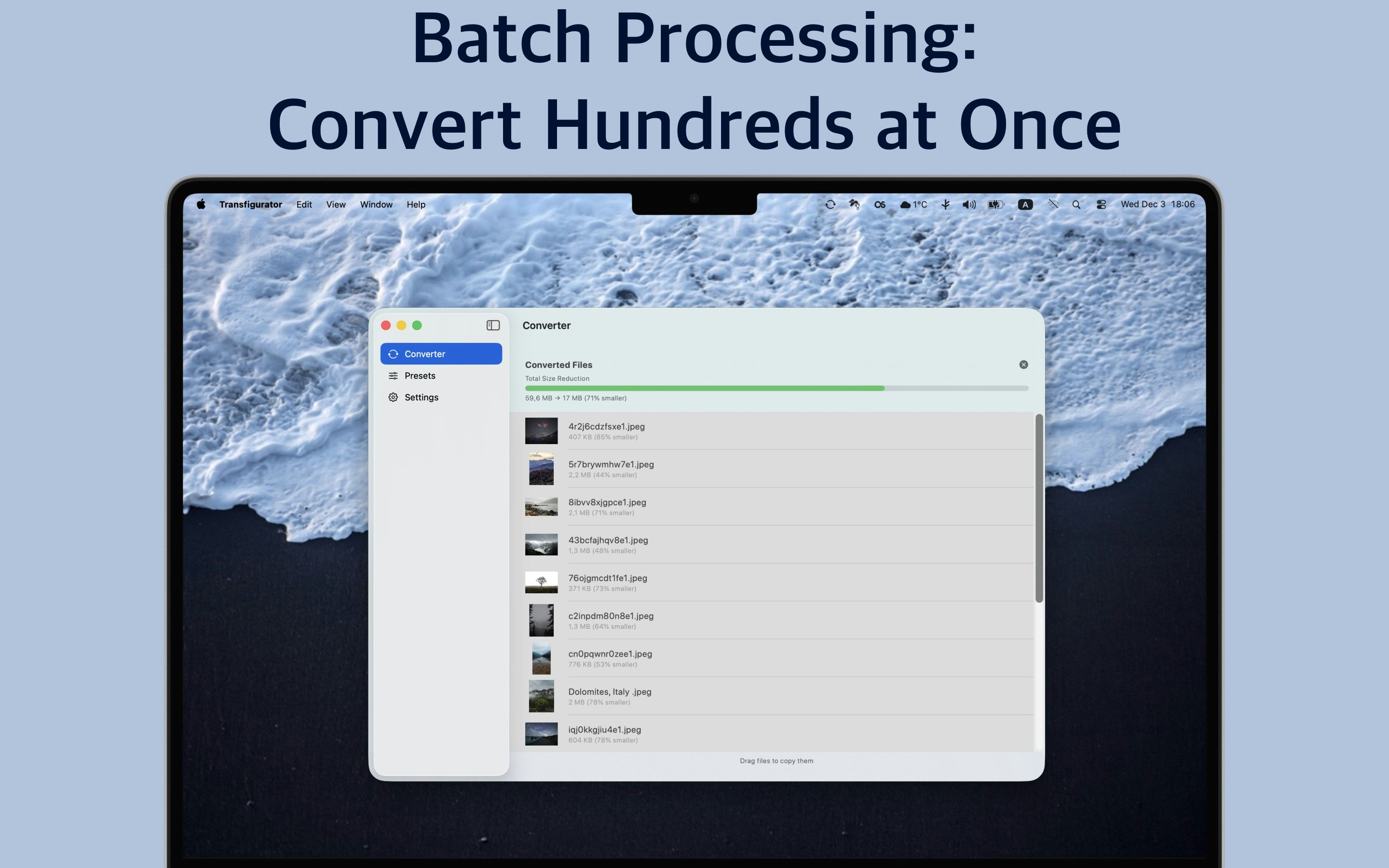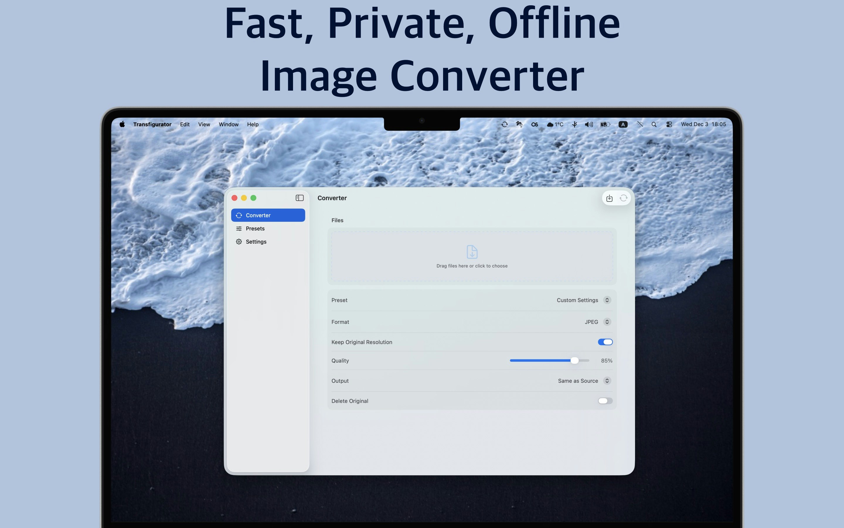 100% local processing - your images never leave your Mac. No internet, no cloud, no data transmission. Complete privacy with lightning-fast batch conversion, custom presets, and support for modern formats like AVIF and WebP. One-time purchase, no subscriptions.