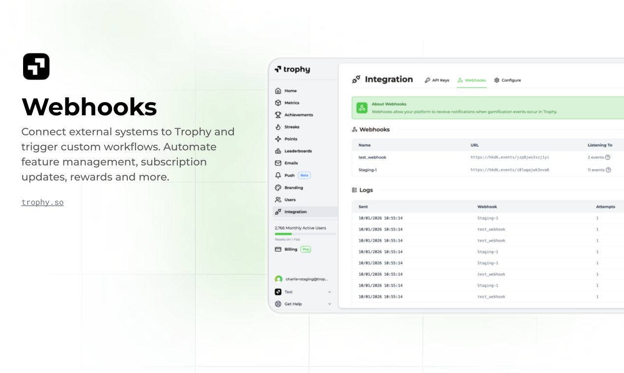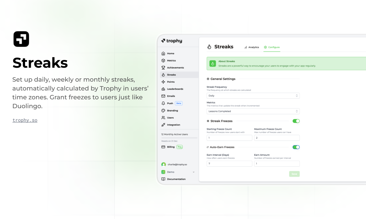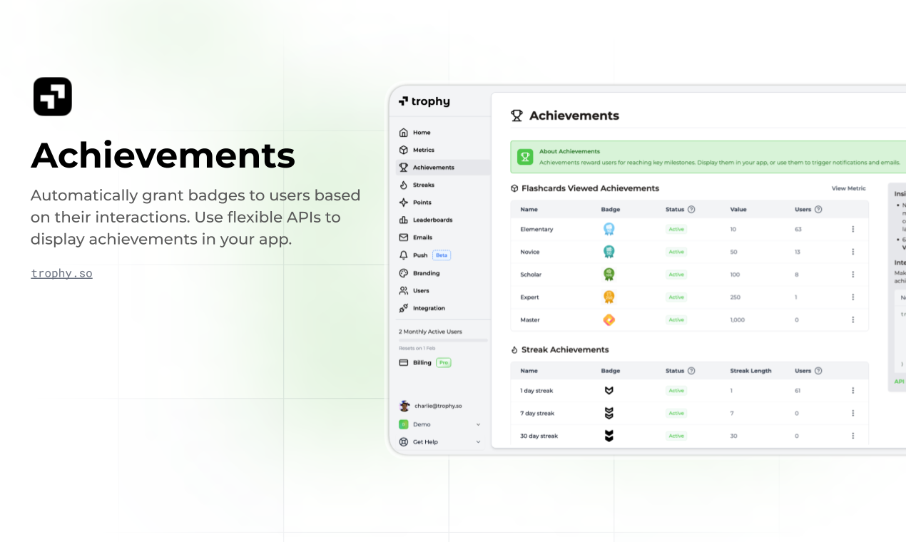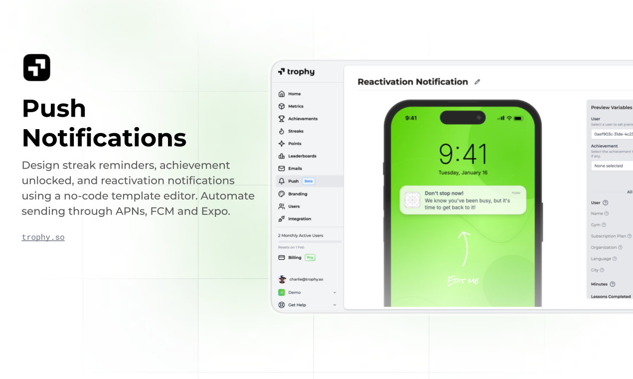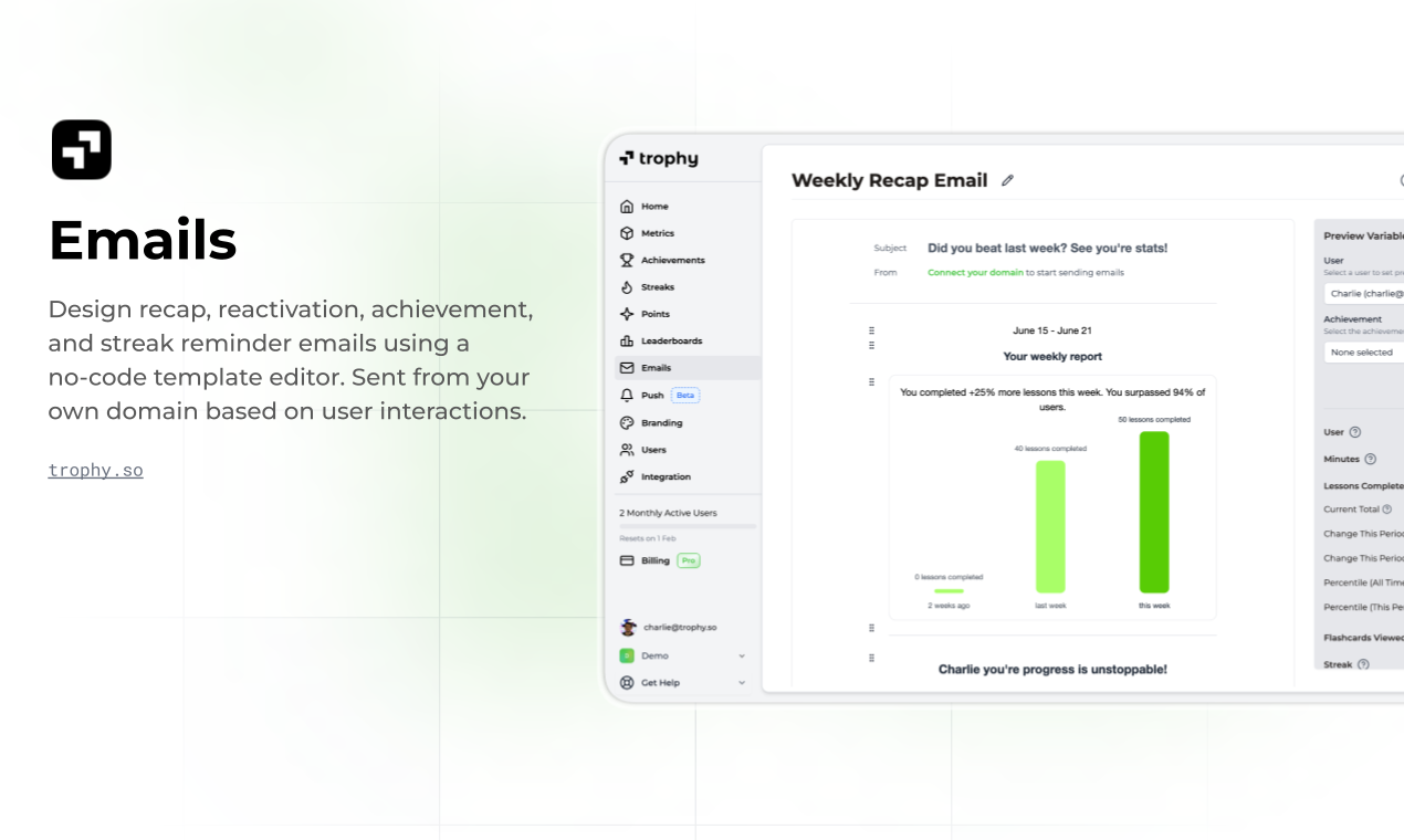 Ship gamification fast with flexible APIs for achievements, streaks, points, and leaderboards. Configure features without coding, automate personalized email and push notifications, and monitor impact on retention and engagement from a dashboard.
