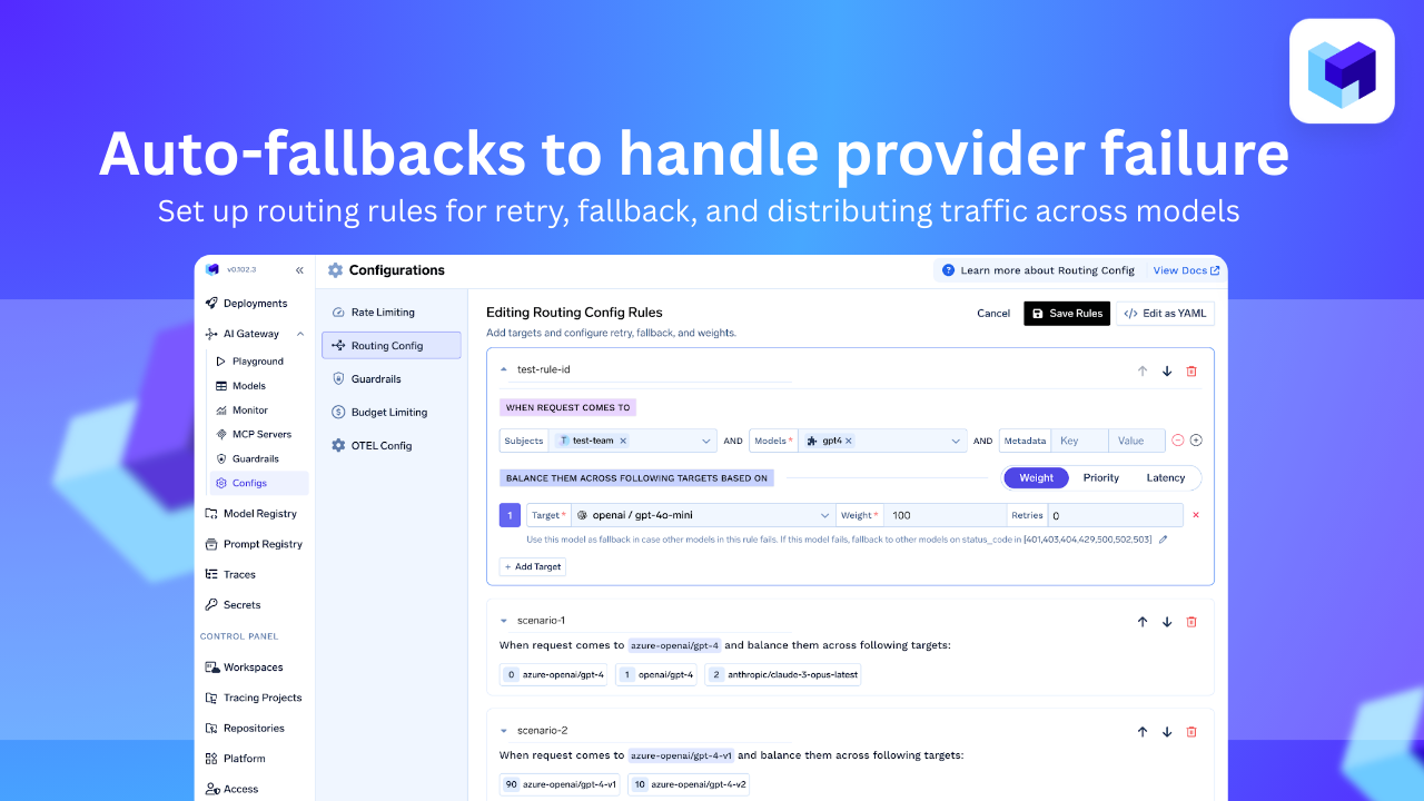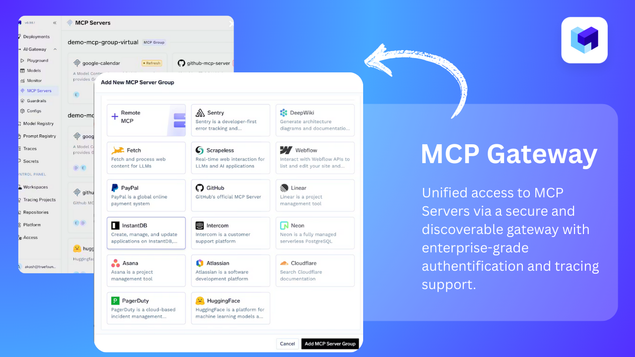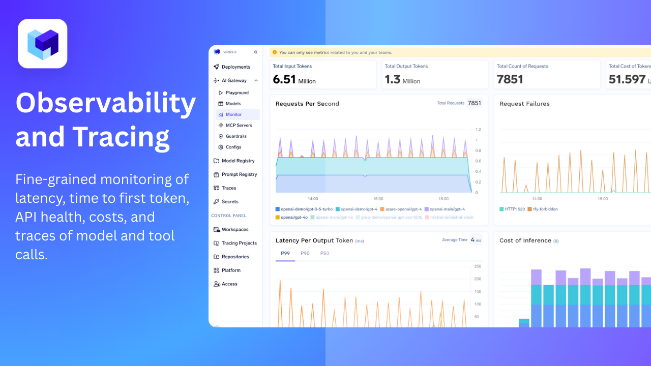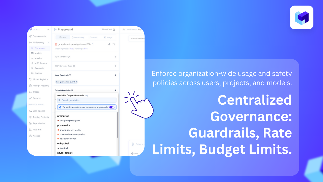 TrueFoundry’s AI Gateway is the production-ready, control plane to experiment with, monitor and govern your agents. Experiment with connecting all agent components together (Models, MCP, Guardrails, Prompts & Agents) in the playground. Maintain complete visibility over responses with traces and health metrics. Govern by setting up rules/limits on request volumes, cost, response content (Guardrails) and more. Being used in production for 1000s of agents by multiple F100 companies!