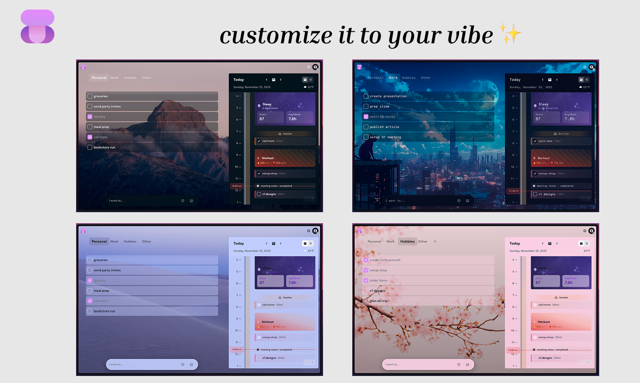 tsk is a personal task manager i started building for myself with a friend. finally decided to finish and publish it - free and open source for anyone to use. the goal of tsk is to show you a holistic view of your day - not just meetings, but tasks, focus blocks, activities, and screen time. it's also local-first, so everything is instant, works offline, and syncs across devices. check it out and tsk.lol - would love to hear your feedback!
