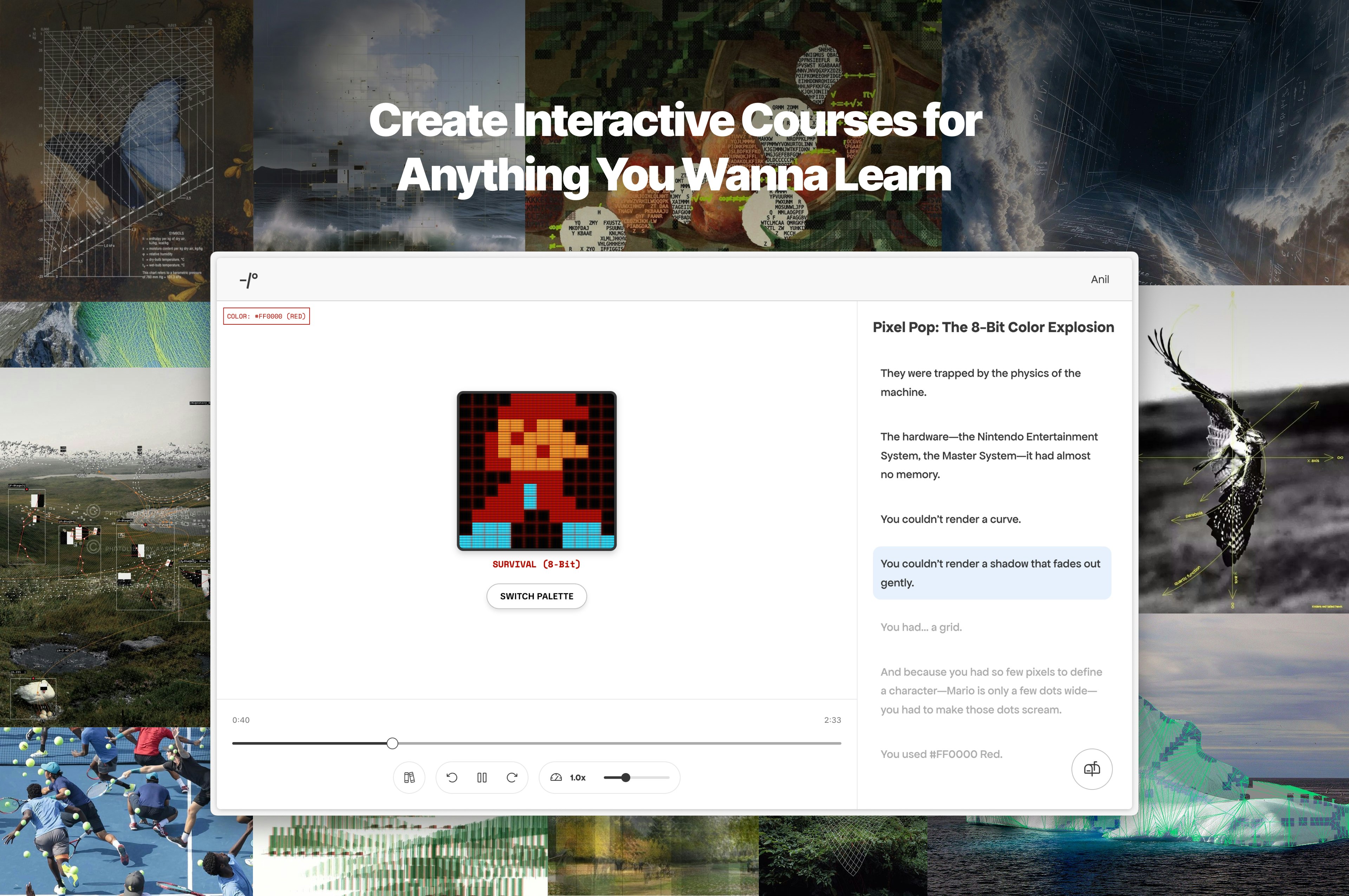 (try it out: its free) unfold creates animated courses on any topic and you can interact with it. it asks you questions to understand you, what you want to learn and how you learn best.