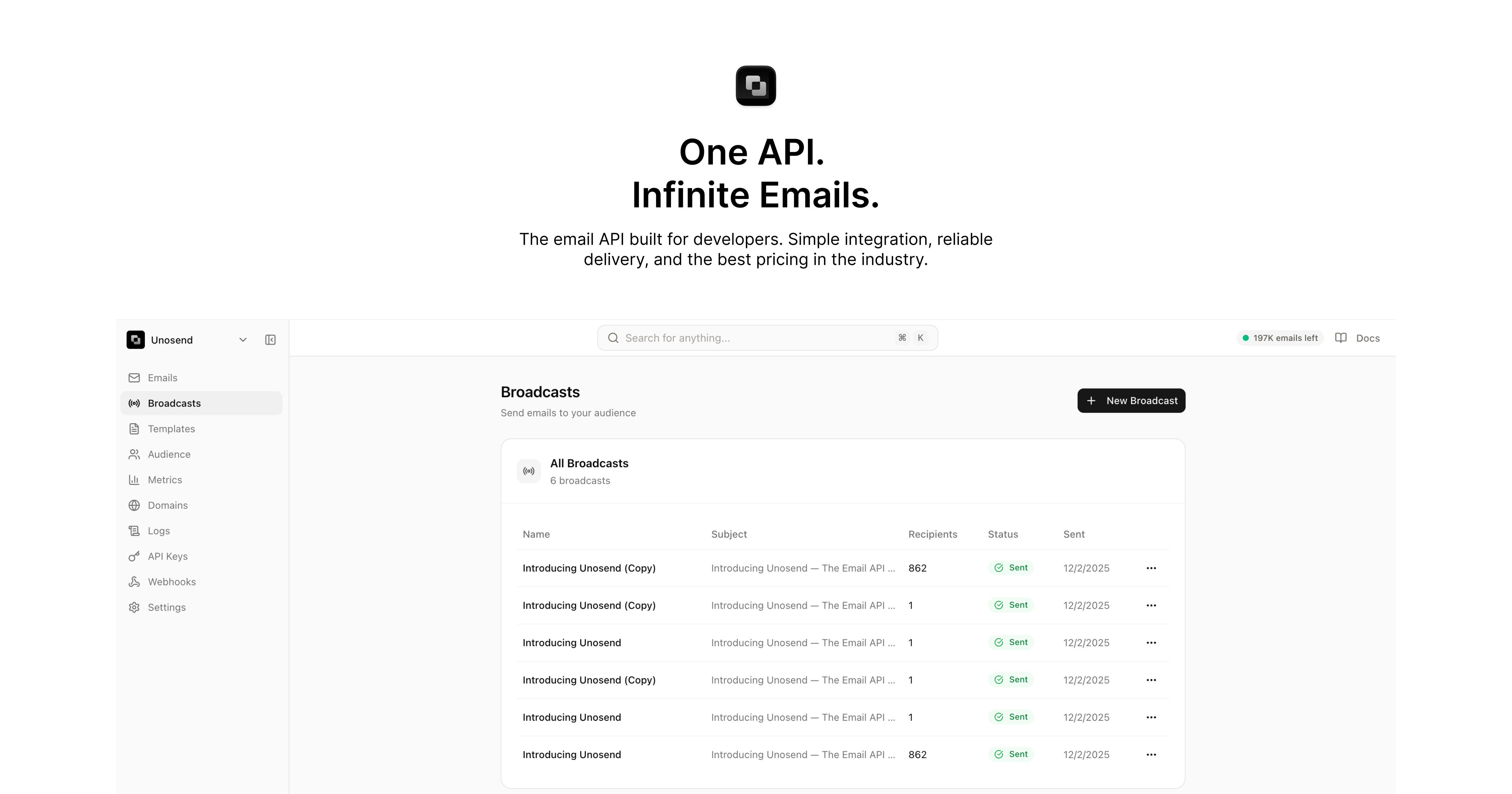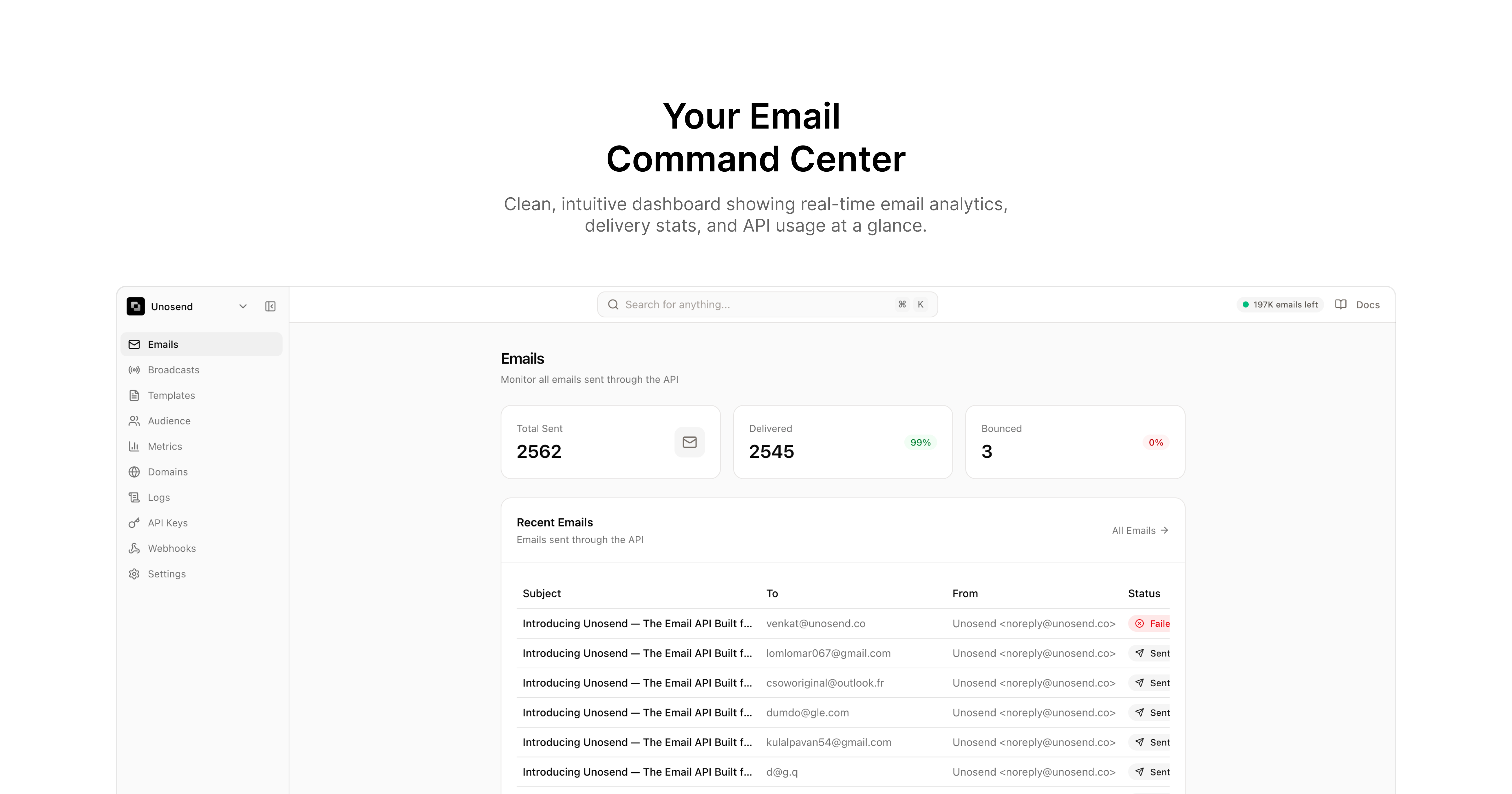 The best email API for developers. Send transactional and marketing emails with 99.9% deliverability. Simple REST API, competitive pricing, and 5,000 free emails/month. Better than Resend & SendGrid. Start free today.