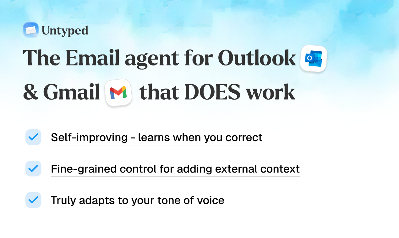 Win back hours a day with the most flexible AI agent for Gmail and Outlook. Trained on your entire email history and running inside your inbox in one click. Main features: - Drafts reply in your tone - AI auto-categorization for better organization - Keeps improving and learning on your feedback - Custom knowledgebase for fine-grained context engineering Start your 7-day free trial today 🚀